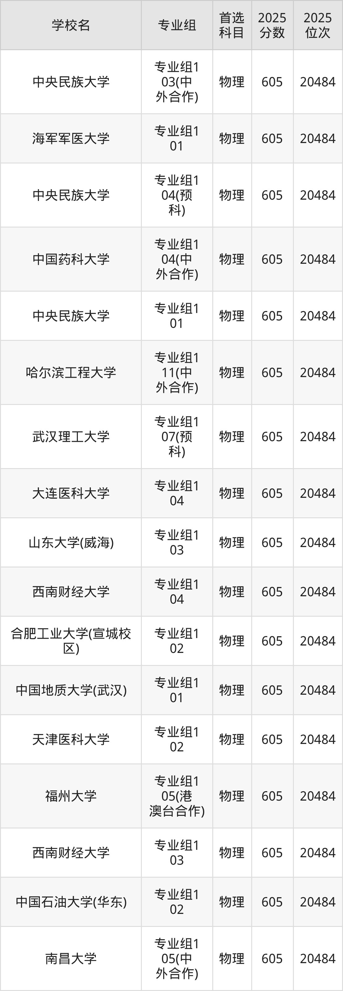 物理类606分可以冲的大学:西南交通大学608分、北京电影学院608分、广西医科大学608分、暨南大学608分等;较稳妥的大学:中央民族大学605分、海军军医大学605分、中国药科大学605分、哈尔滨工程大学605分等。