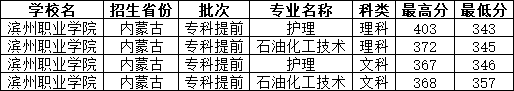 2024年滨州职业学院在内蒙古招定向士官的分数范围在343分-403分之间,其中理科最低分为343分(护理);文科最低分为346分(护理)。