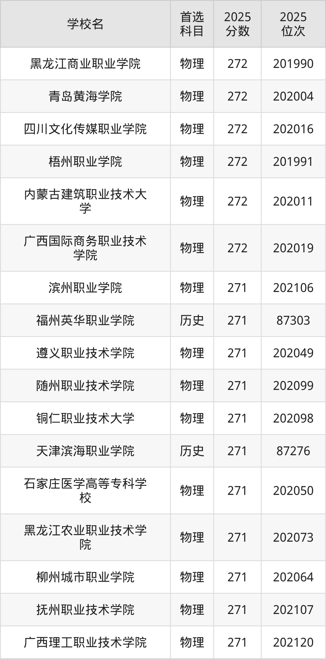 2025年在贵州高考物理类录取分数线是272分的大学有大庆职业学院、泉州海洋职业学院、绵阳飞行职业学院、宝鸡中北职业学院、黑龙江商业职业学院、青岛黄海学院、四川文化传媒职业学院、梧州职业学院、内蒙古建筑职业技术大学、广西国际商务职业技术学院。历史类录取分数线是272分的大学有广西工业职业技术学院、阳泉师范高等专科学校。