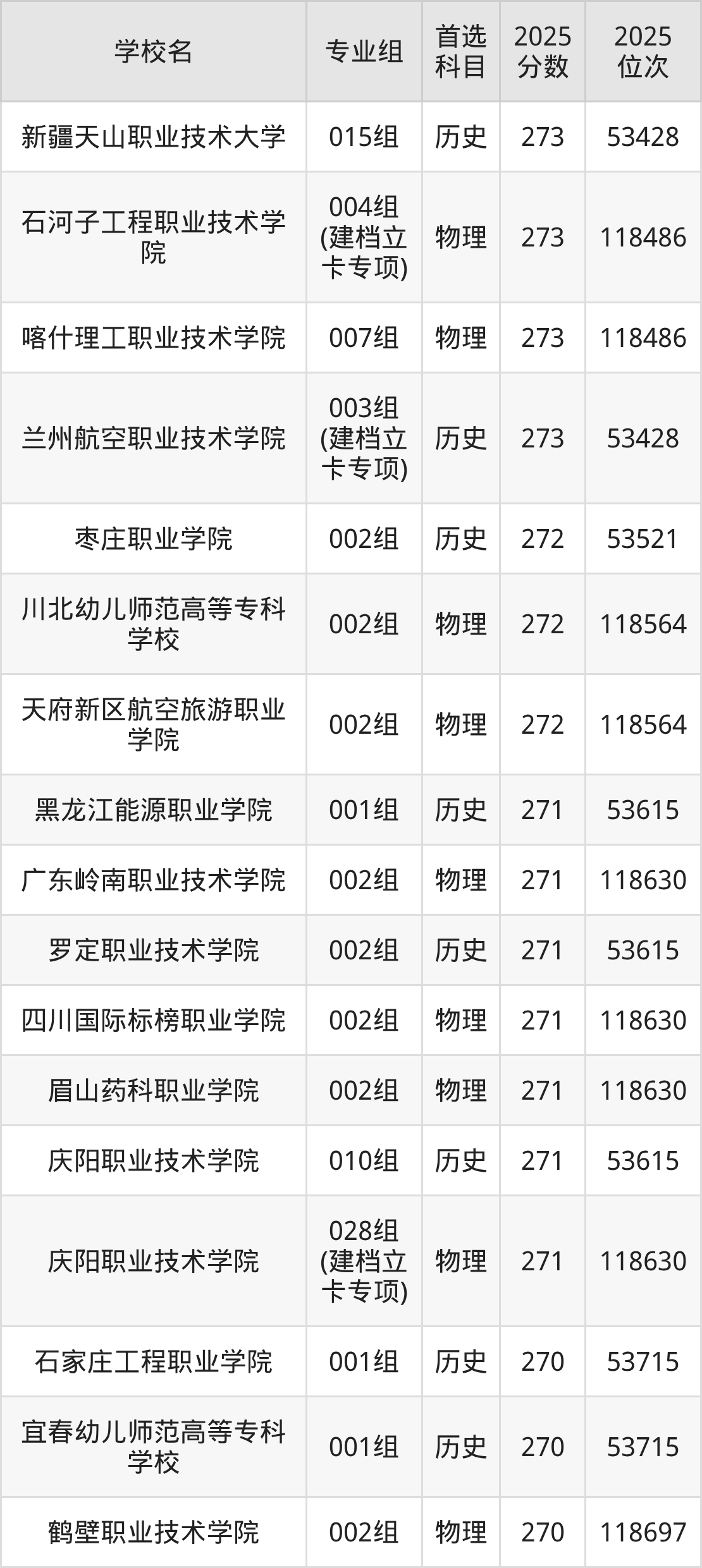 2025年在甘肃高考历史类录取分数线是272分的大学有枣庄职业学院。物理类录取分数线是272分的大学有川北幼儿师范高等专科学校、天府新区航空旅游职业学院。