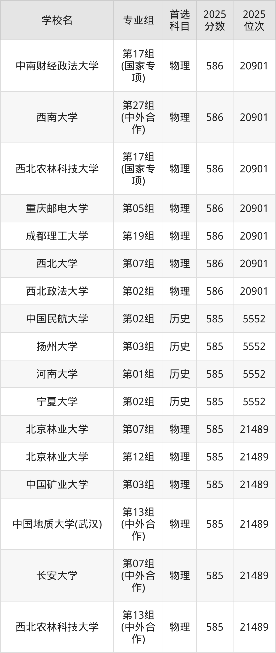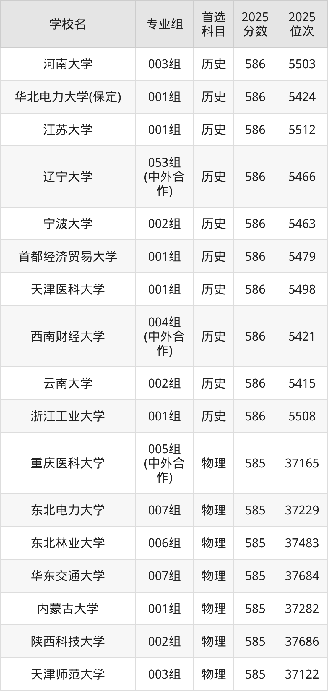 历史类584分可以冲的大学:东北林业大学586分、海南大学586分、河南大学586分、华北电力大学(保定)586分等;较稳妥的大学:福建师范大学583分、江西财经大学583分、南京中医药大学583分、上海海洋大学583分等。