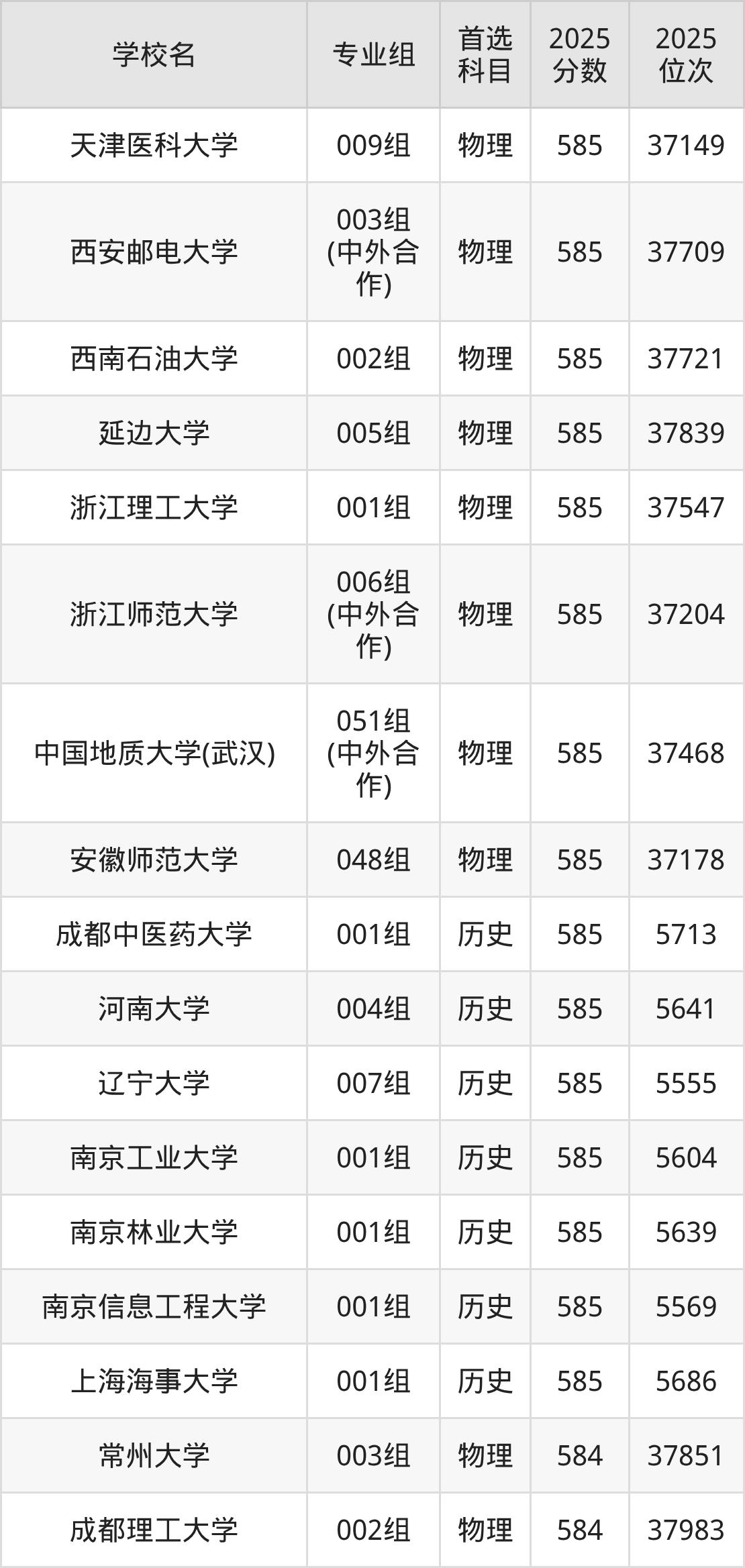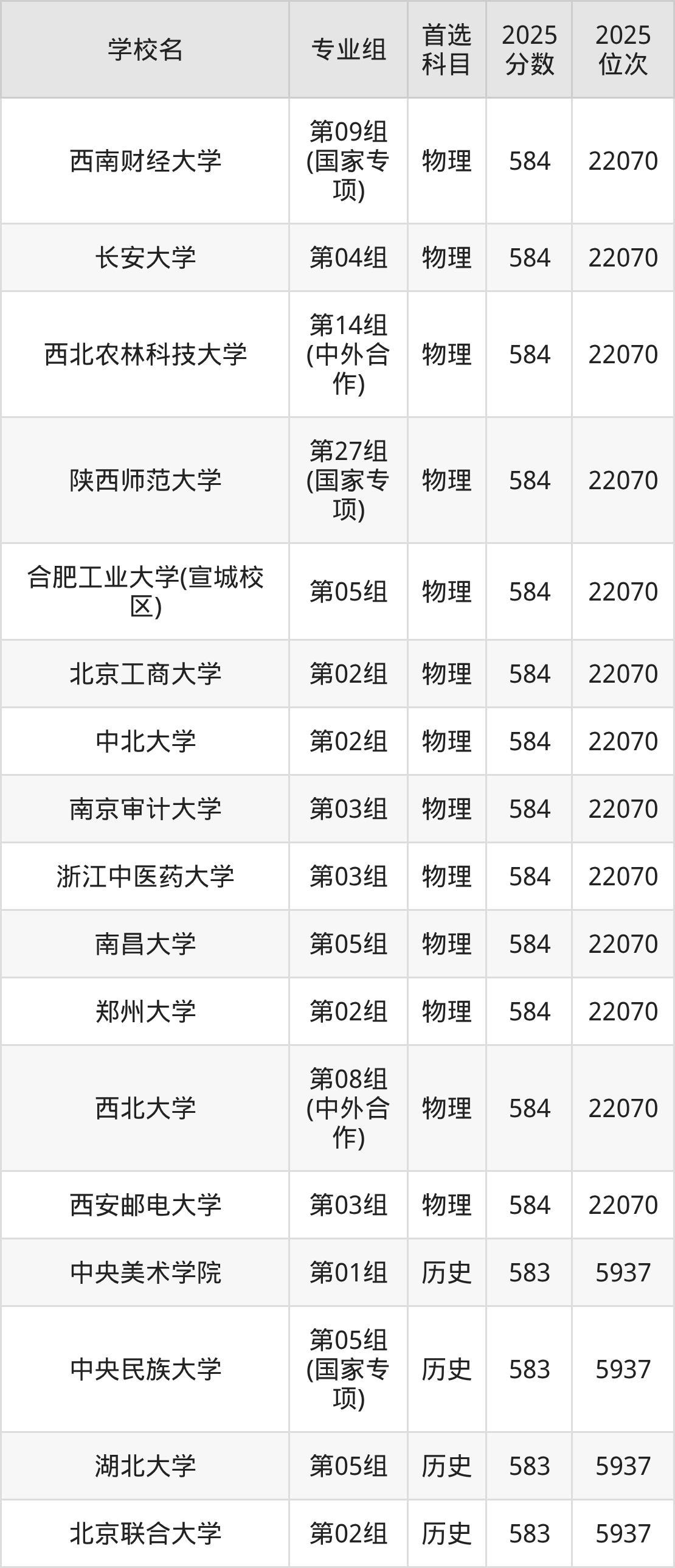 安徽高考物理类584分对应的位次排名是37842名-38603名,历史类584分对应的位次排名是5717名-5888名,因此建议2026年位次排在这附近的同学考虑这些大学。