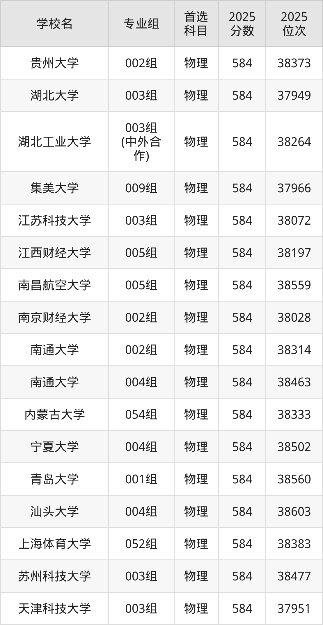 物理类584分可以冲的大学:长春理工大学586分、大连理工大学(盘锦校区)586分、东北林业大学586分、贵州大学586分等;较稳妥的大学:北京信息科技大学583分、北京中医药大学583分、长安大学583分、广东工业大学583分等。