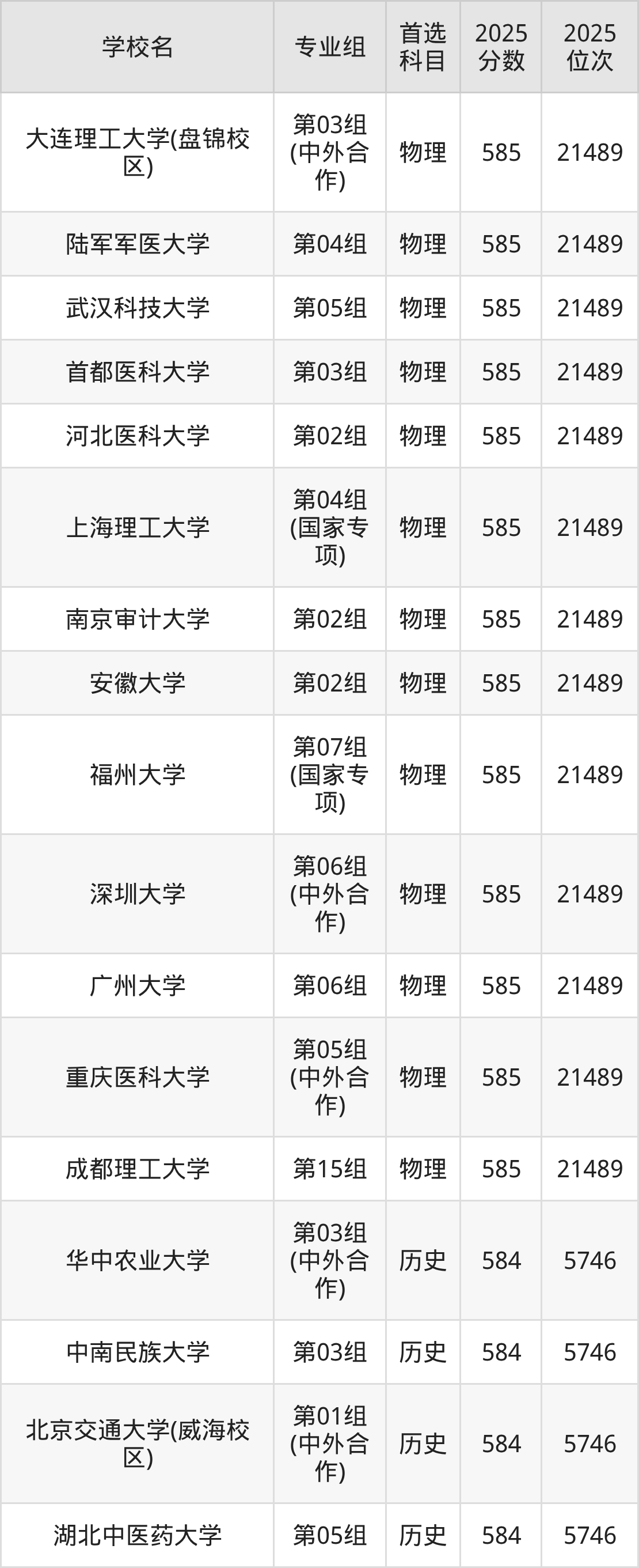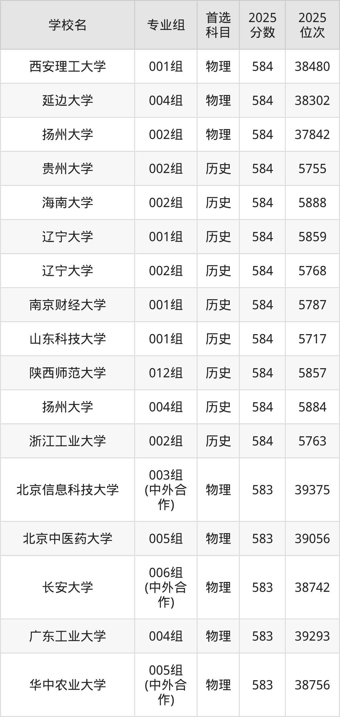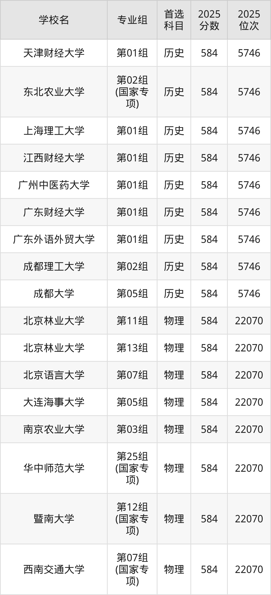 2025年在湖北高考历史类录取分数线是584分的大学有华中农业大学、中南民族大学、北京交通大学(威海校区)、湖北中医药大学、天津财经大学、东北农业大学、上海理工大学、江西财经大学、广州中医药大学、广东财经大学等。物理类录取分数线是584分的大学有北京林业大学、北京语言大学、大连海事大学、南京农业大学、华中师范大学、暨南大学、西南交通大学、西南财经大学、长安大学、西北农林科技大学等。