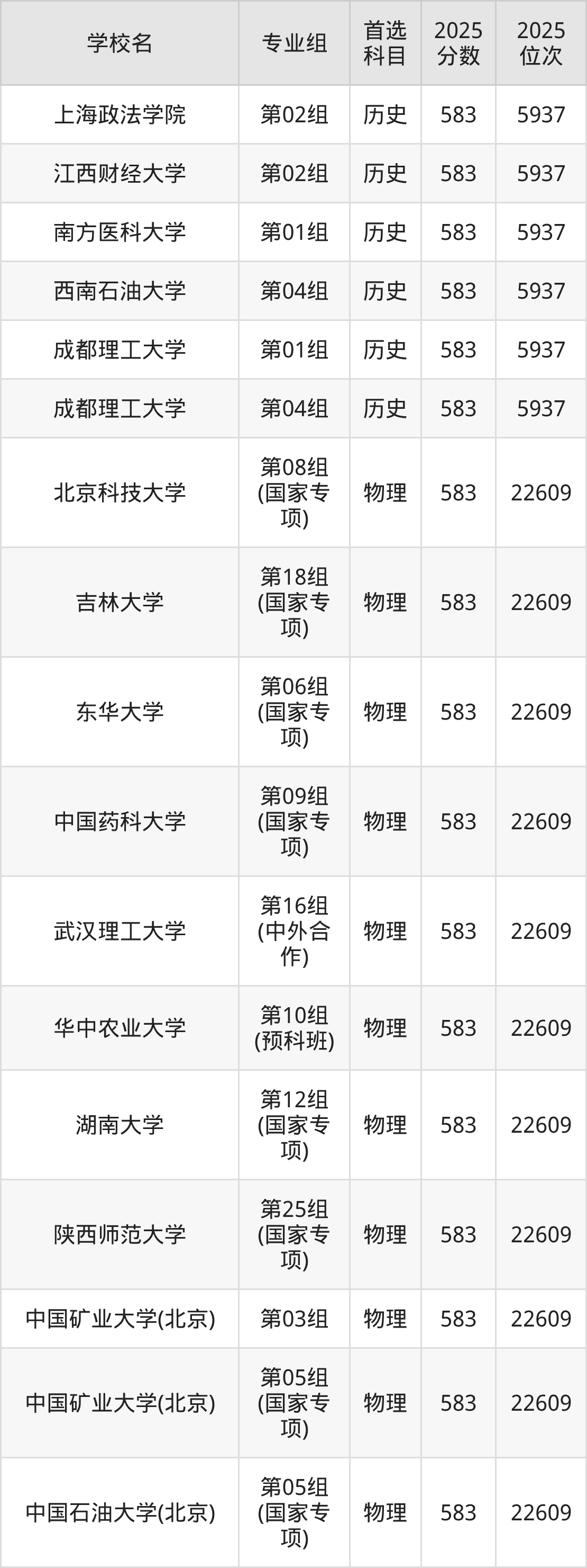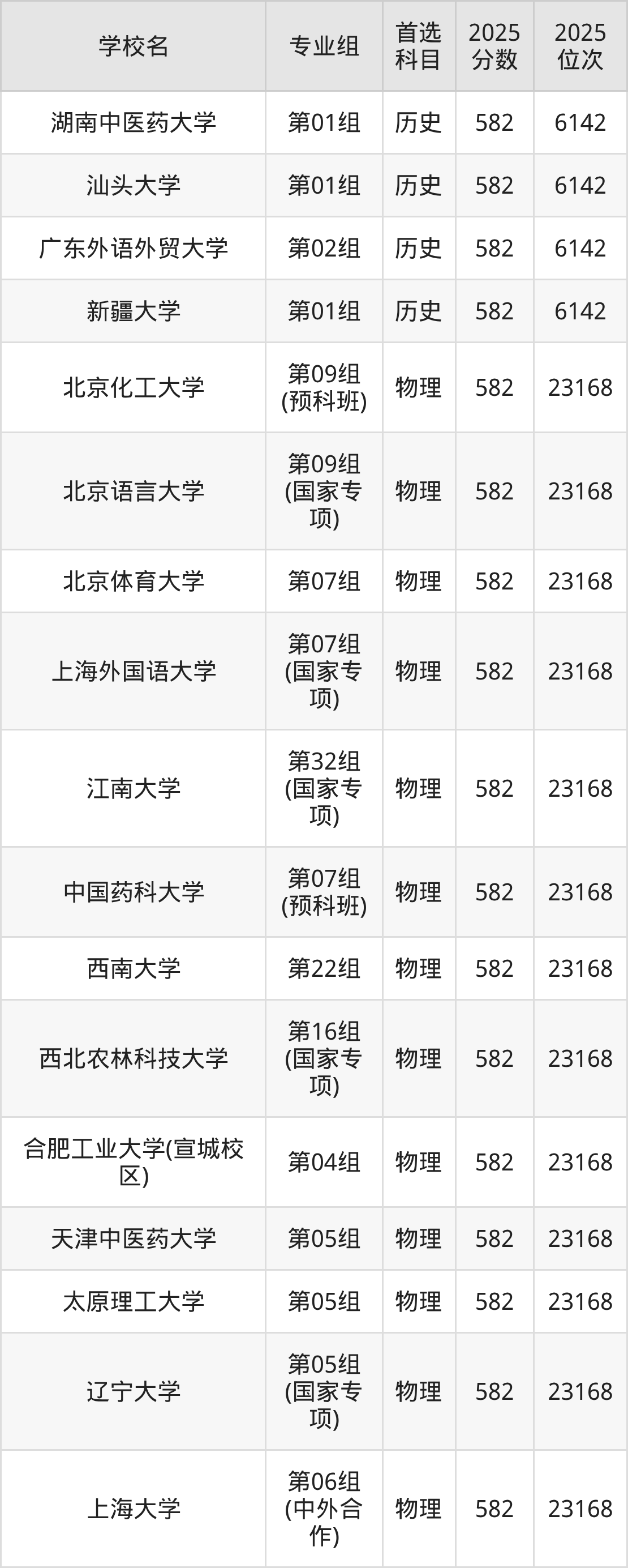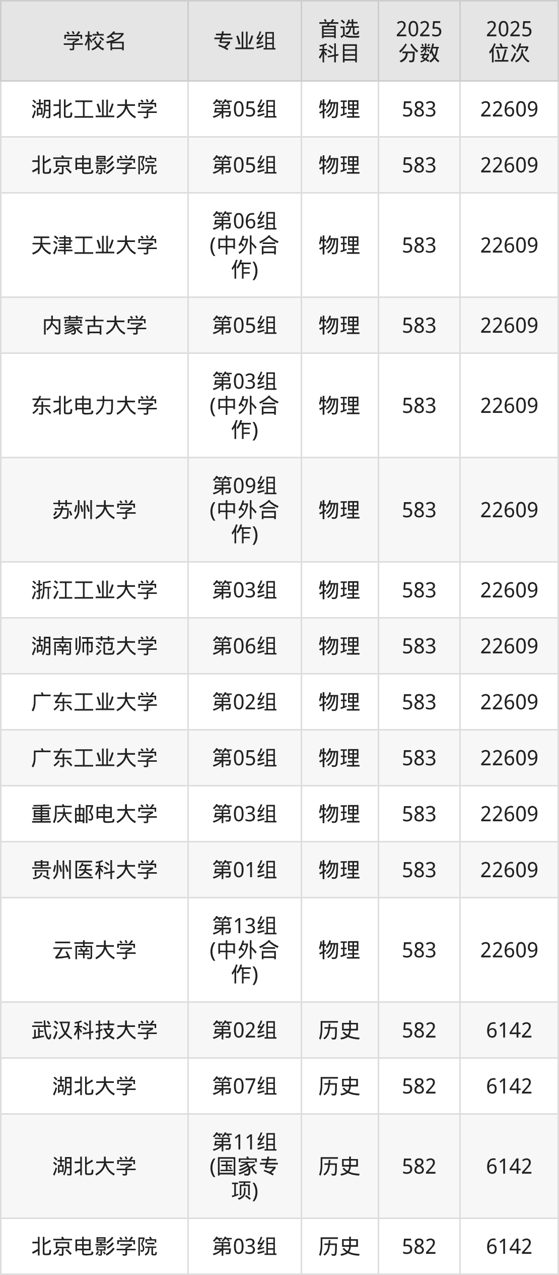 2025年在湖北高考历史类录取分数线是584分的大学有华中农业大学、中南民族大学、北京交通大学(威海校区)、湖北中医药大学、天津财经大学、东北农业大学、上海理工大学、江西财经大学、广州中医药大学、广东财经大学等。物理类录取分数线是584分的大学有北京林业大学、北京语言大学、大连海事大学、南京农业大学、华中师范大学、暨南大学、西南交通大学、西南财经大学、长安大学、西北农林科技大学等。