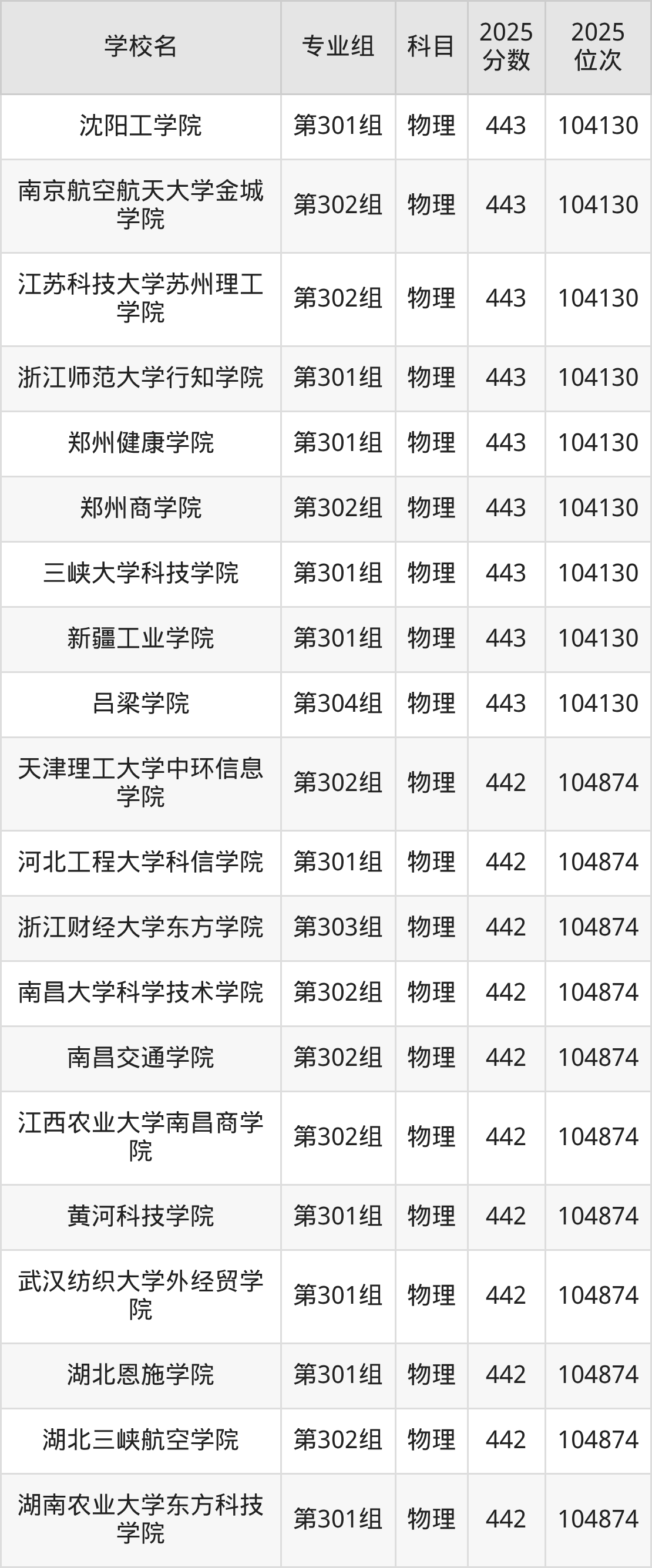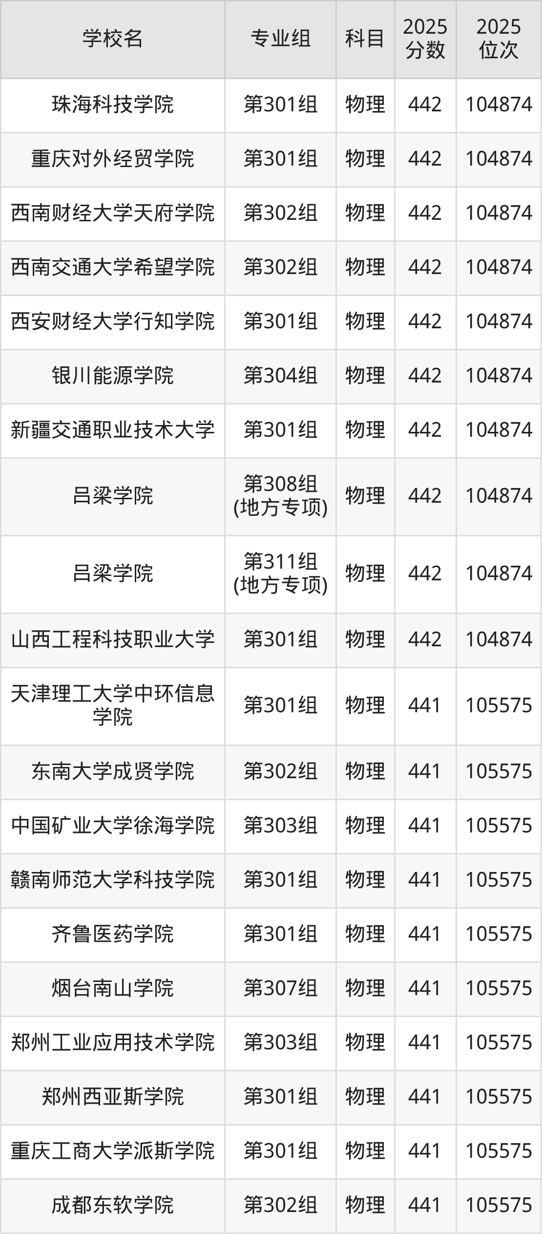 山西物理类442分对应的位次排名是104874名,因此建议2026年位次排在这附近的考生考虑这些大学。