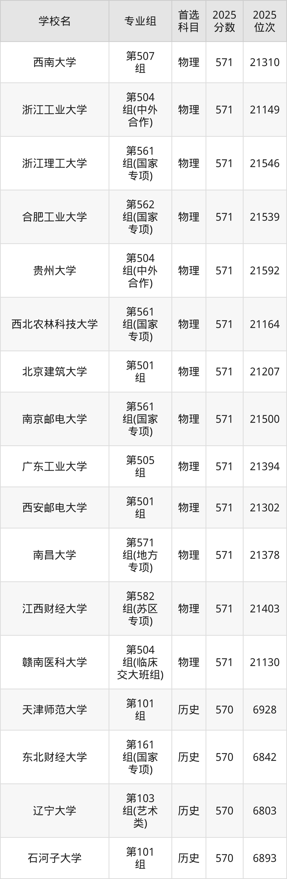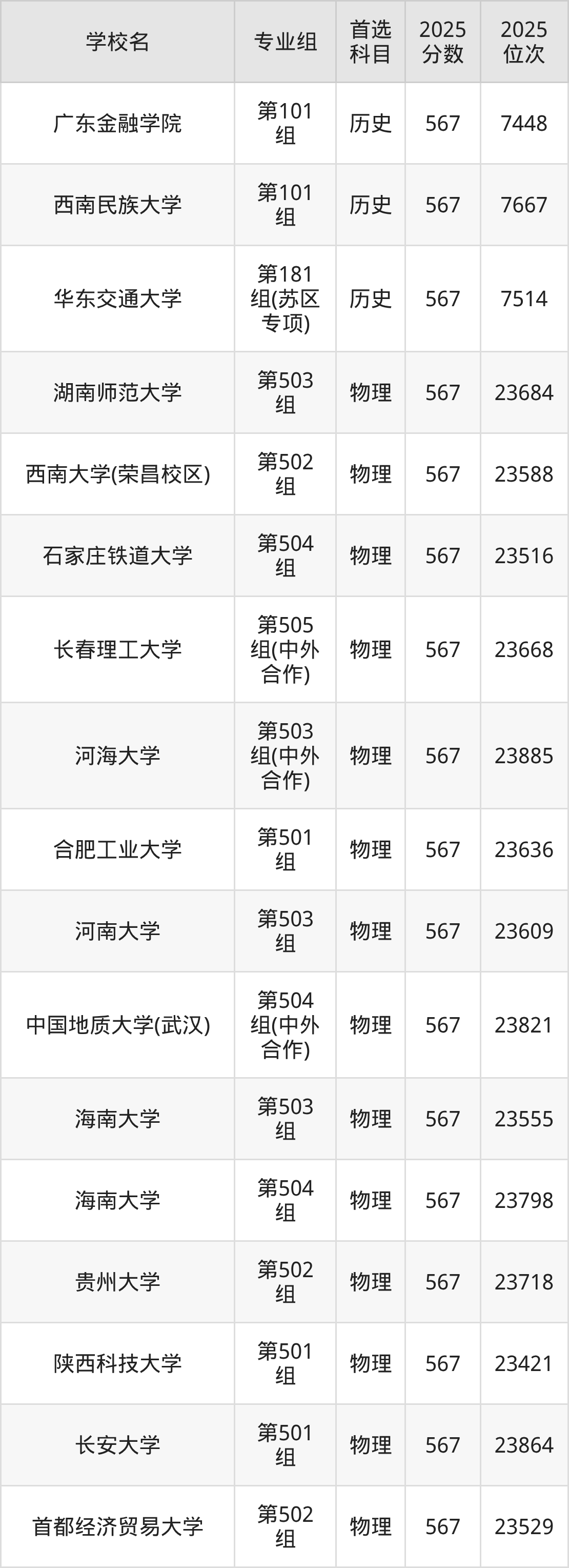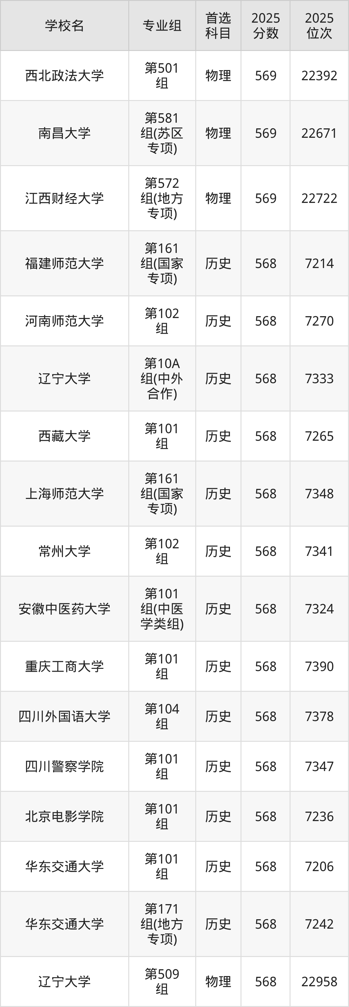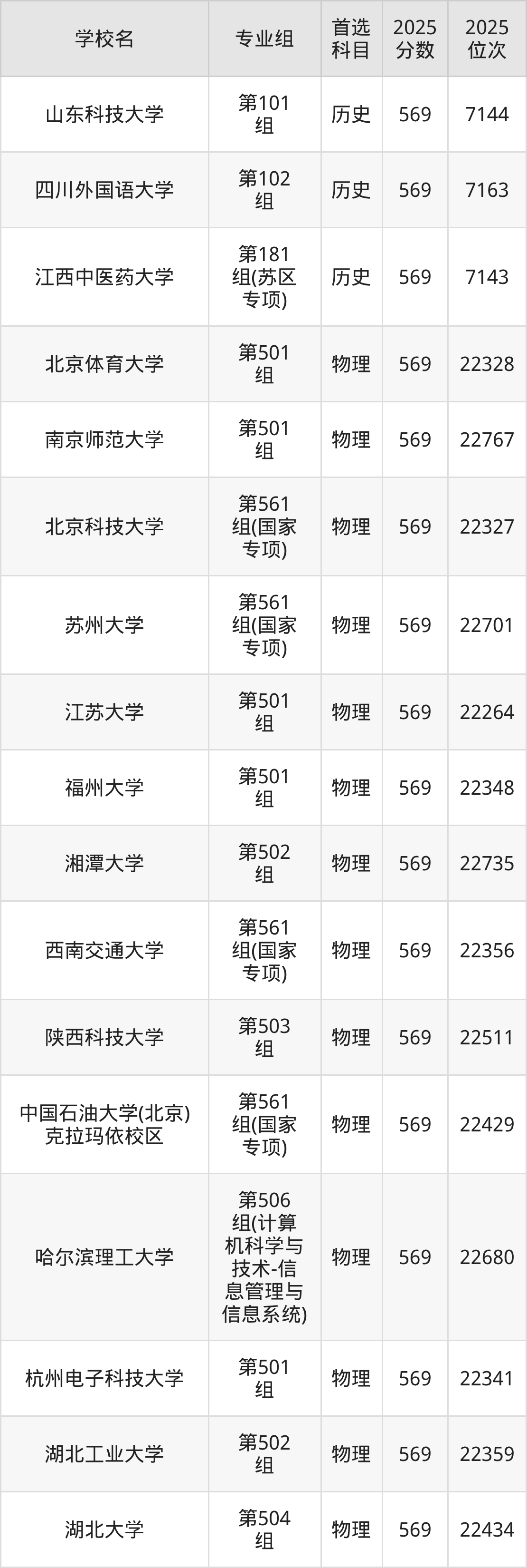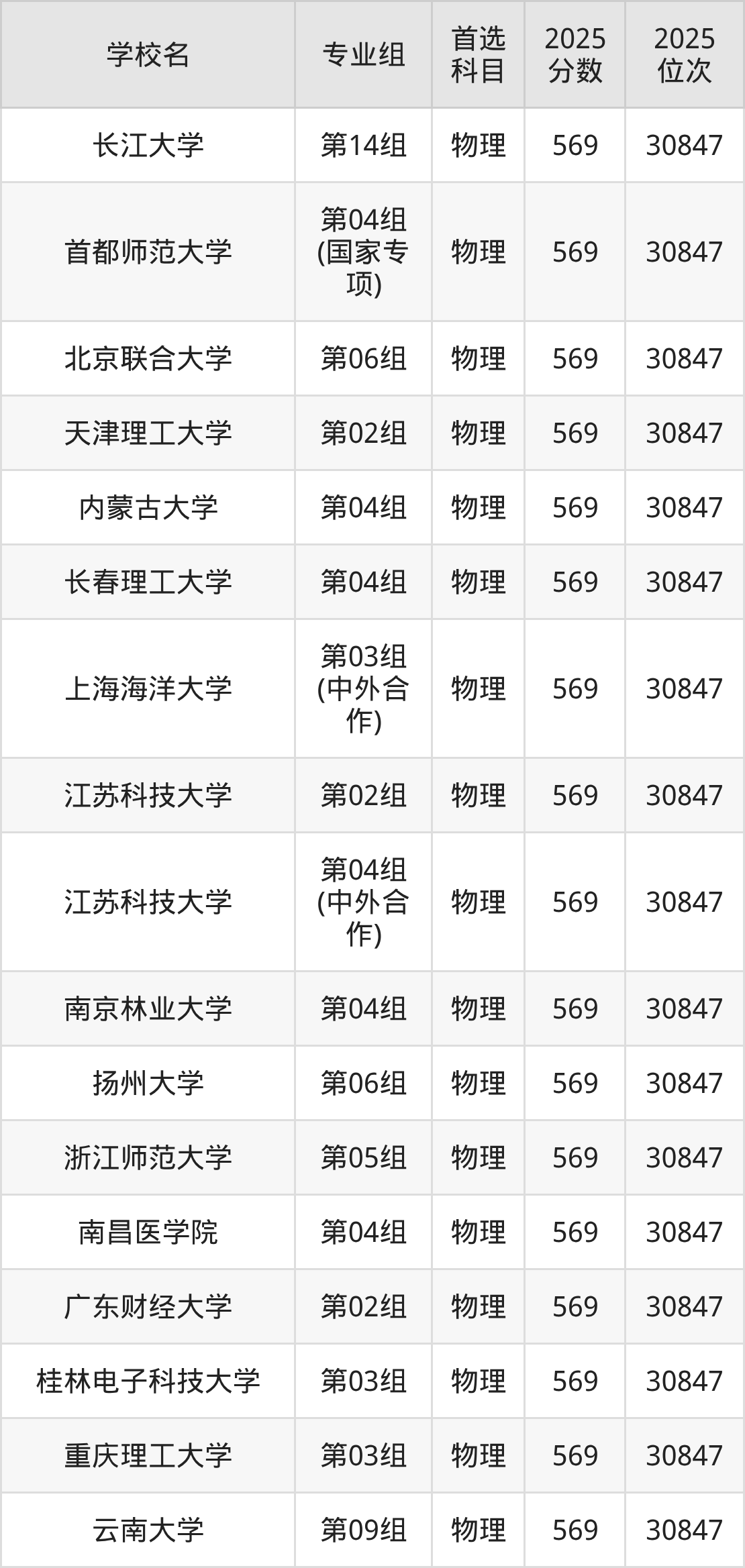 江西高考历史类569分对应的位次排名是6949名-7184名,物理类569分对应的位次排名是22264名-22767名,因此建议2026年位次排在这附近的同学考虑这些大学。