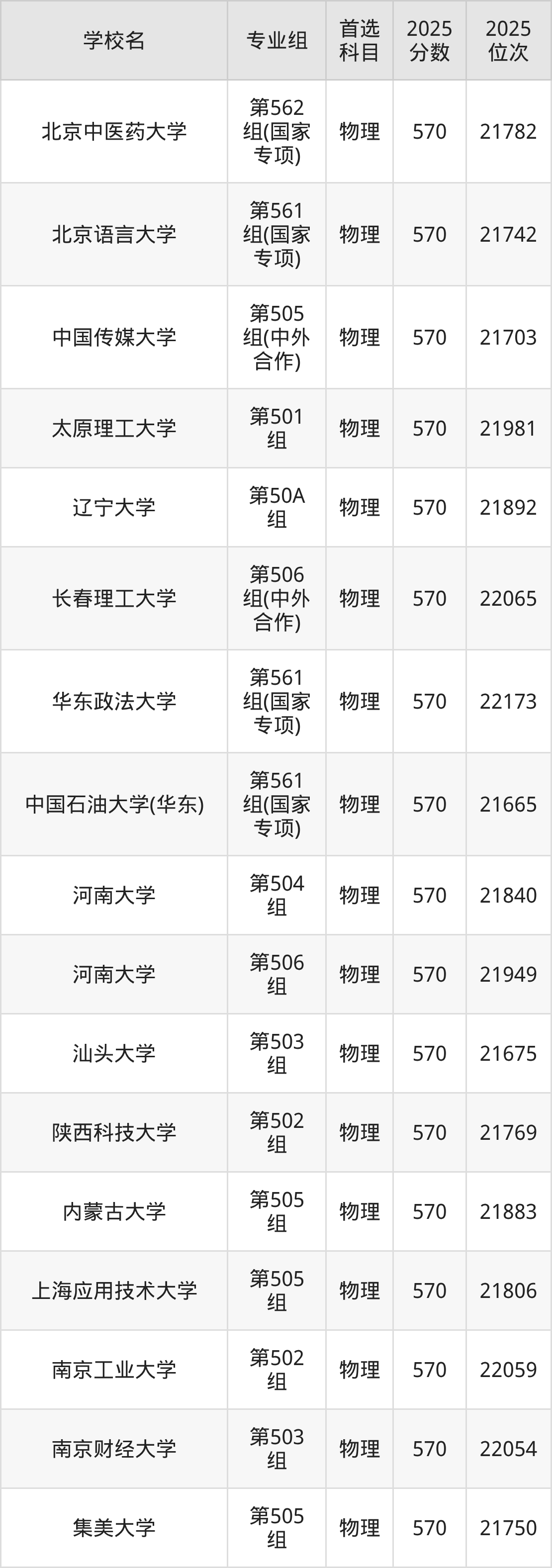 物理类569分可以冲的大学:北京语言大学571分、中国民航大学571分、大连海事大学571分、哈尔滨工程大学571分等;较稳妥的大学:北京中医药大学568分、中国矿业大学568分、华中农业大学568分、中国石油大学(北京)克拉玛依校区568分等。