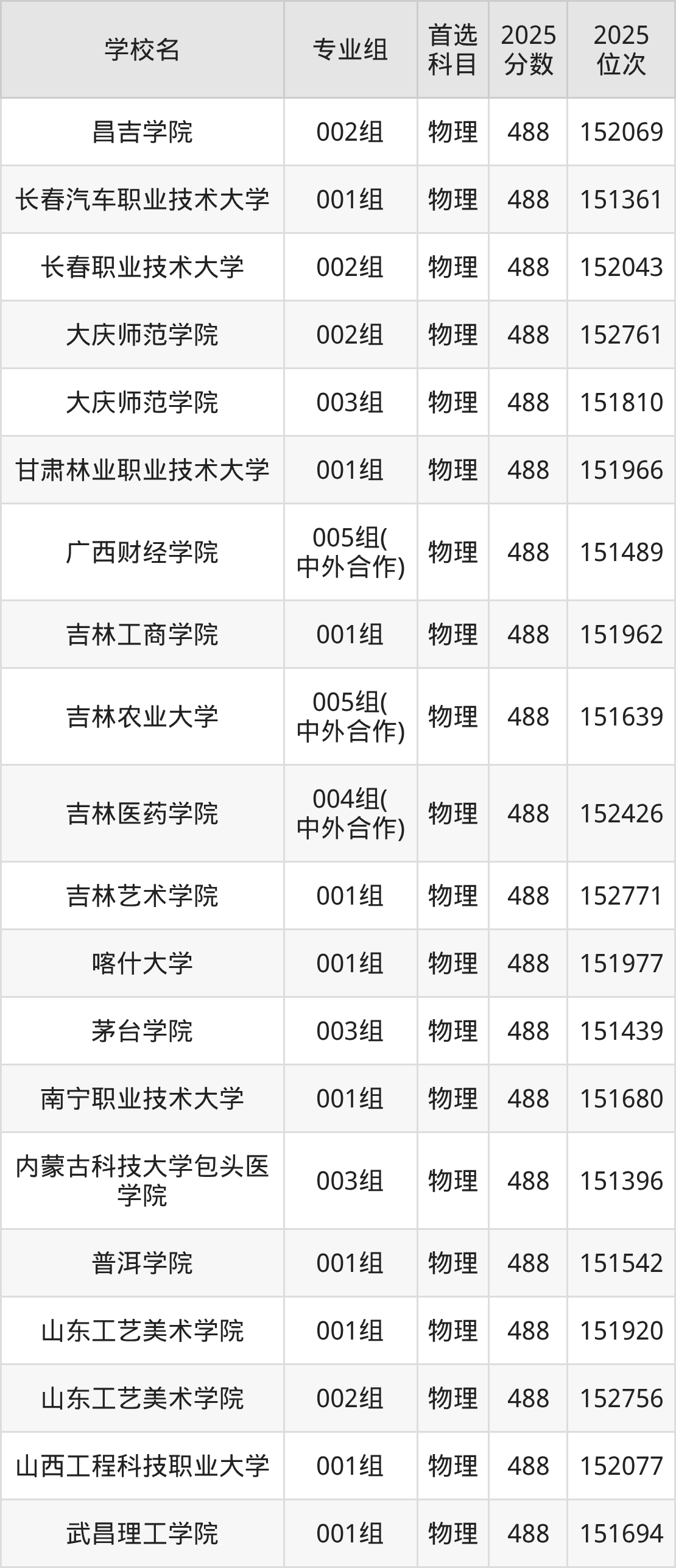 物理类486分可以冲的大学:昌吉学院488分、长春汽车职业技术大学488分、长春职业技术大学488分、大庆师范学院488分等;较稳妥的大学:成都东软学院485分、重庆移通学院485分、邯郸学院485分、衡水学院485分等。