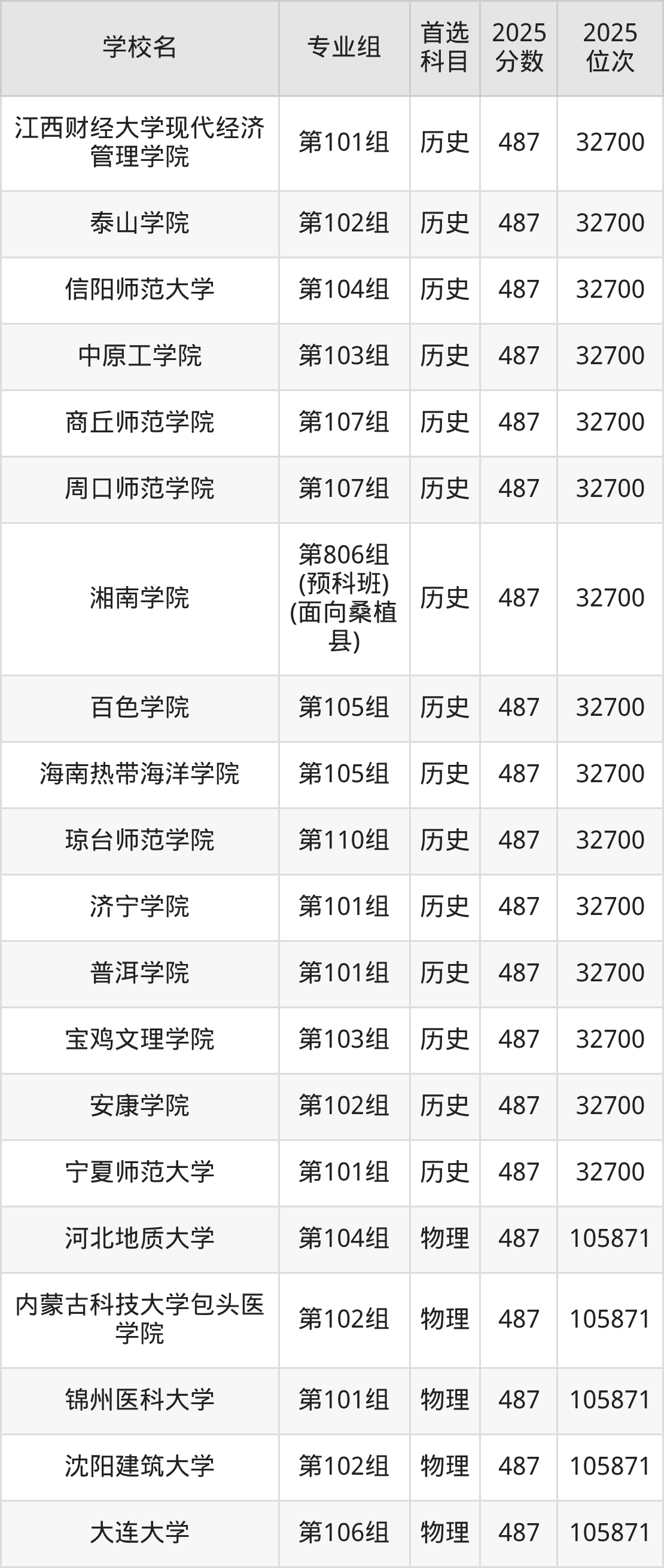 2025年在湖南高考历史类录取分数线是486分的大学有忻州师范学院、吕梁学院、长治学院、山西工程技术学院、内蒙古师范大学、内蒙古民族大学、内蒙古科技大学包头师范学院、佳木斯大学、黑龙江工程学院、大庆师范学院等。物理类录取分数线是486分的大学有河北工程大学、山西工程技术学院、辽宁中医药大学、黑龙江中医药大学、中国矿业大学、湖州师范大学、浙江机电职业技术大学、赣东学院、南阳理工学院、中南林业科技大学等。