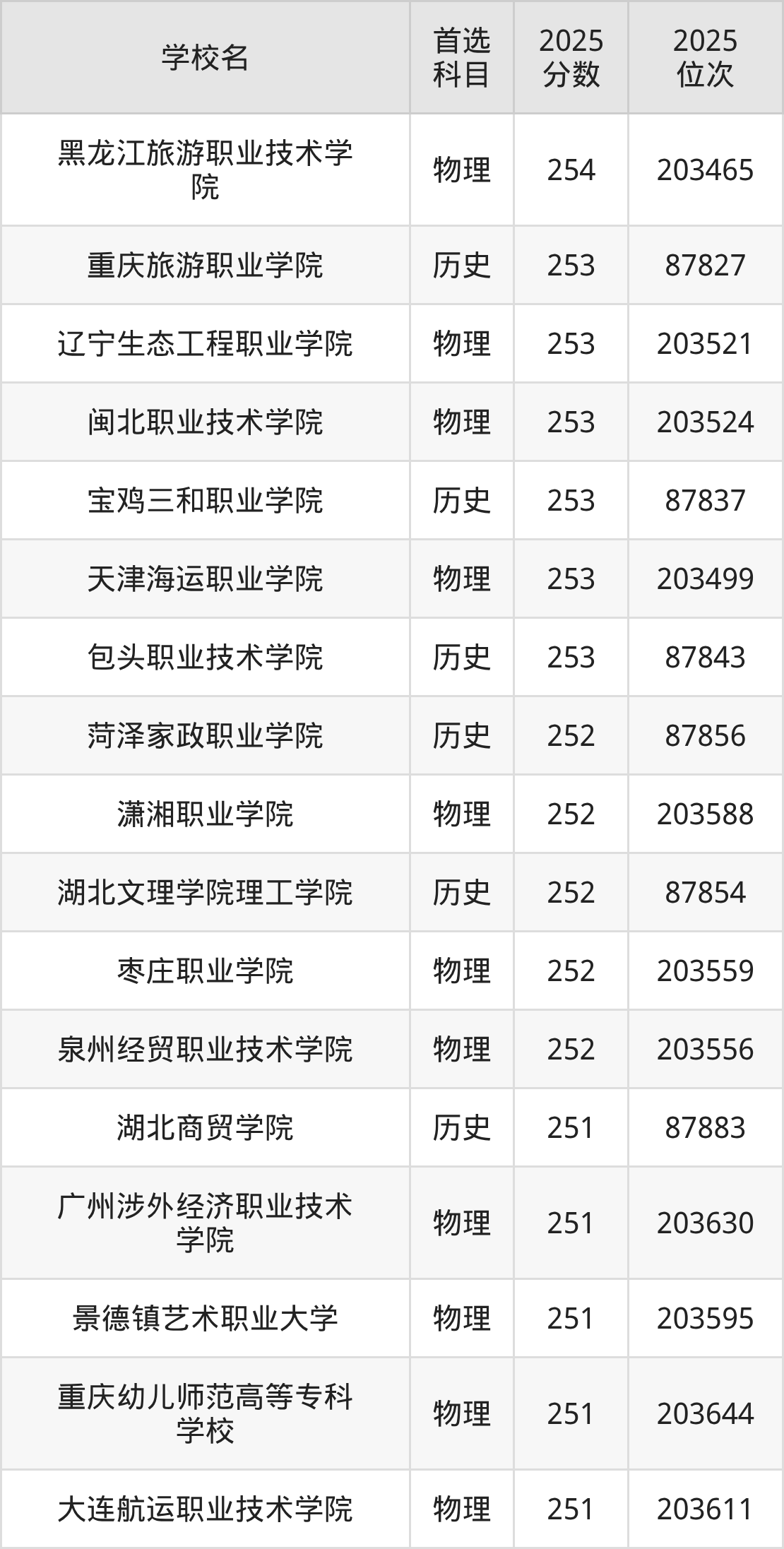 从2025年划定的批次线来看,253分在以下地区可以上专科大学,2025年专科线不超过253分的地区有23个,具体如下: