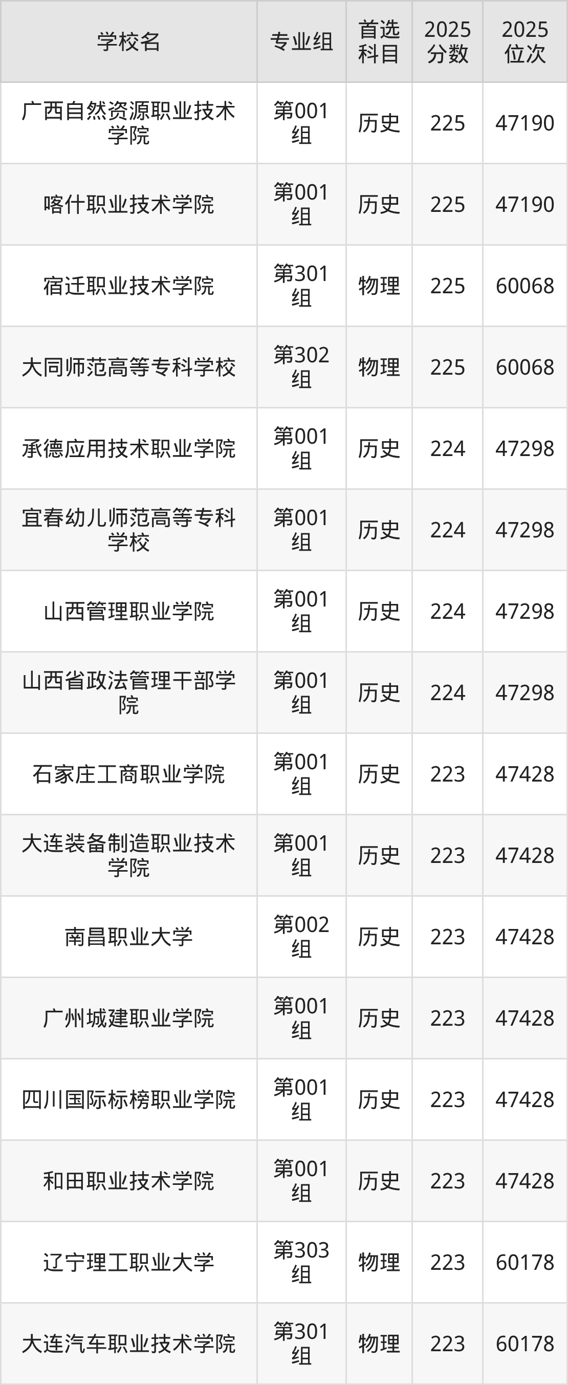 山西高考历史类223分对应的位次排名是47428名,物理类223分对应的位次排名是60178名,因此建议2026年位次排在这附近的同学考虑这些大学。