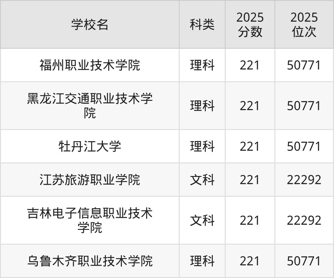 2025年在新疆高考文科录取分数线是223分的大学有喀什理工职业技术学院、绵阳职业技术学院。理科录取分数线是223分的大学有天津渤海职业技术学院、天津石油职业技术学院。