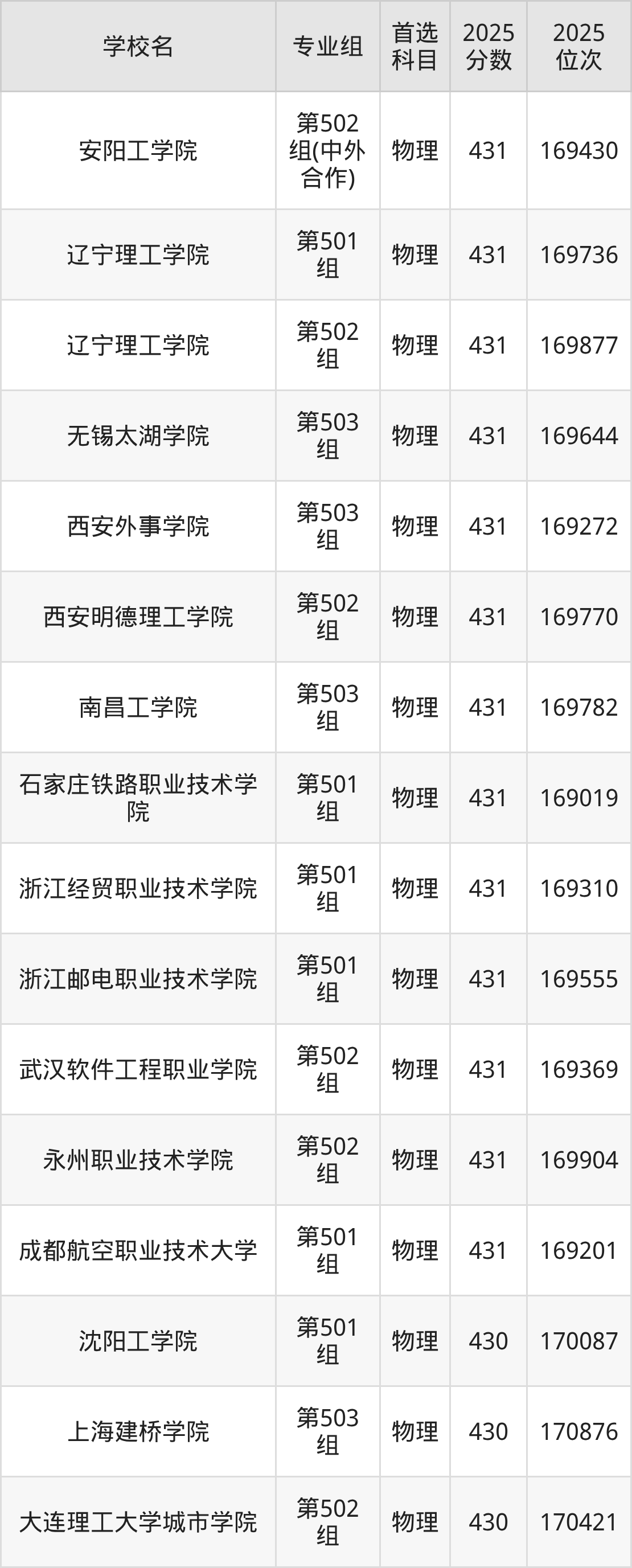 429分可以冲一冲的大学:安阳工学院431分、辽宁理工学院431分、无锡太湖学院431分、西安外事学院431分等;