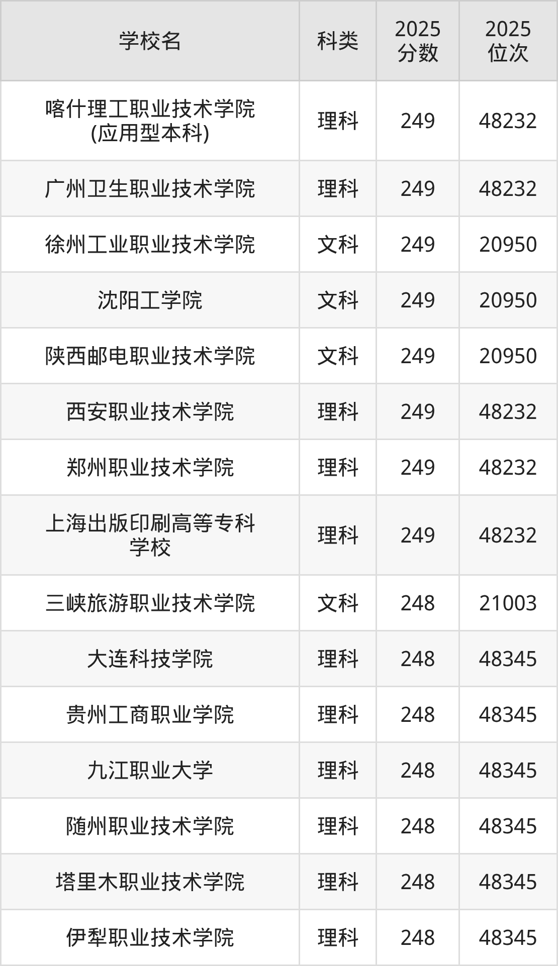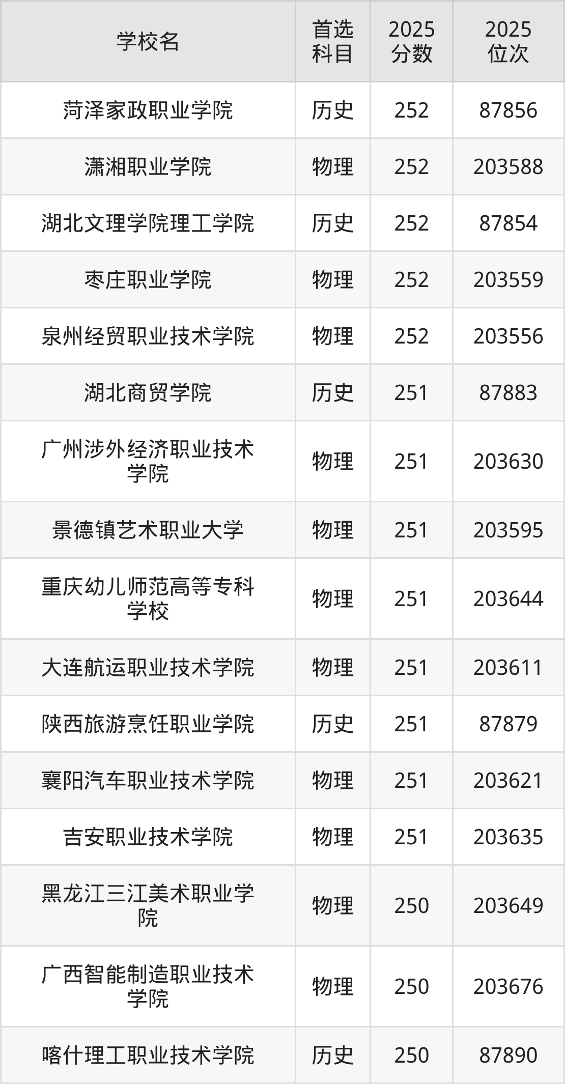 从2025年划定的批次线来看,250分在以下地区可以上专科大学,2025年专科线不超过250分的地区有23个,具体如下: