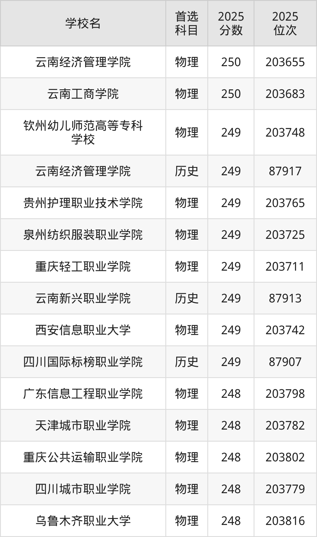 2025年在贵州高考物理类录取分数线是250分的大学有黑龙江三江美术职业学院、广西智能制造职业技术学院、云南经济管理学院、云南工商学院。历史类录取分数线是250分的大学有喀什理工职业技术学院。