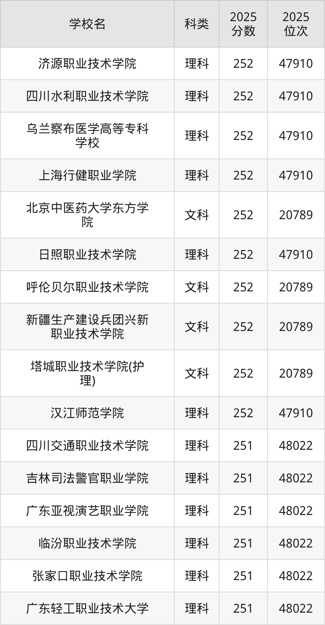 2025年在新疆高考文科录取分数线是250分的大学有柳州职业技术大学、天津轻工职业技术学院、商丘职业技术学院。理科录取分数线是250分的大学有宁夏警官职业学院、渭南职业技术学院、苏州百年职业学院、喀什职业技术学院、天津电子信息职业技术学院、新疆警察学院、重庆电子科技职业大学。
