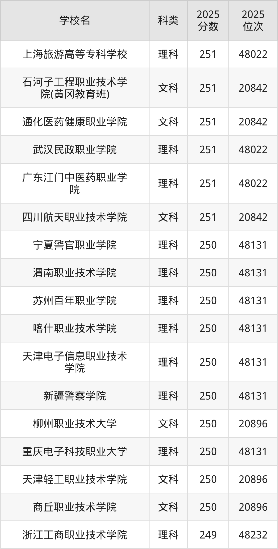 下面老师将以上文整理的其中两个省份为例,为大家具体展示250分左右能上的专科大学名单。