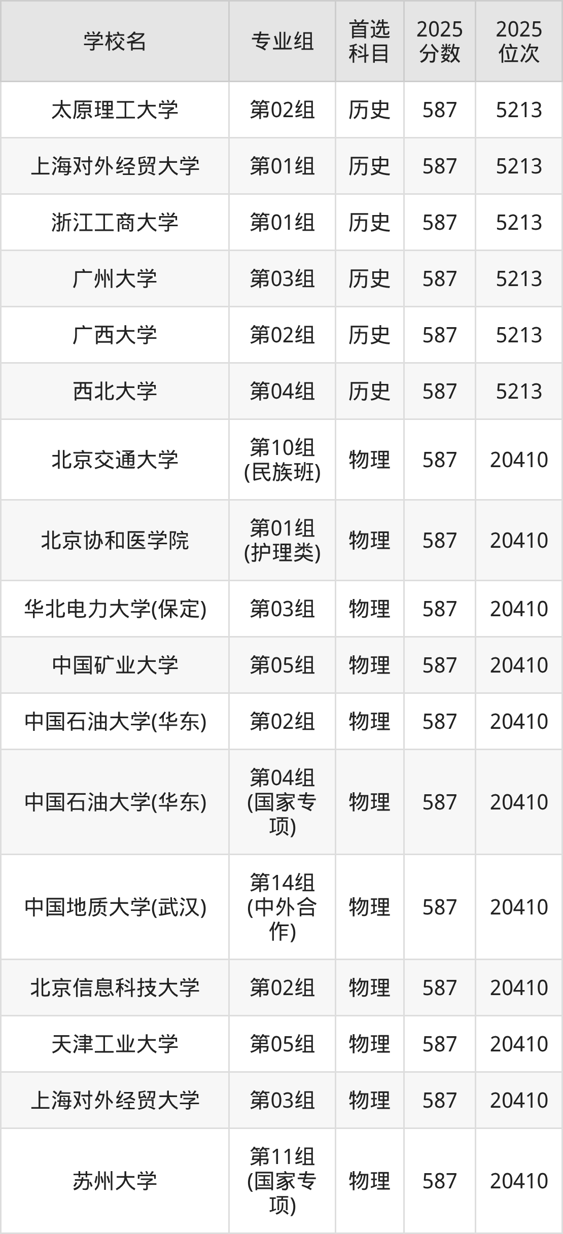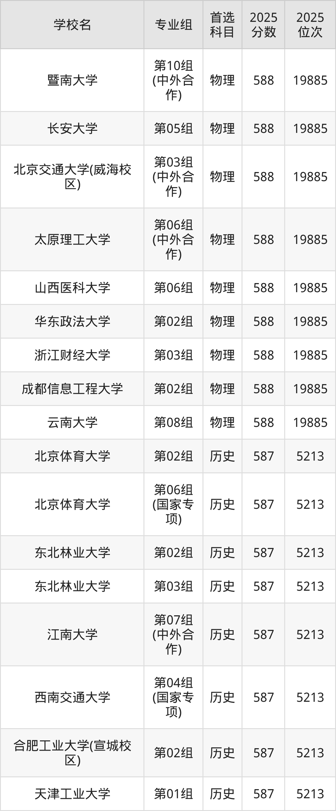 2025年在湖北高考历史类录取分数线是587分的大学有北京体育大学、东北林业大学、江南大学、西南交通大学、合肥工业大学(宣城校区)、天津工业大学、太原理工大学、上海对外经贸大学、浙江工商大学、广州大学等。物理类录取分数线是587分的大学有北京交通大学、北京协和医学院、华北电力大学(保定)、中国矿业大学、中国石油大学(华东)、中国地质大学(武汉)、北京信息科技大学、天津工业大学、上海对外经贸大学、苏州大学等。