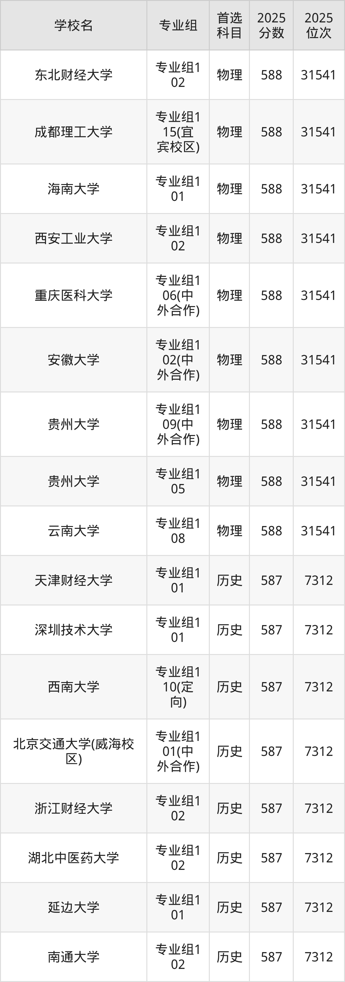 四川高考历史类587分对应的位次排名是7312名,物理类587分对应的位次排名是32274名,因此建议2026年位次排在这附近的同学考虑这些大学。