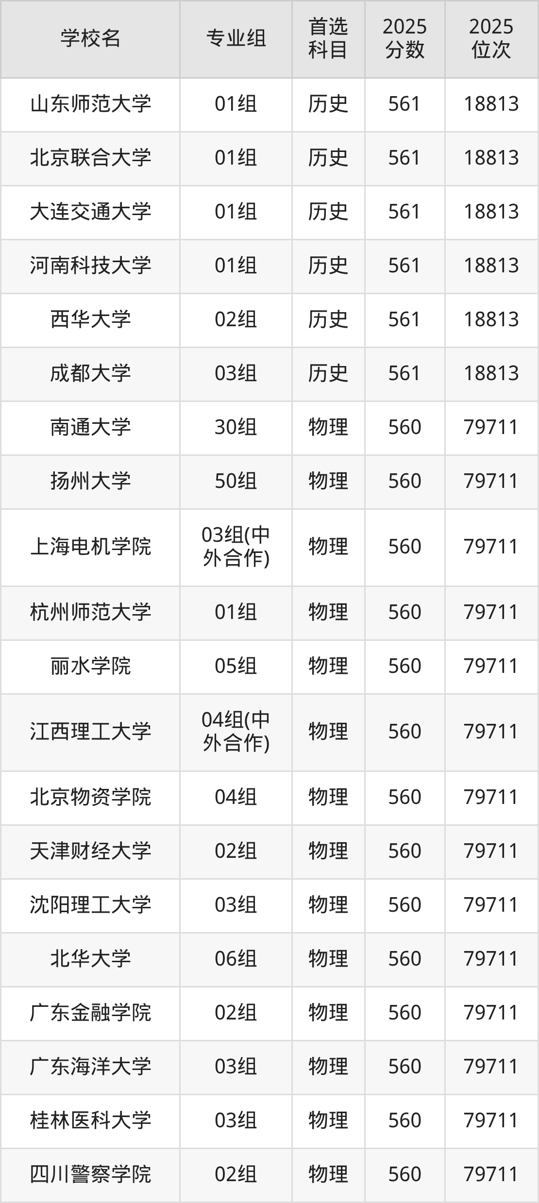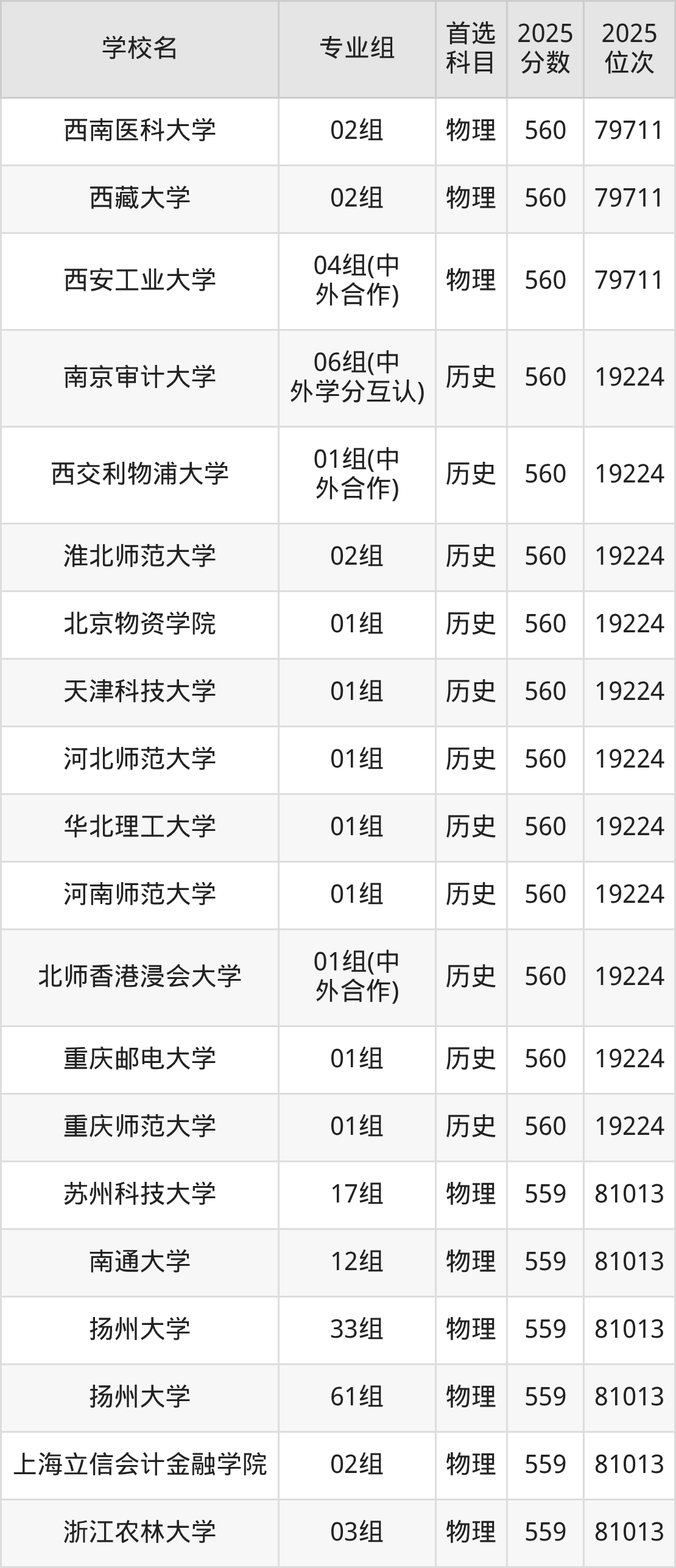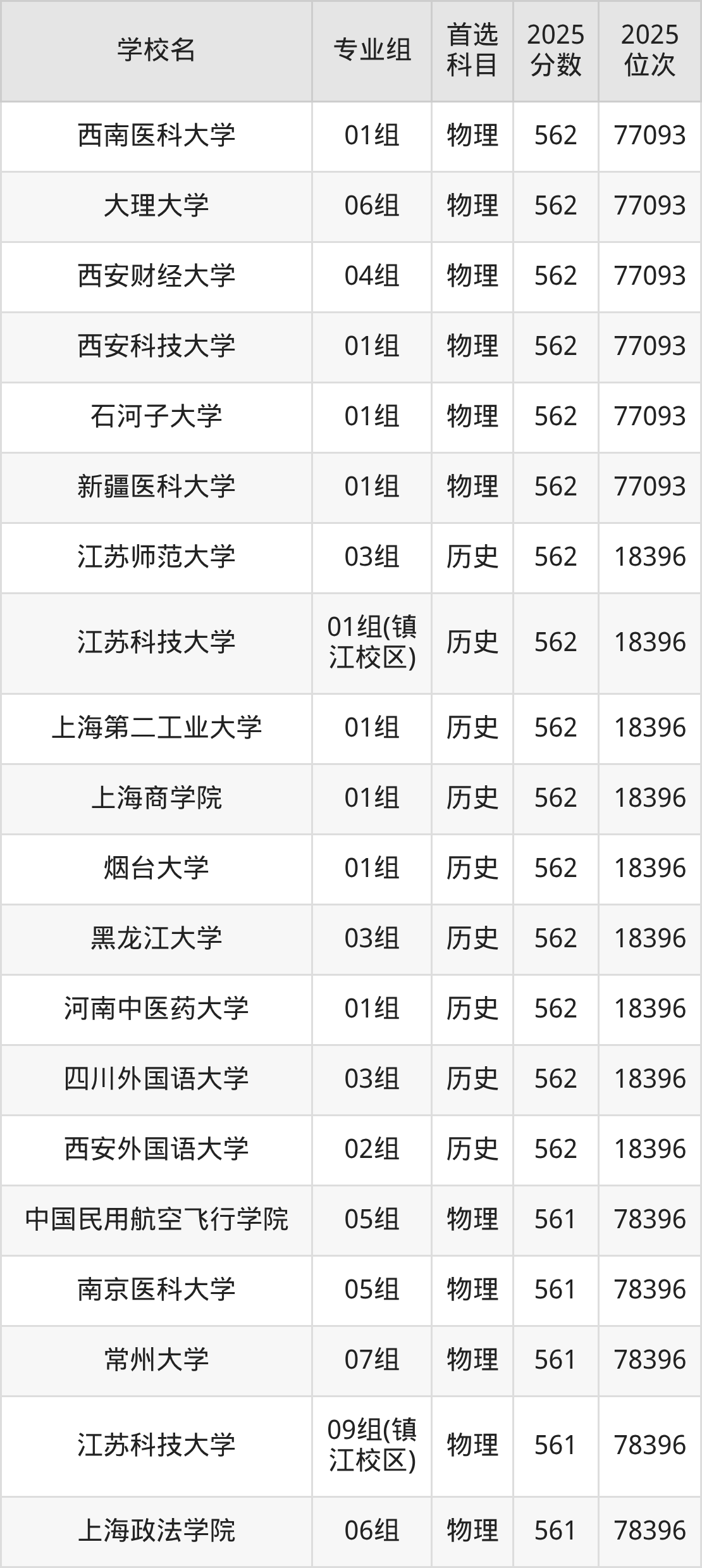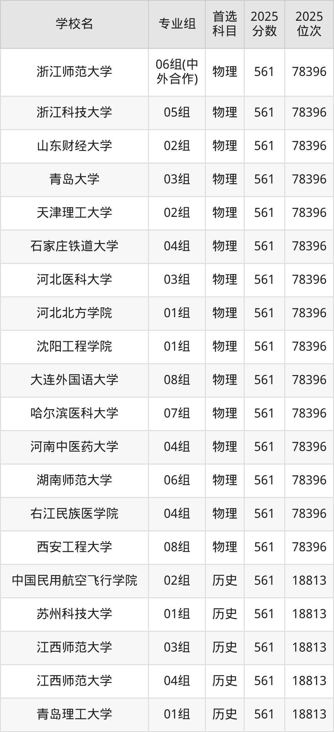 江苏高考物理类561分对应的位次排名是78396名,历史类561分对应的位次排名是18813名,因此建议2026年位次排在这附近的同学考虑这些大学。