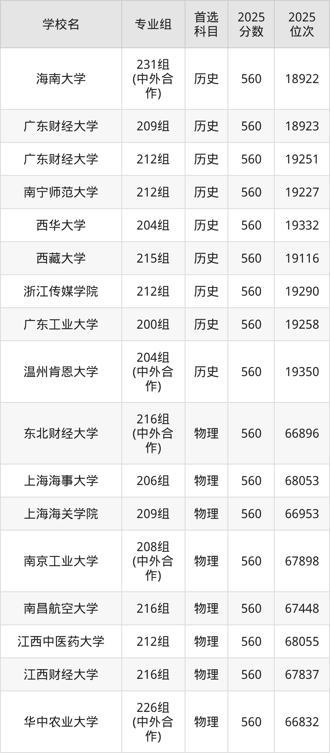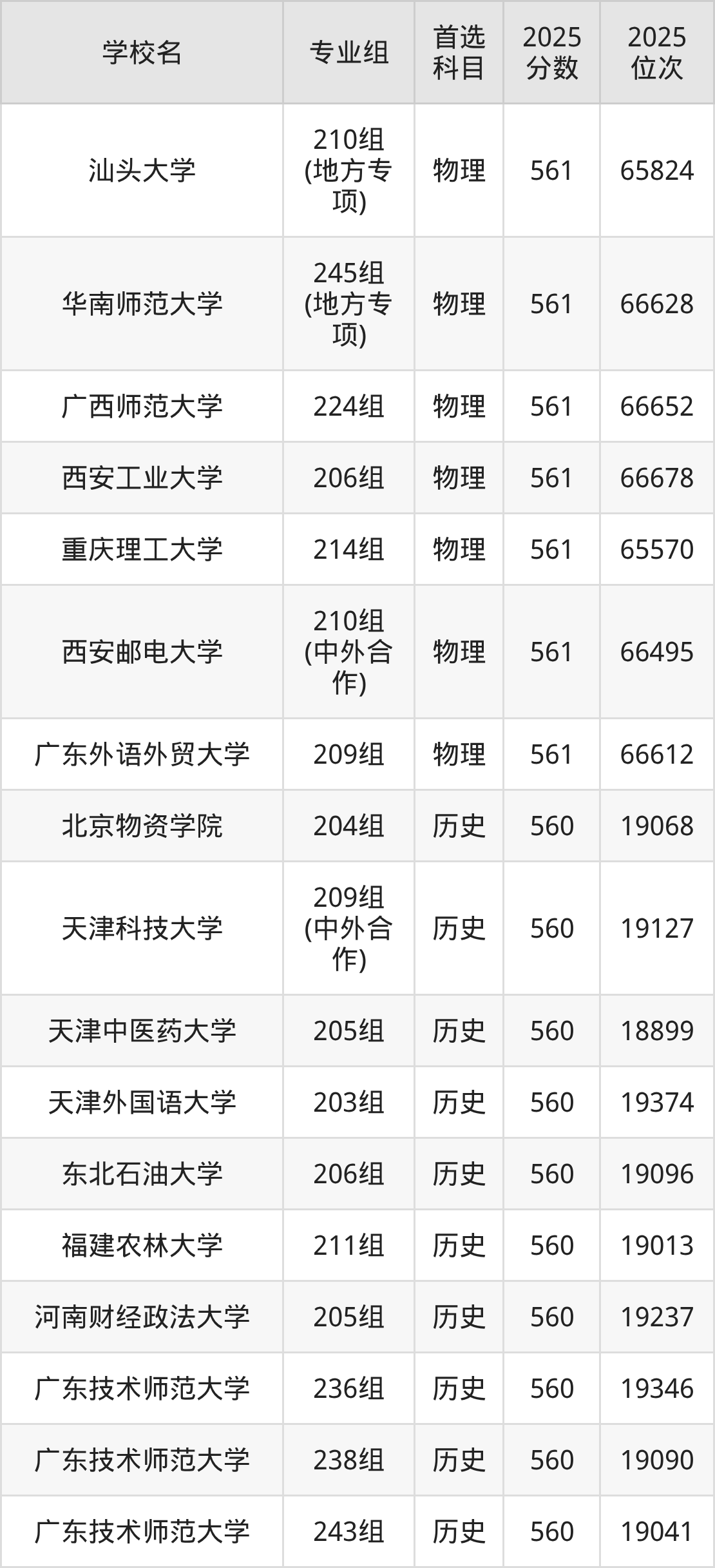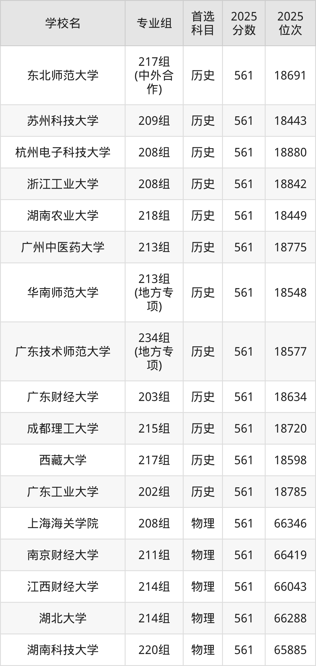 广东高考历史类561分对应的位次排名是18443名-18880名,物理类561分对应的位次排名是65570名-66678名,因此建议2026年位次排在这附近的同学考虑这些大学。