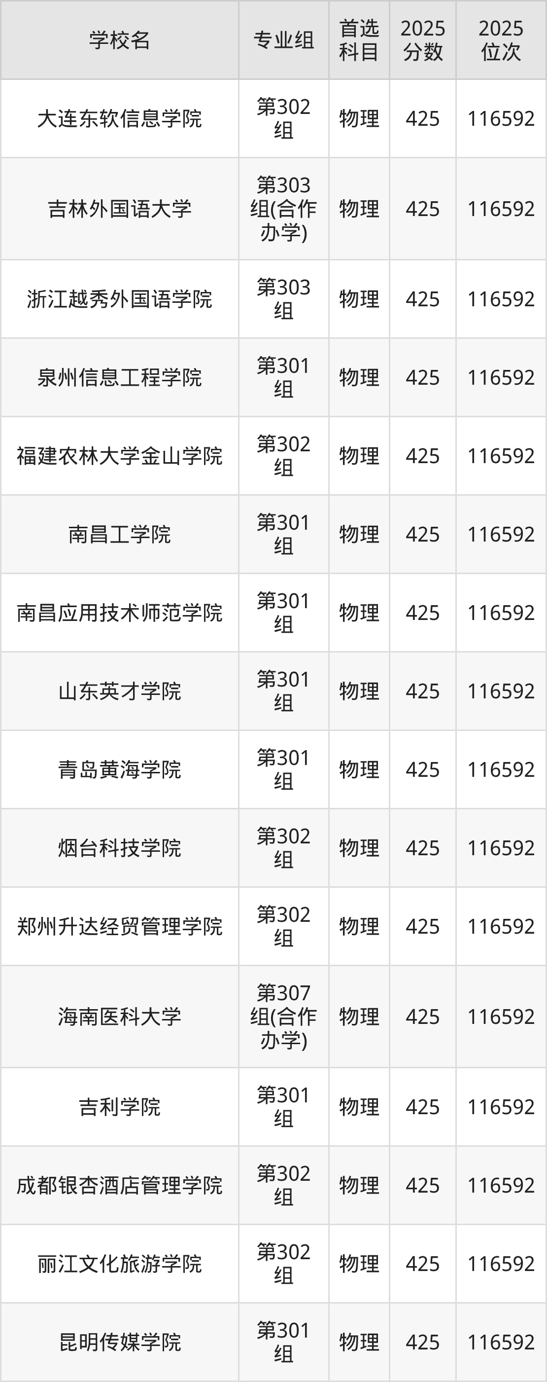 423分可以冲一冲的大学:大连东软信息学院425分、吉林外国语大学425分、浙江越秀外国语学院425分、泉州信息工程学院425分等;