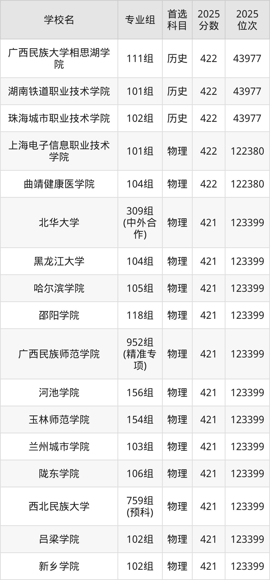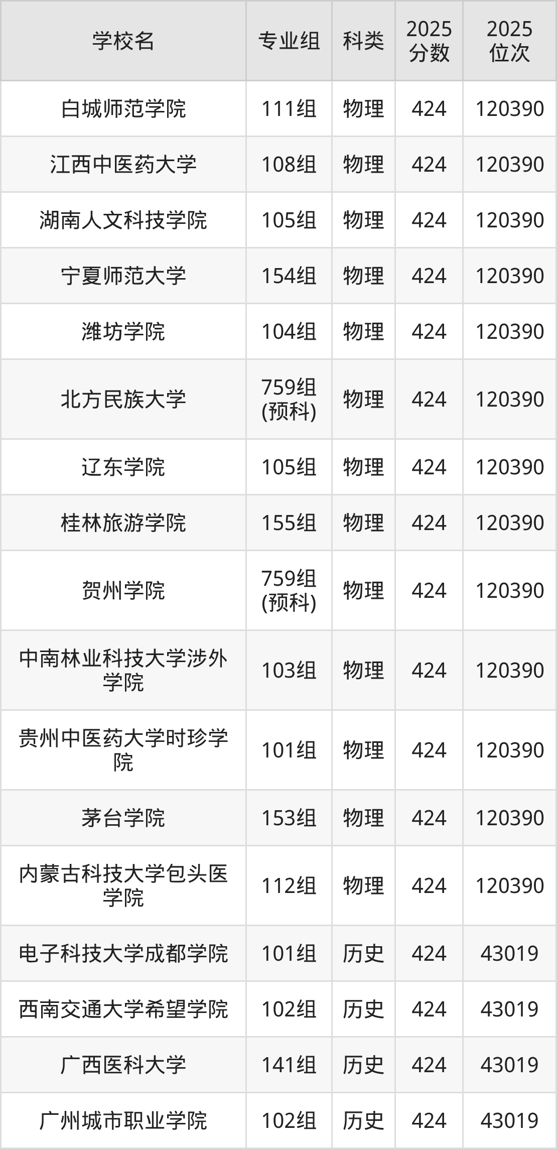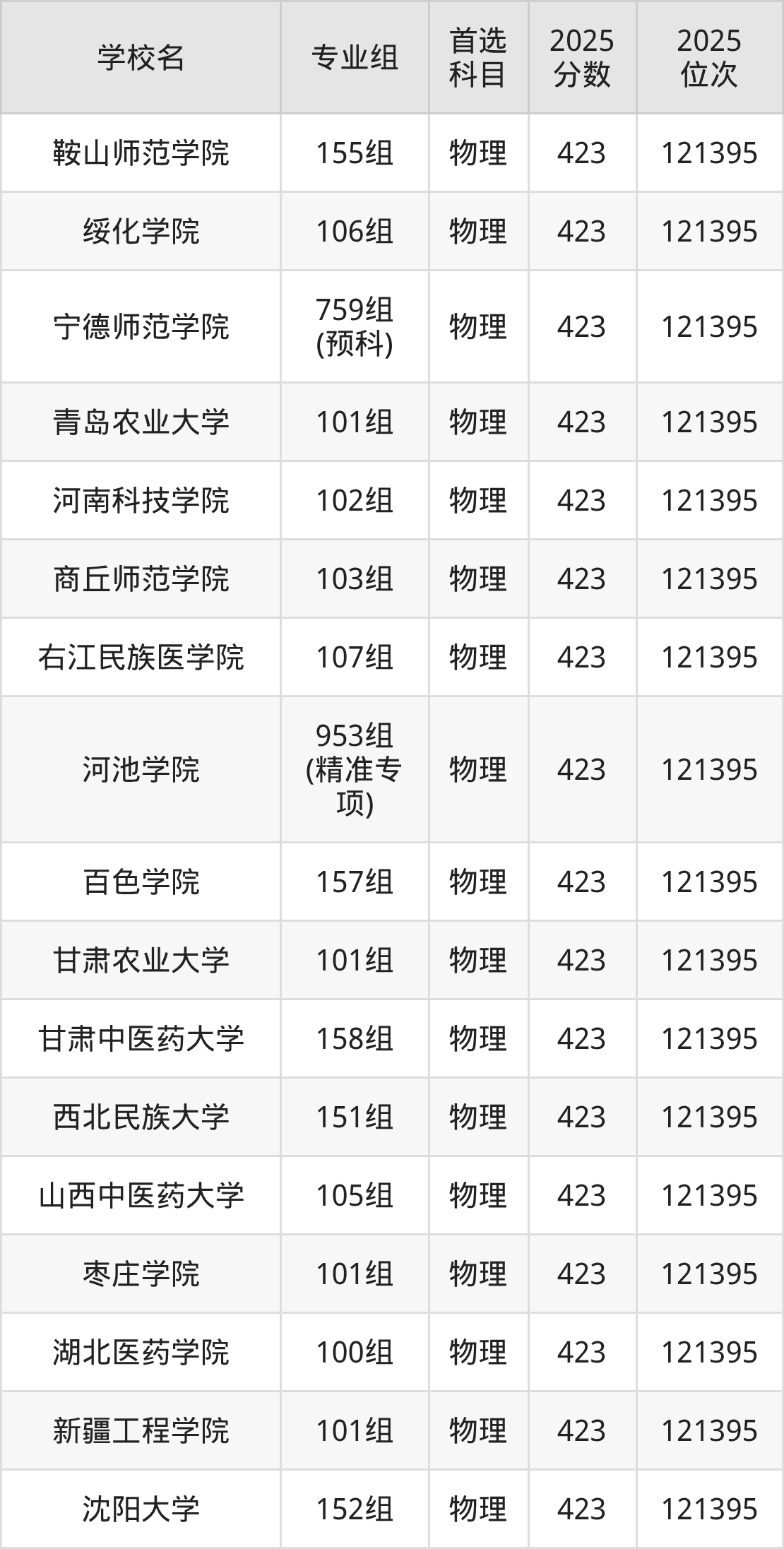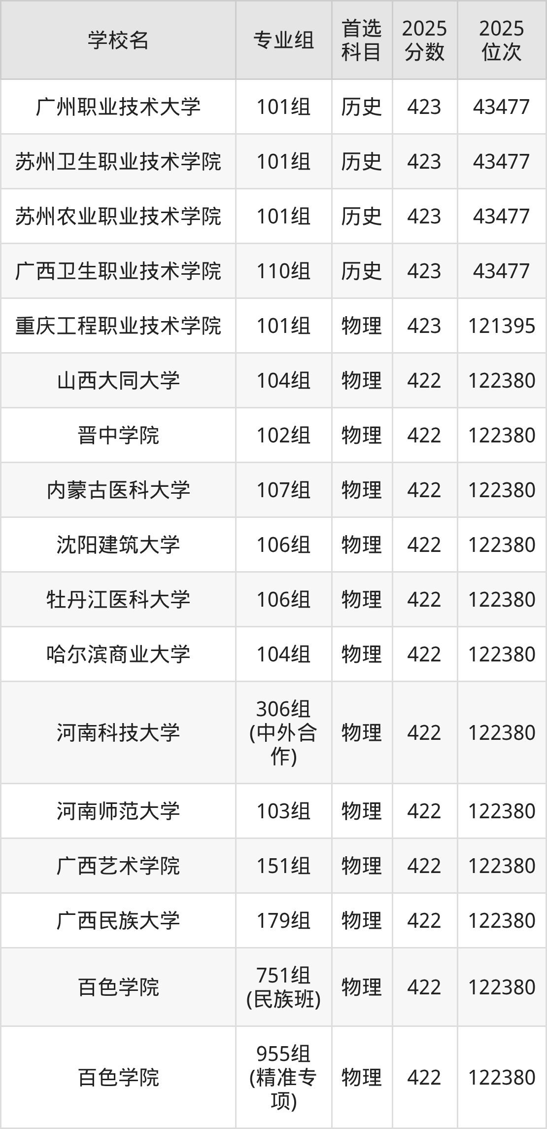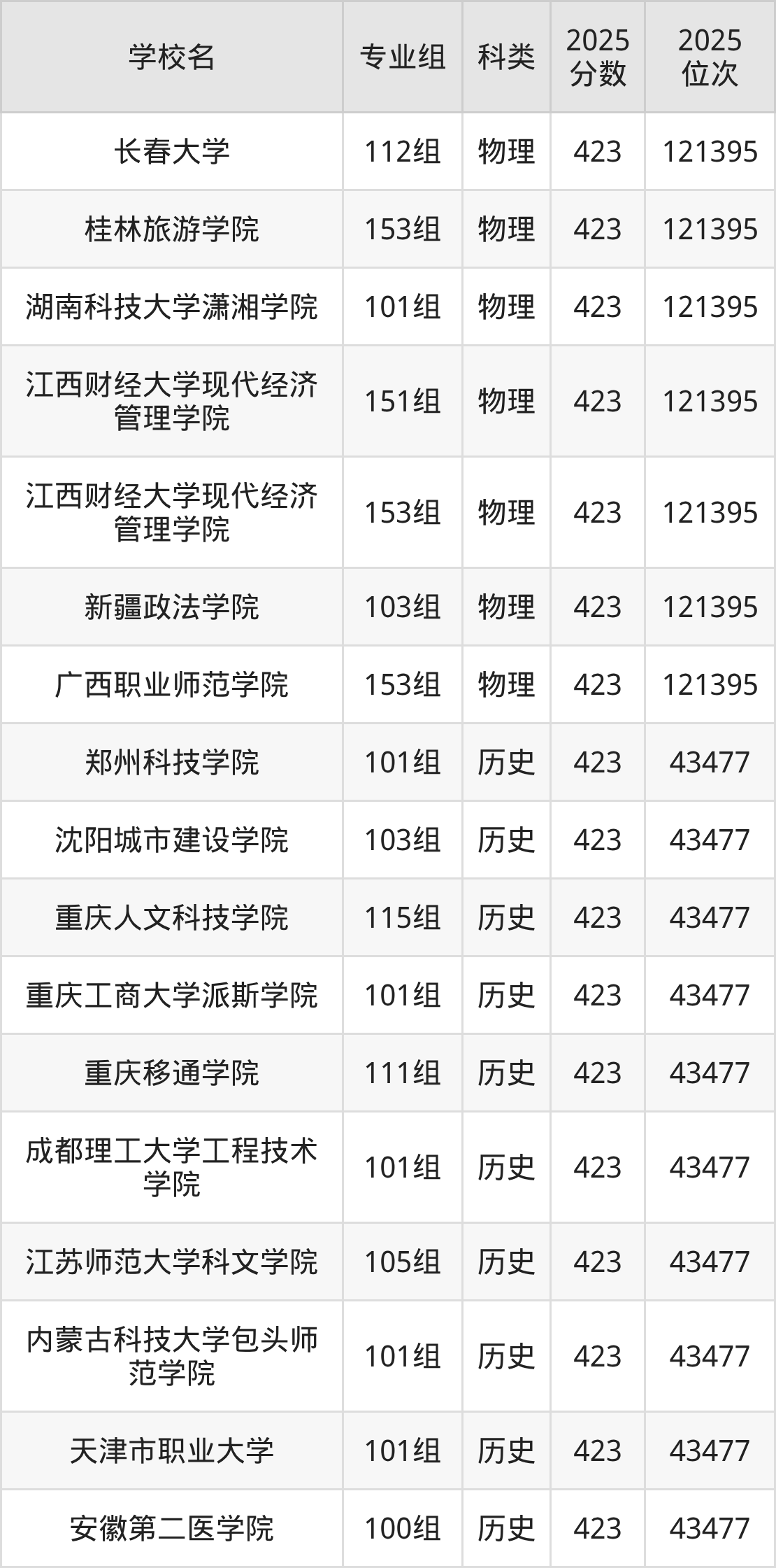 广西高考物理类423分对应的位次排名是121395名,历史类423分对应的位次排名是43477名,因此建议2026年位次排在这附近的同学考虑这些大学。