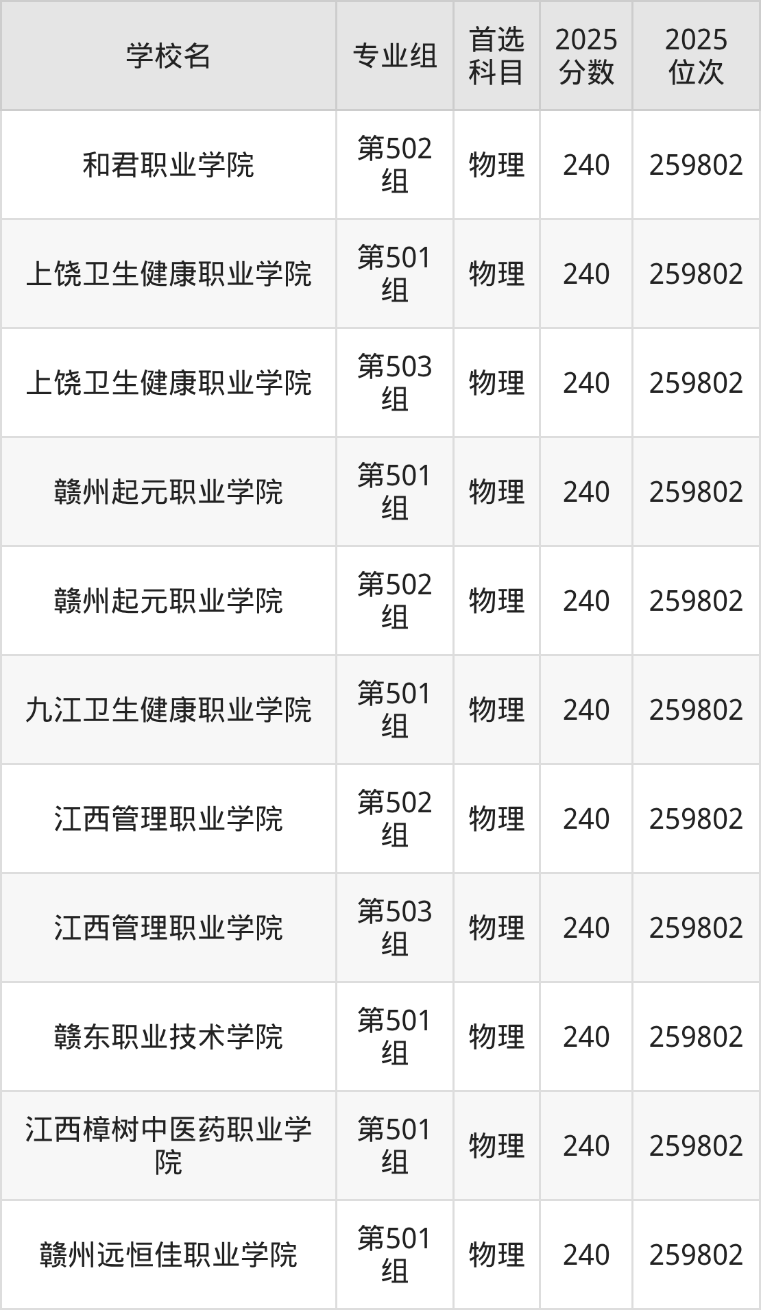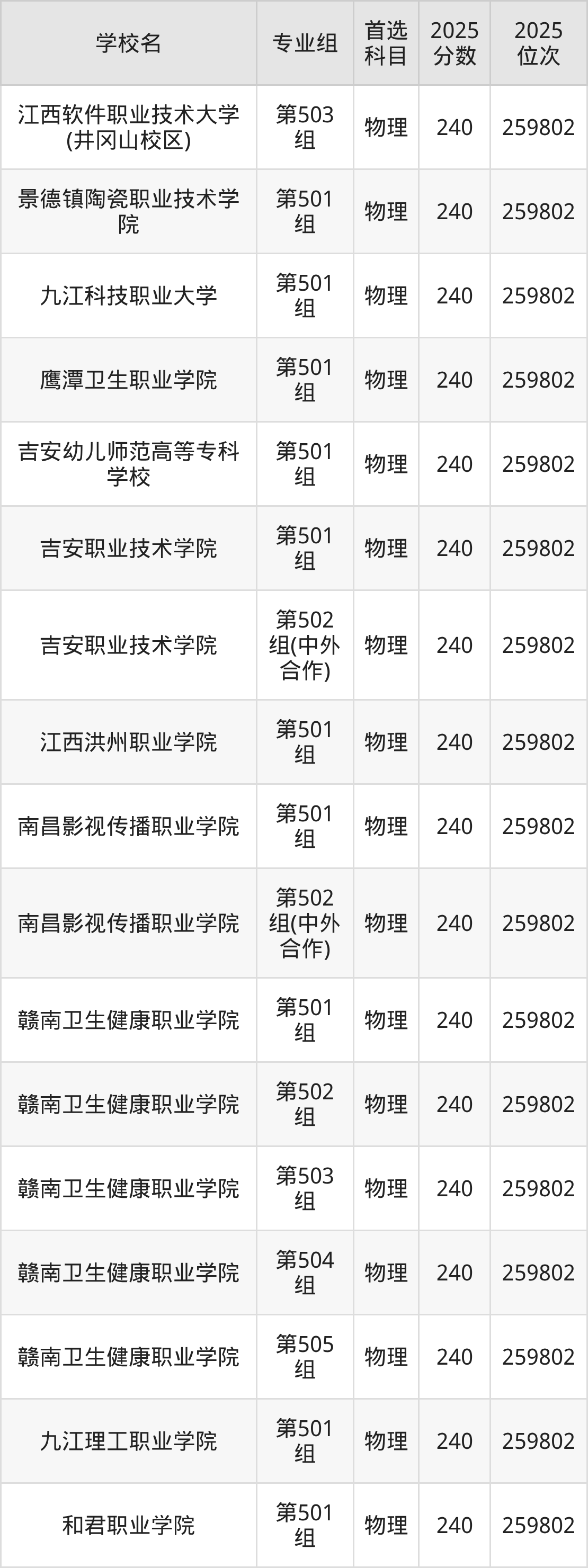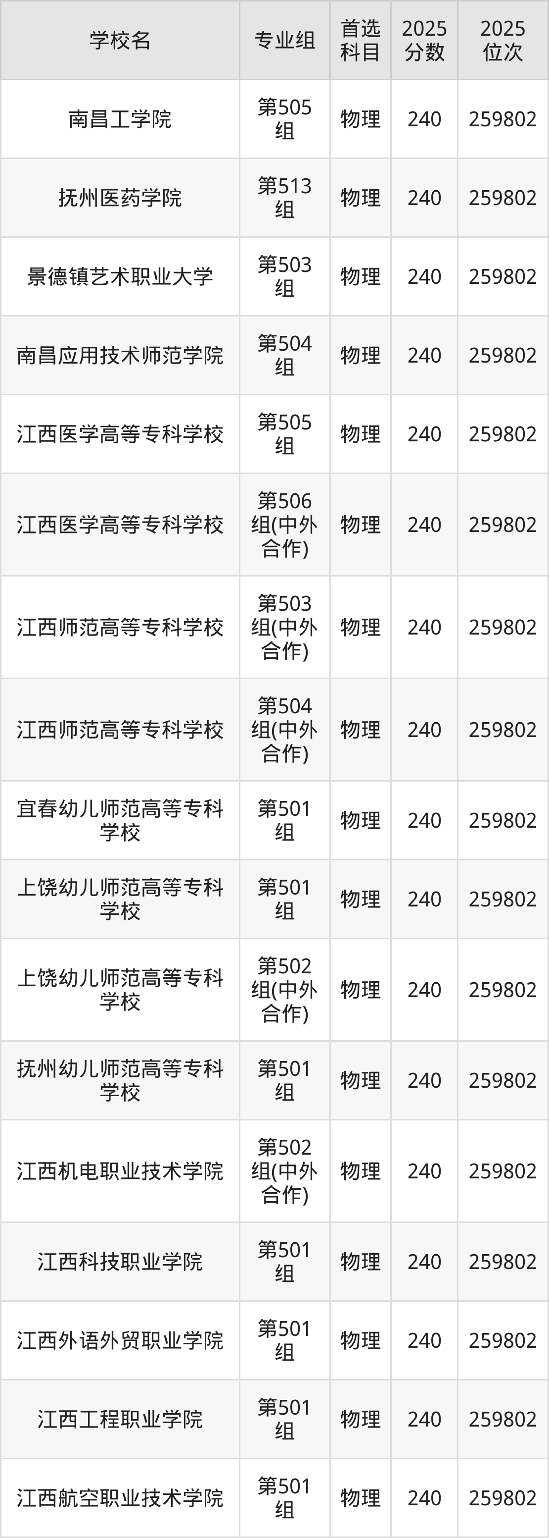 江西物理类240分对应的位次排名是259684名-259802名,因此建议2026年位次排在这附近的考生考虑这些大学。