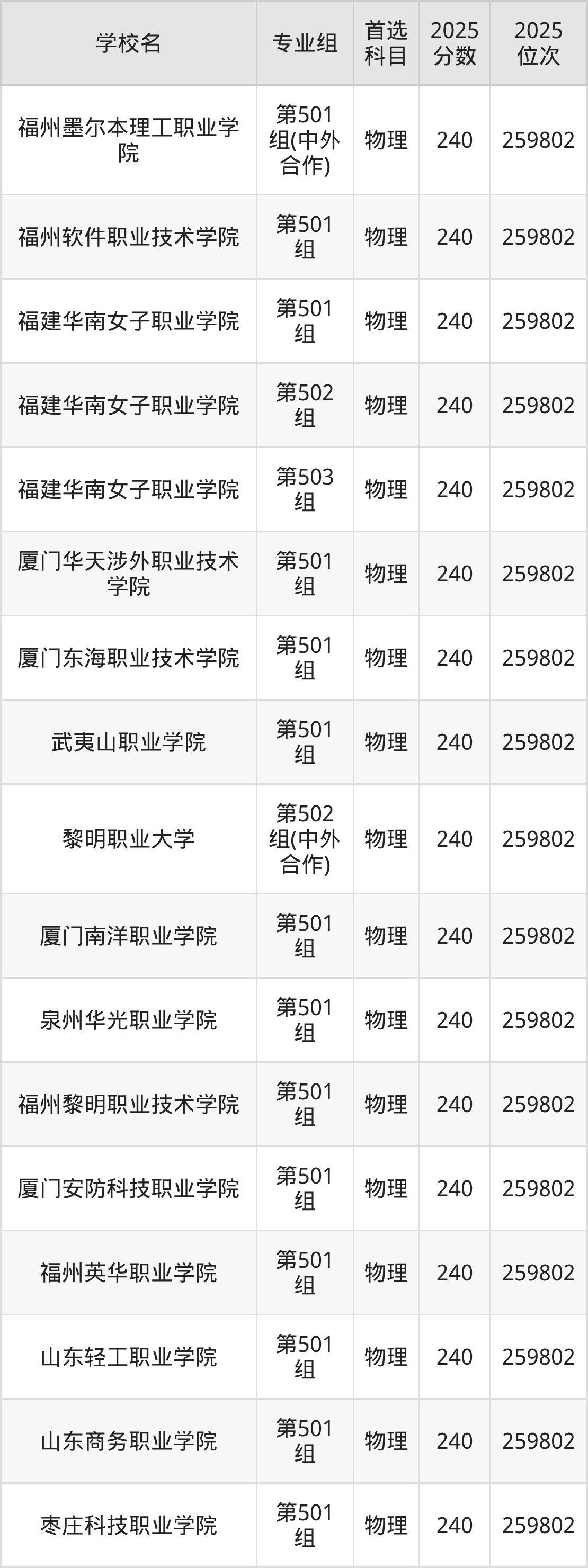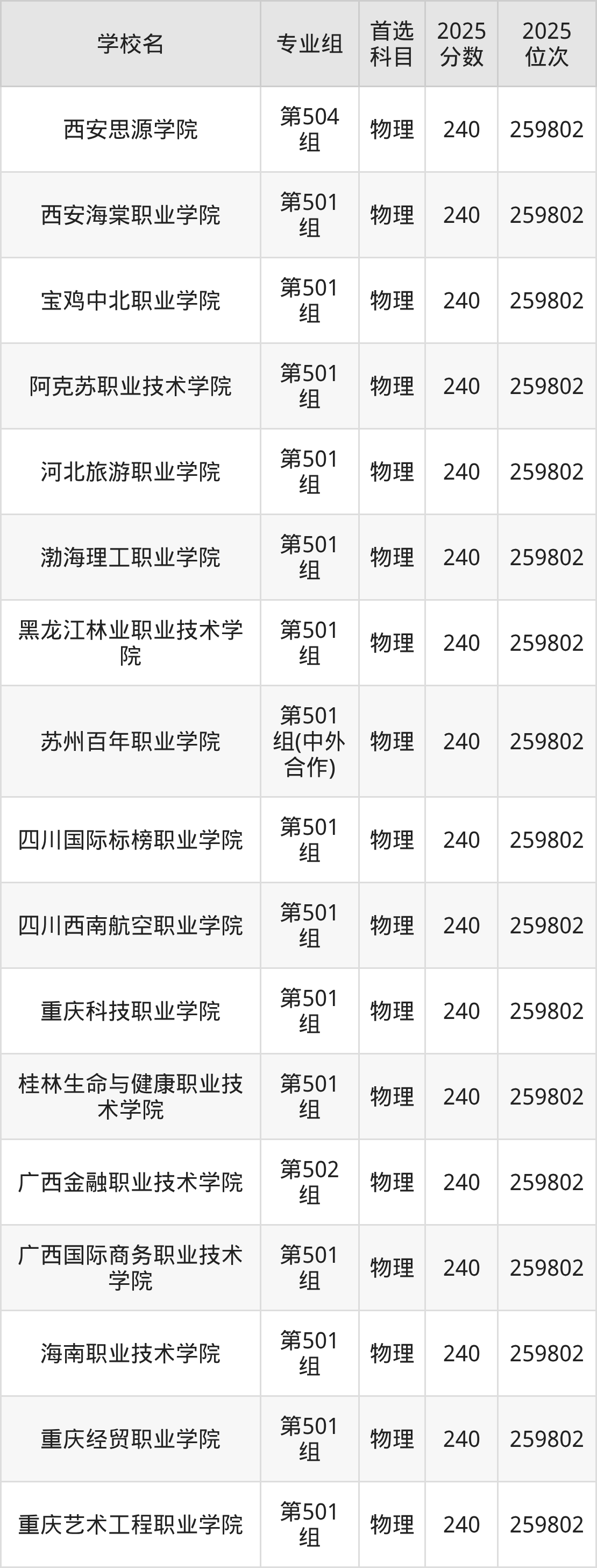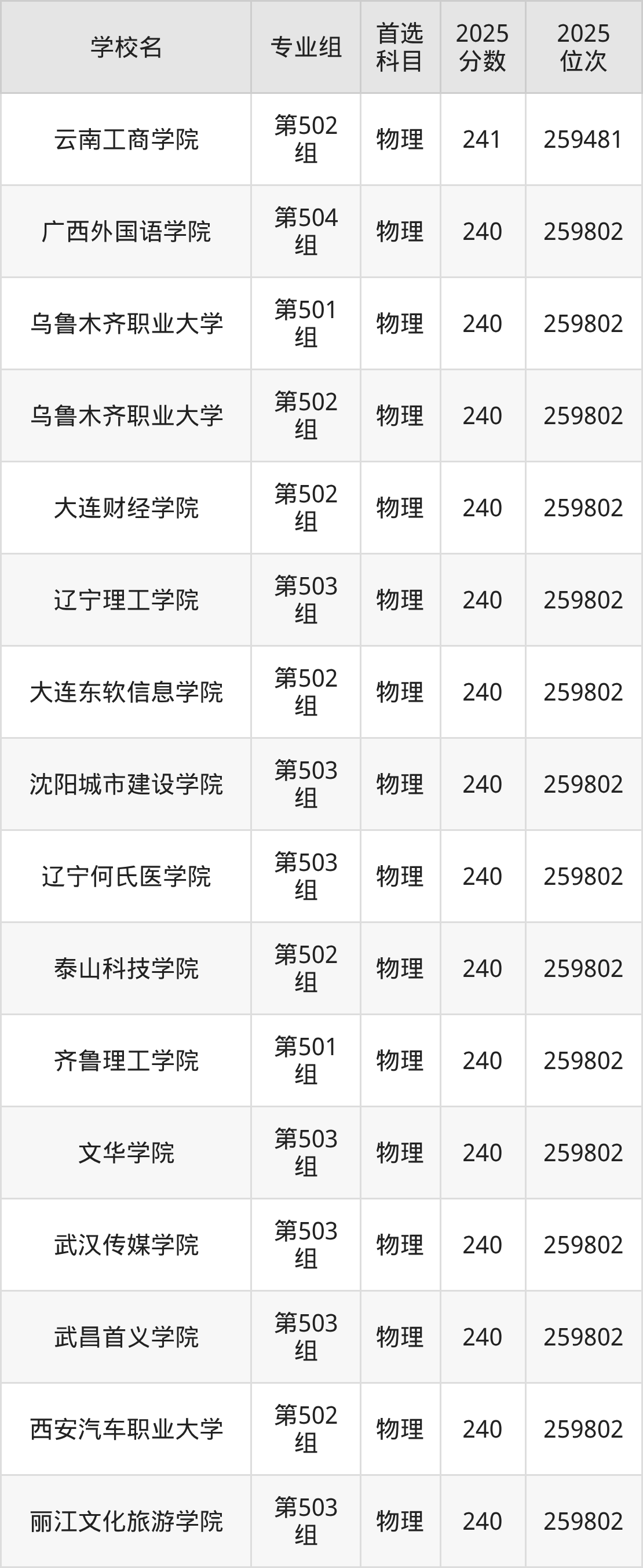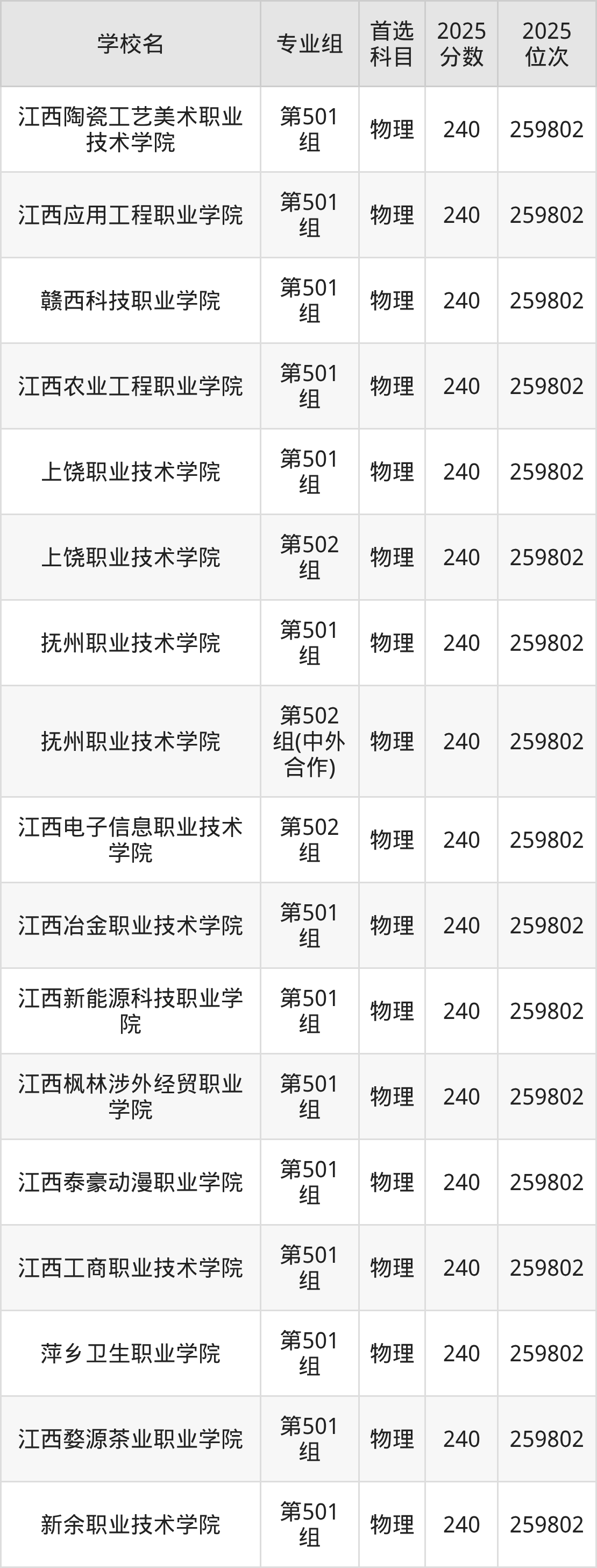 江西物理类240分对应的位次排名是259684名-259802名,因此建议2026年位次排在这附近的考生考虑这些大学。