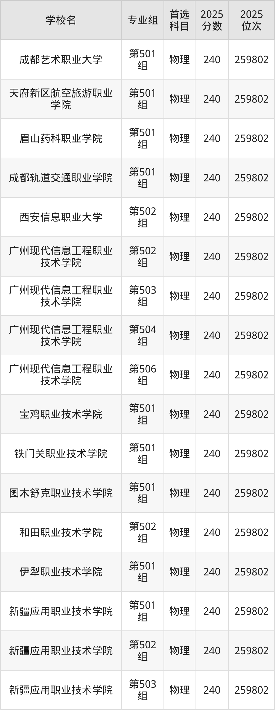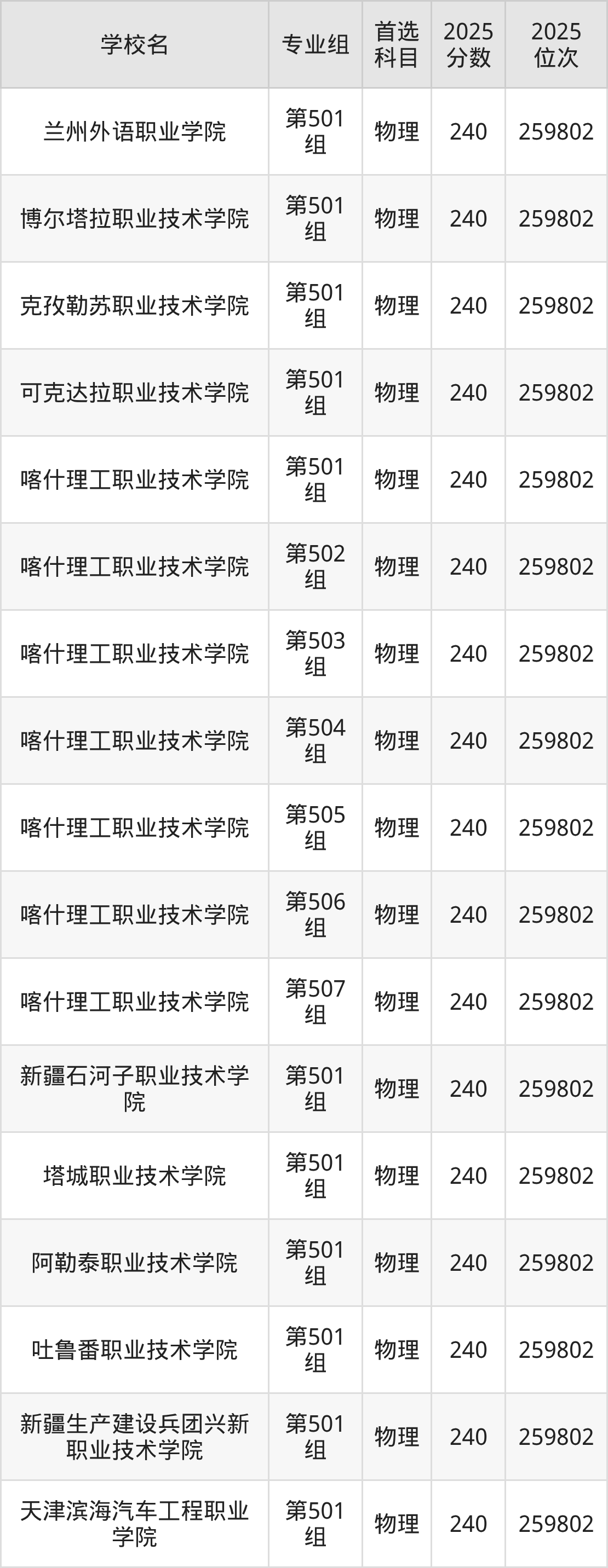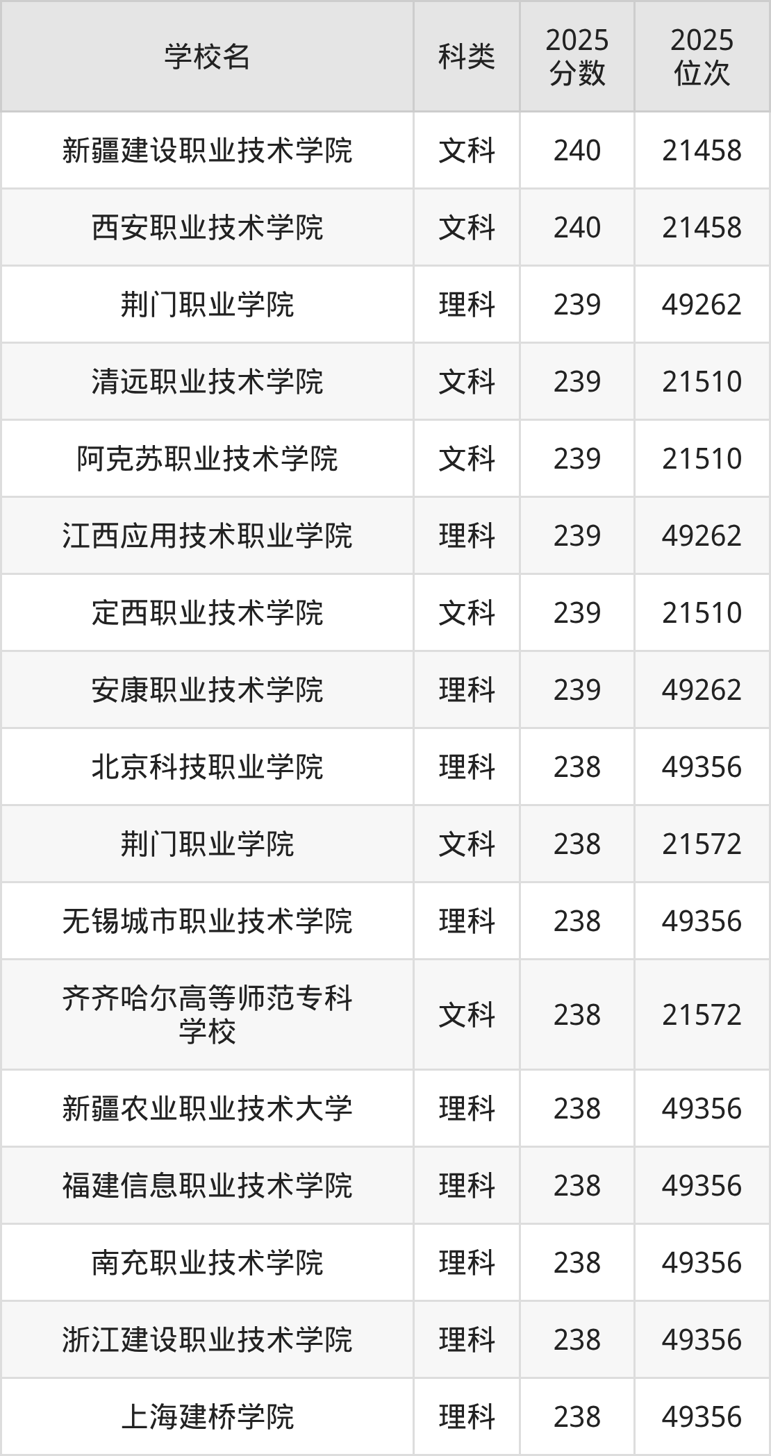 2025年在新疆高考理科录取分数线是240分的大学有天津机电职业技术学院、铁岭卫生职业学院、包头铁道职业技术学院、浙江旅游职业学院、浙江商业职业技术学院。文科录取分数线是240分的大学有新疆建设职业技术学院、西安职业技术学院。
