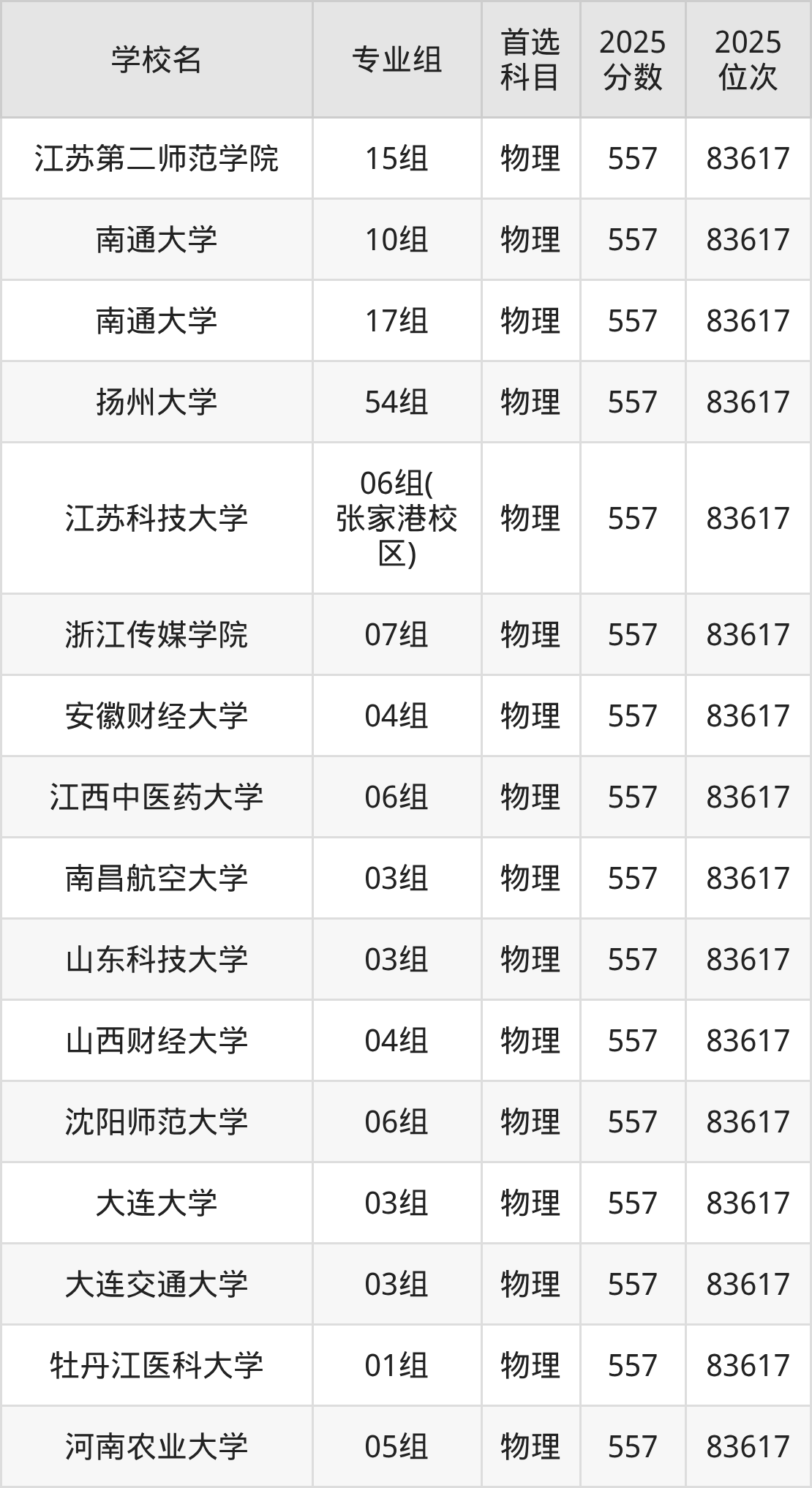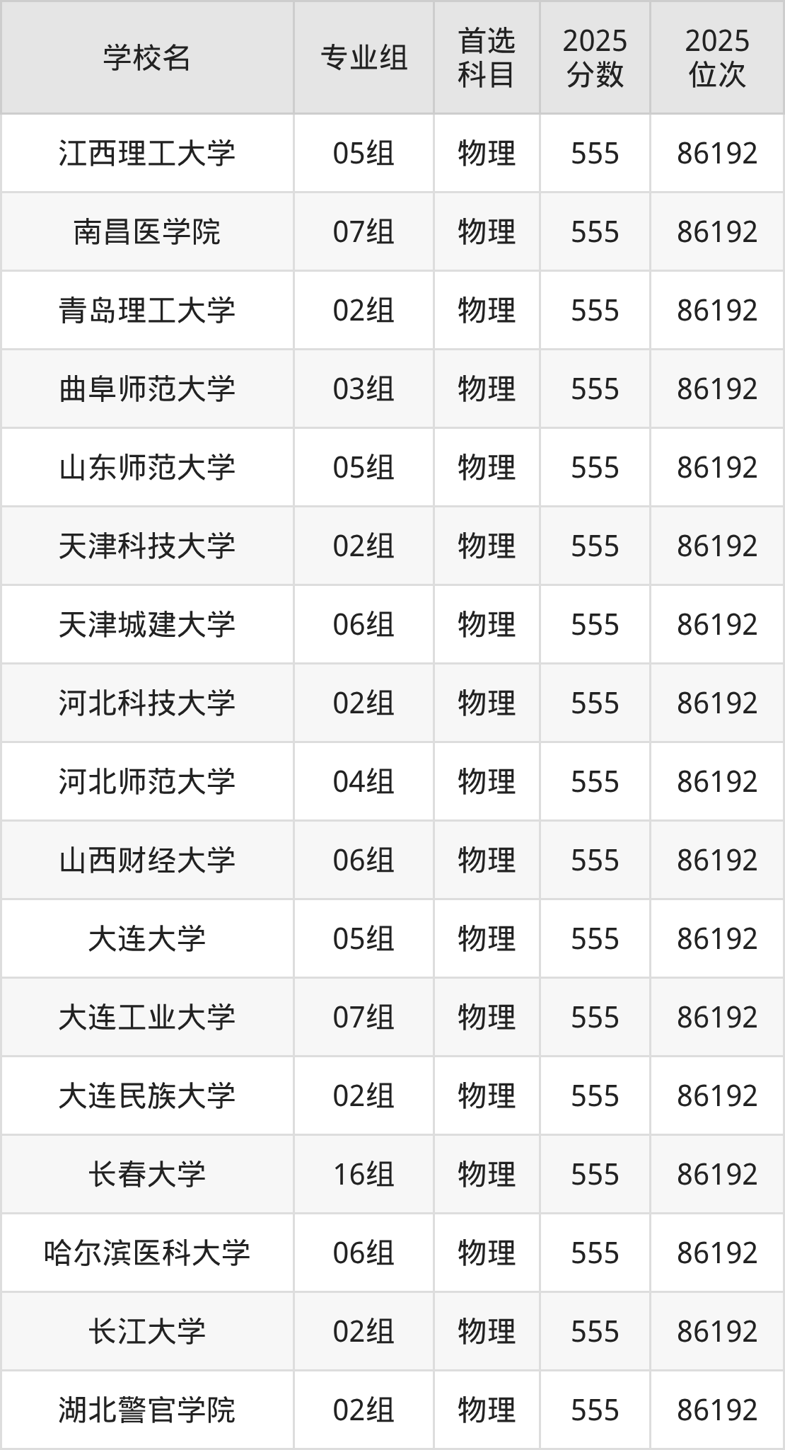 江苏高考物理类555分对应的位次排名是86192名,历史类555分对应的位次排名是101名-21405名,因此建议2026年位次排在这附近的同学考虑这些大学。
