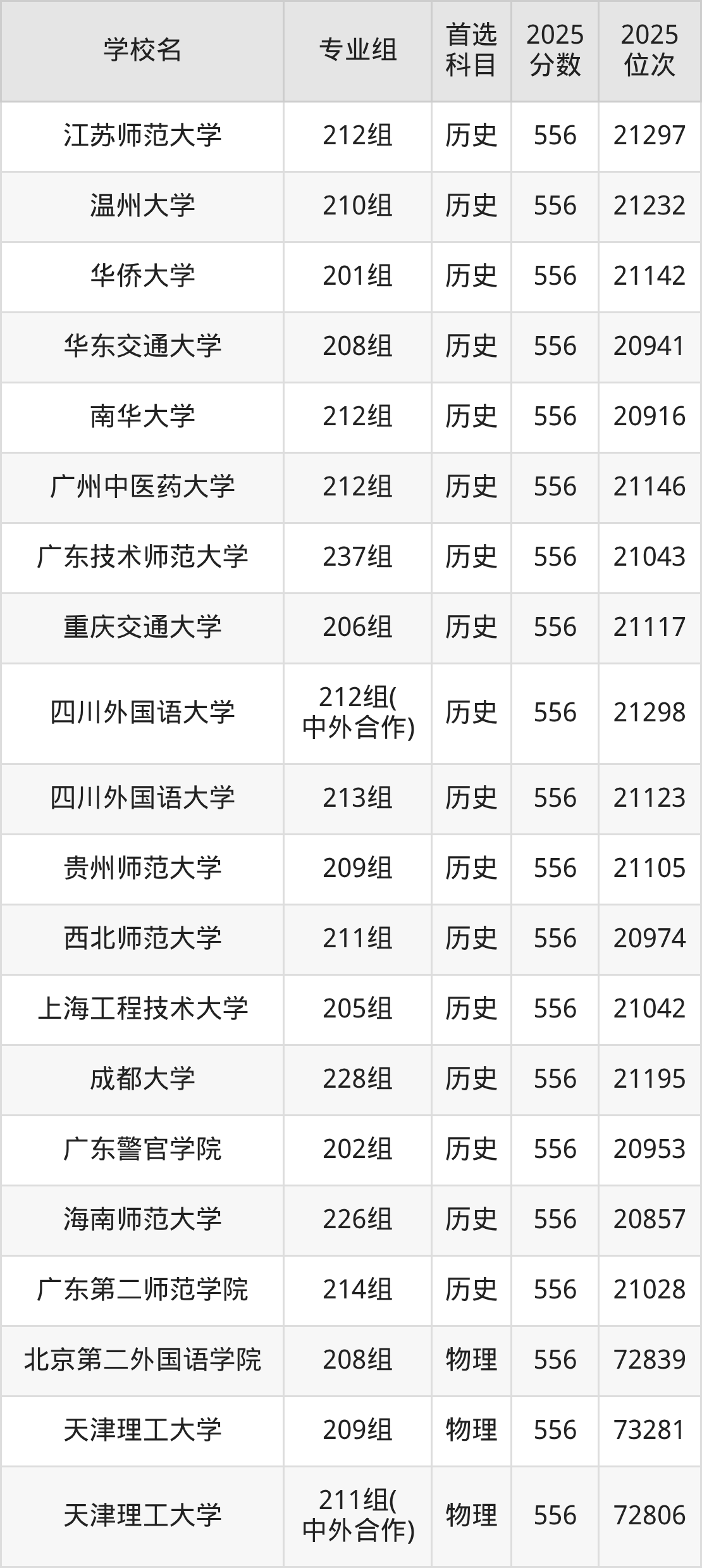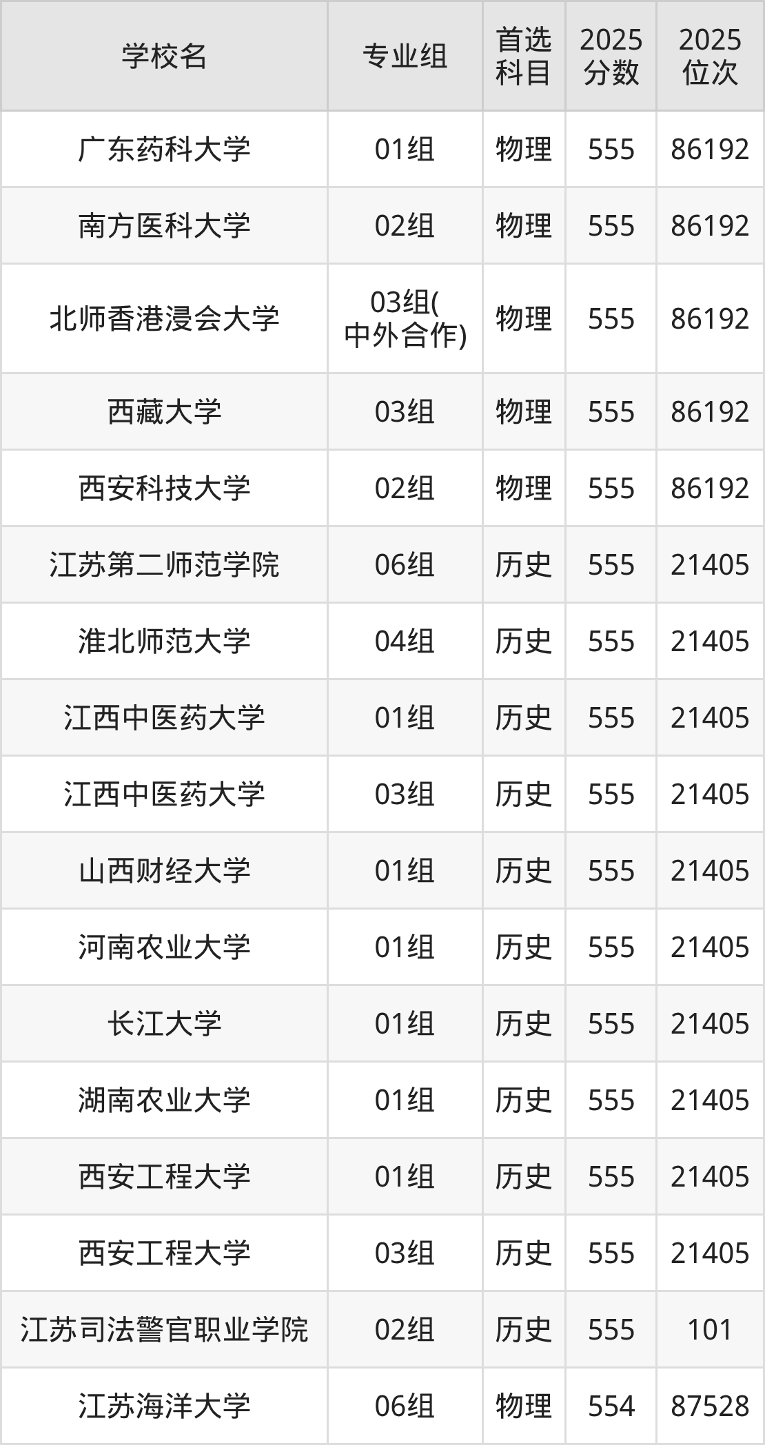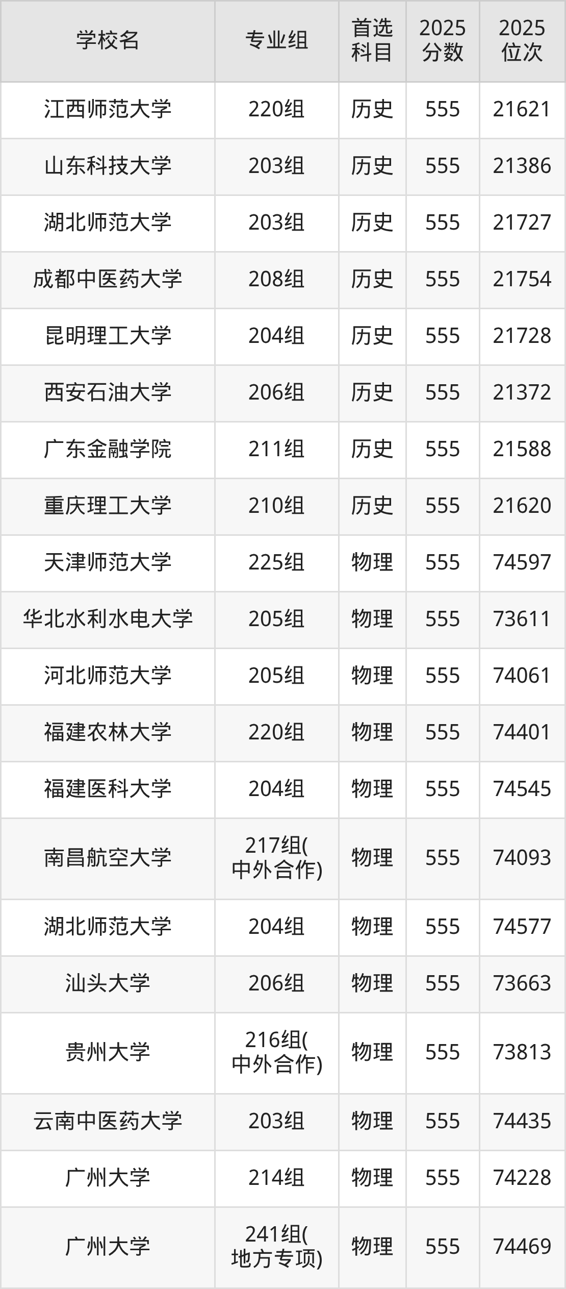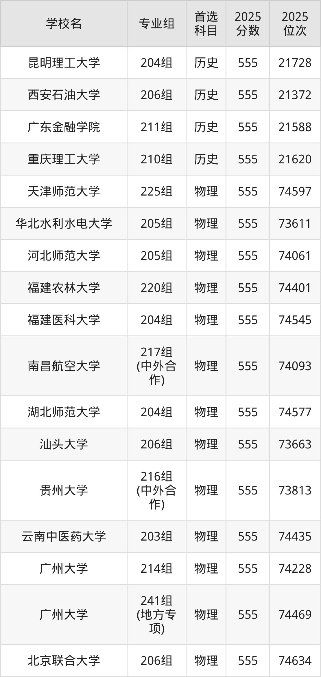 广东高考历史类555分对应的位次排名是21308名-21754名,物理类555分对应的位次排名是73537名-74634名,因此建议2026年位次排在这附近的同学考虑这些大学。