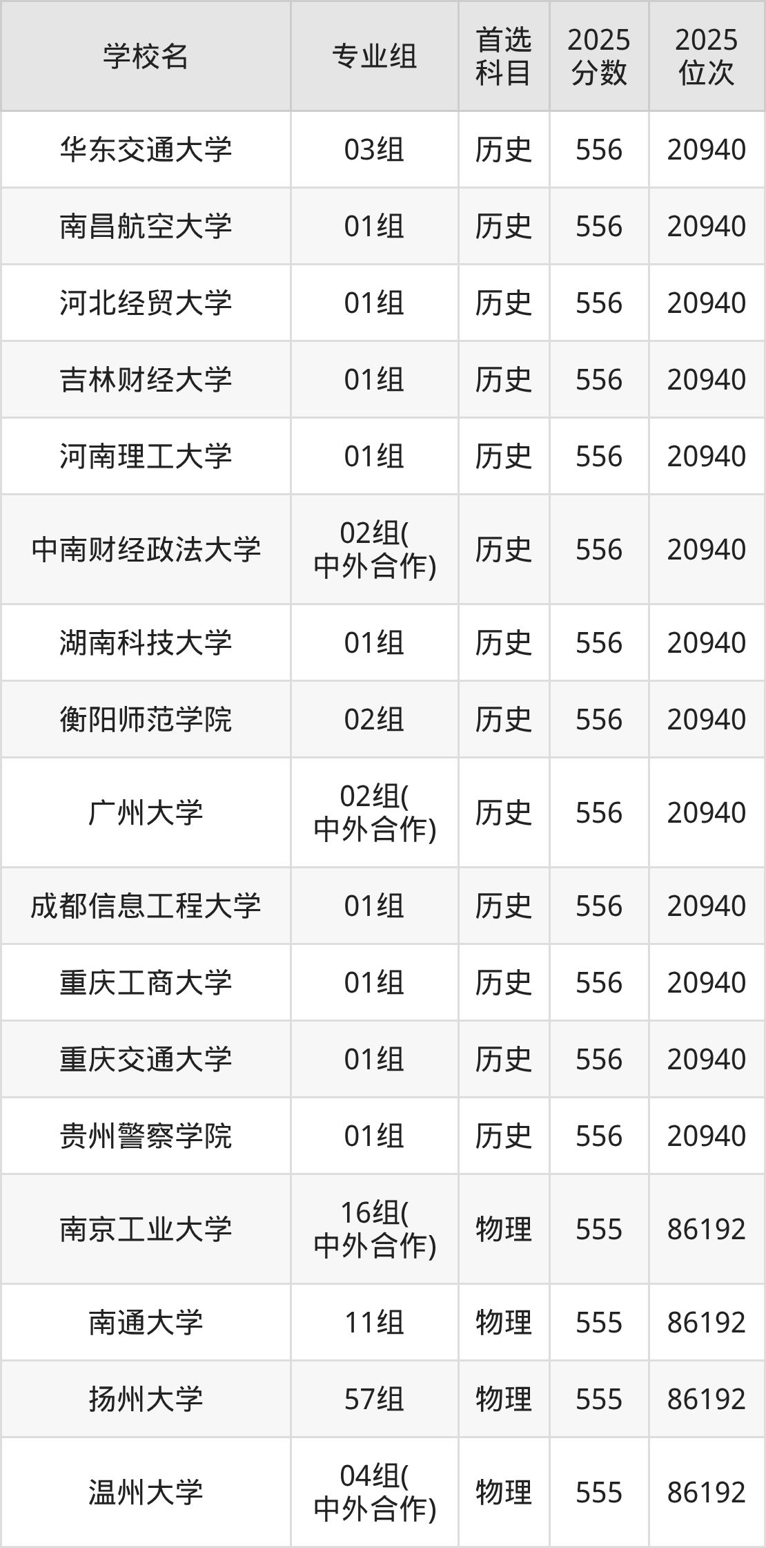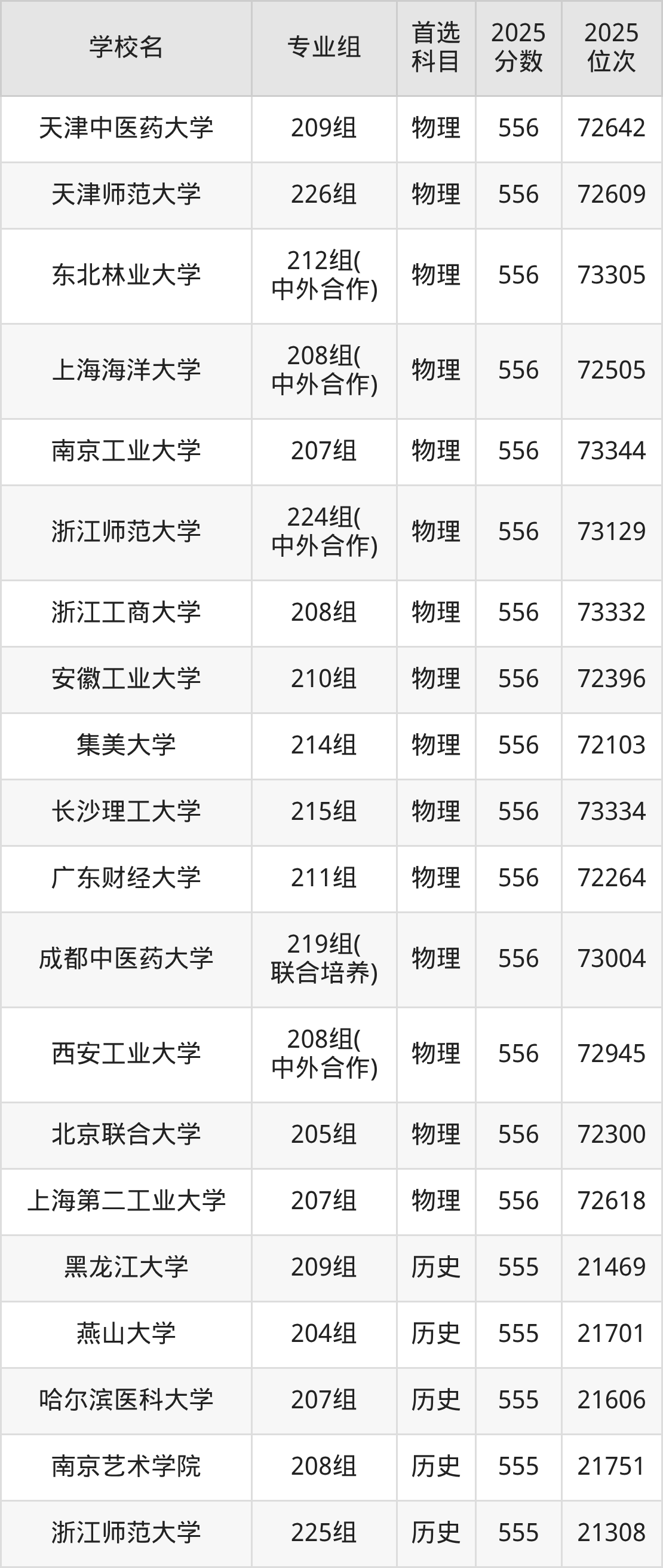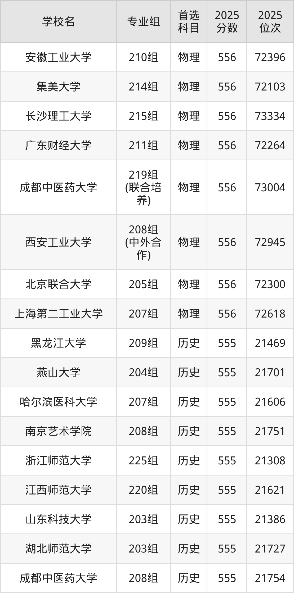 广东高考历史类555分对应的位次排名是21308名-21754名,物理类555分对应的位次排名是73537名-74634名,因此建议2026年位次排在这附近的同学考虑这些大学。