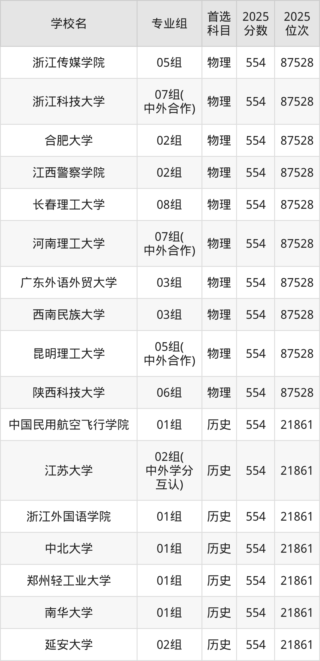 历史类555分可以冲的大学:南京工程学院557分、南京财经大学557分、江苏第二师范学院557分、徐州医科大学557分等;较稳妥的大学:中国民用航空飞行学院554分、江苏大学554分、浙江外国语学院554分、中北大学554分等。
