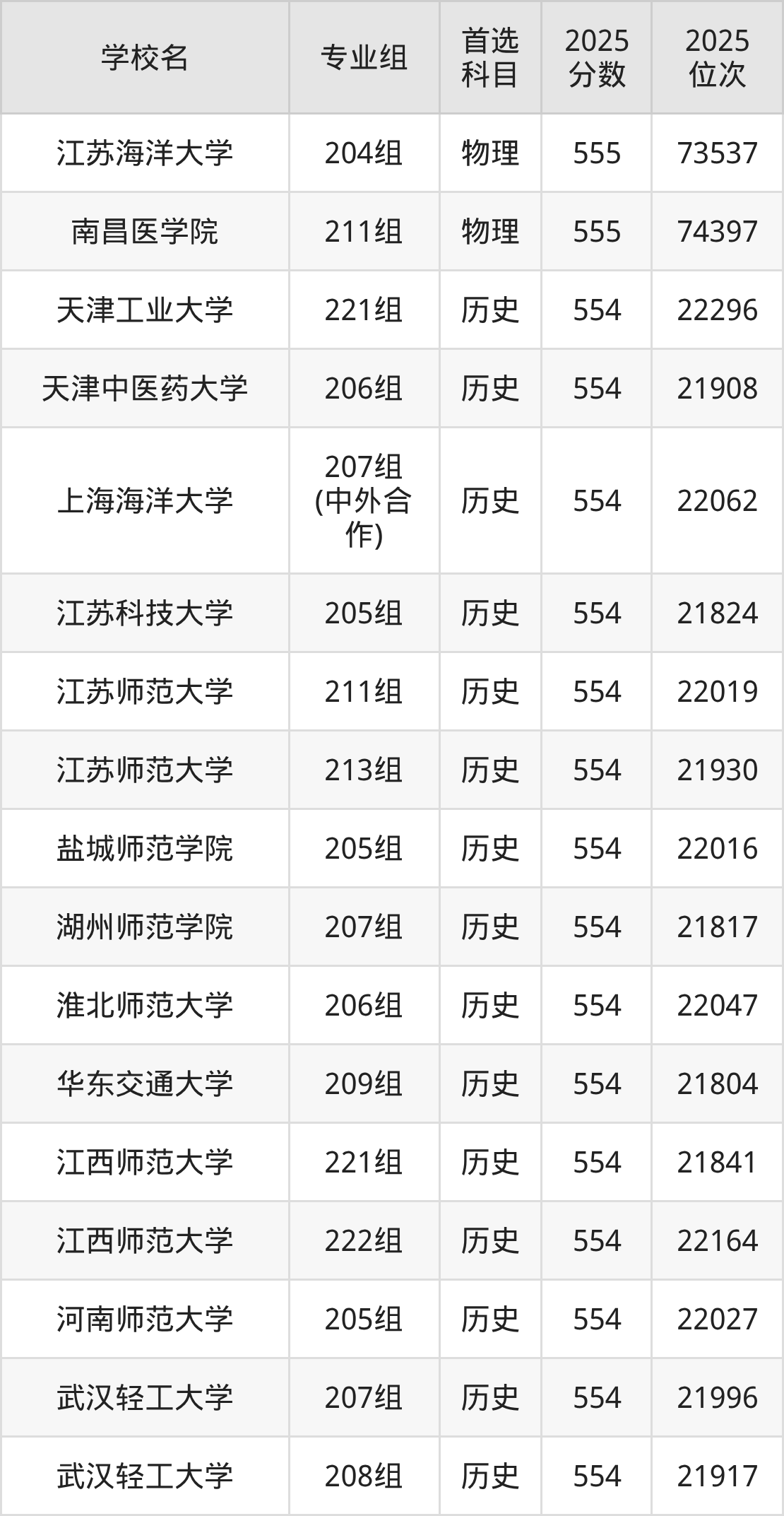 2025年在江苏高考物理类录取分数线是555分的大学有南京工业大学、南通大学、扬州大学、温州大学、江西理工大学、南昌医学院、青岛理工大学、曲阜师范大学、山东师范大学、天津科技大学等。历史类录取分数线是555分的大学有江苏第二师范学院、淮北师范大学、江西中医药大学、山西财经大学、河南农业大学、长江大学、湖南农业大学、西安工程大学、江苏司法警官职业学院。