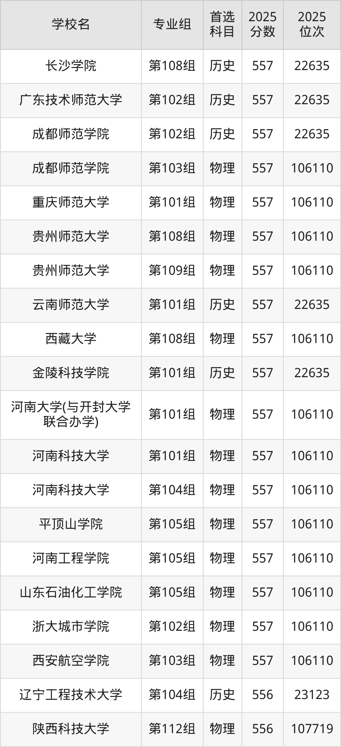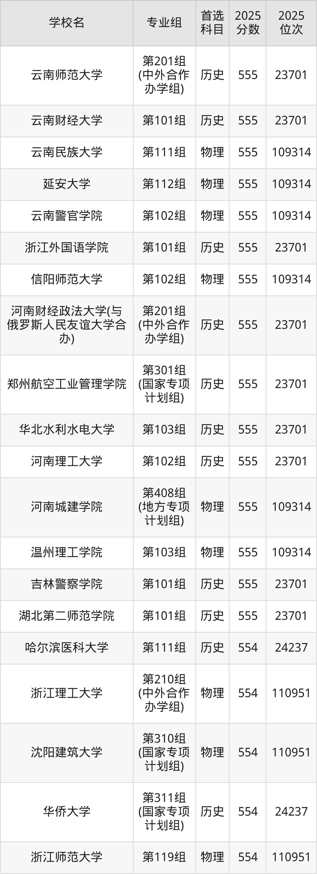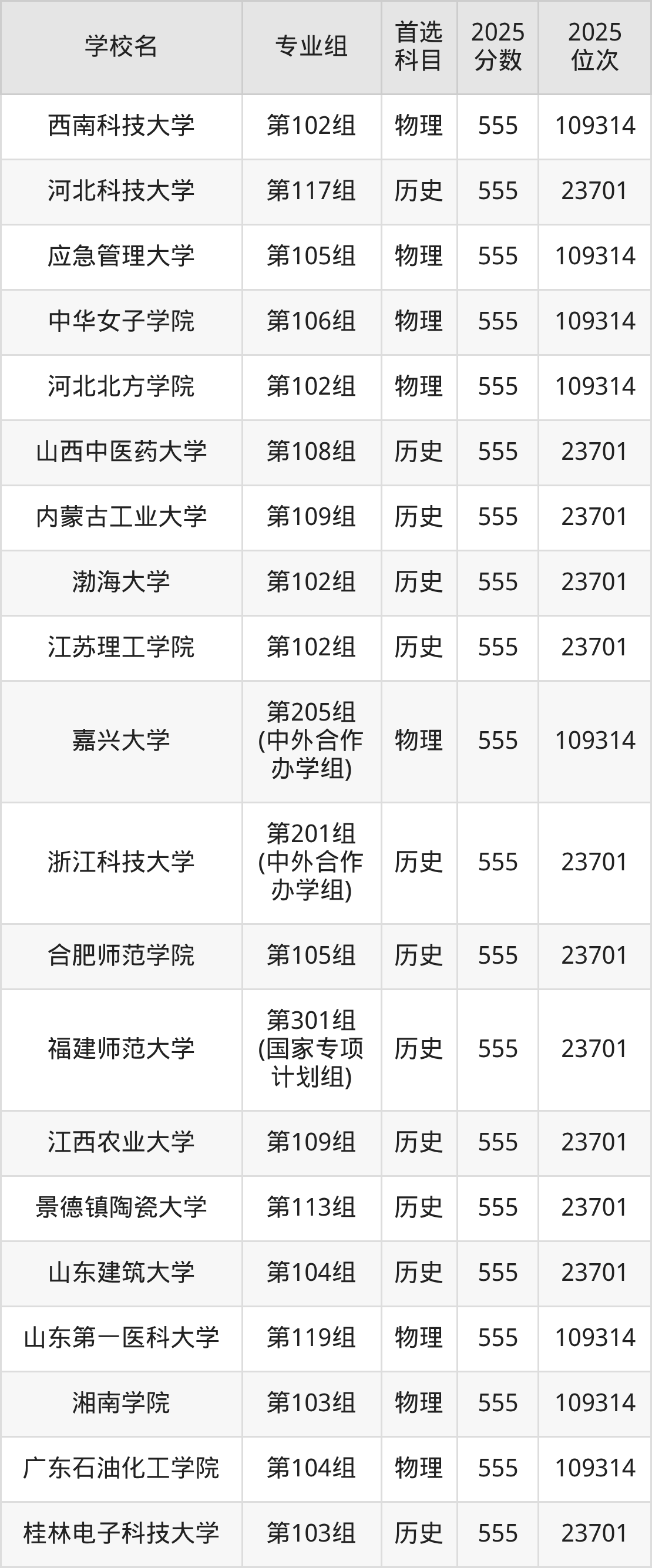 河南高考物理类555分对应的位次排名是109314名,历史类555分对应的位次排名是23701名,因此建议2026年位次排在这附近的同学考虑这些大学。