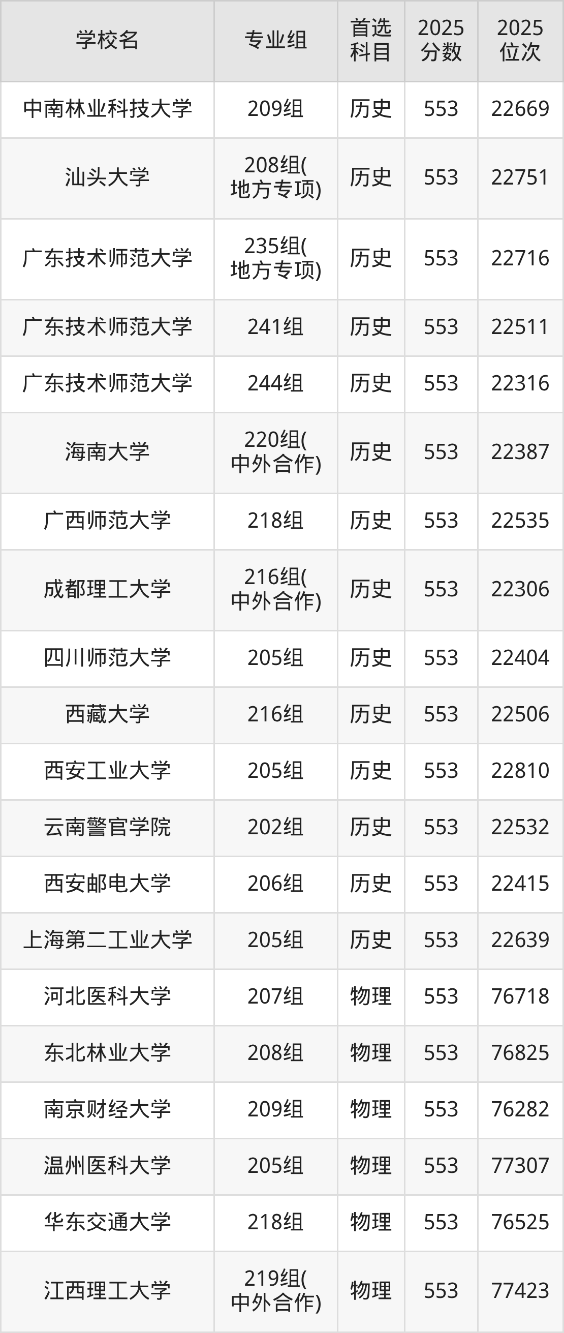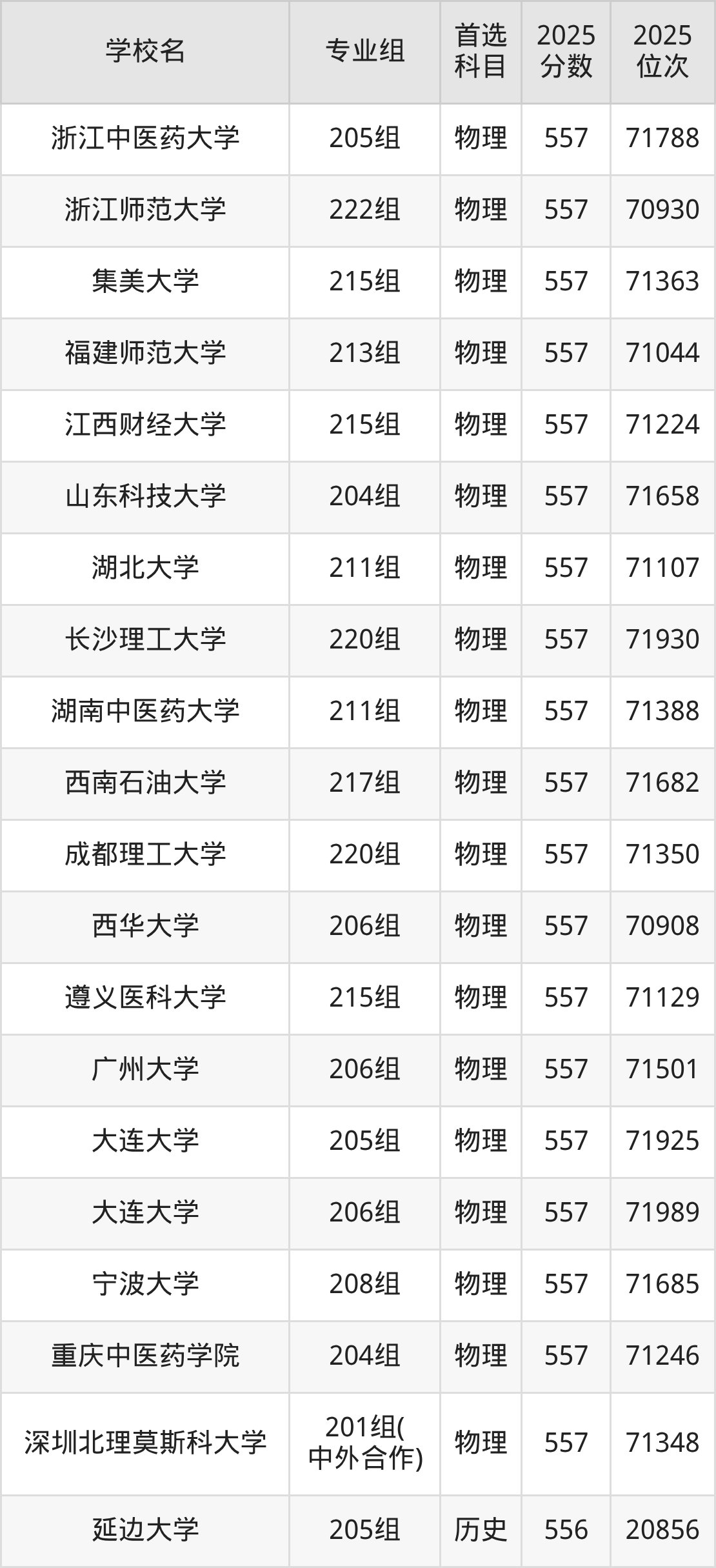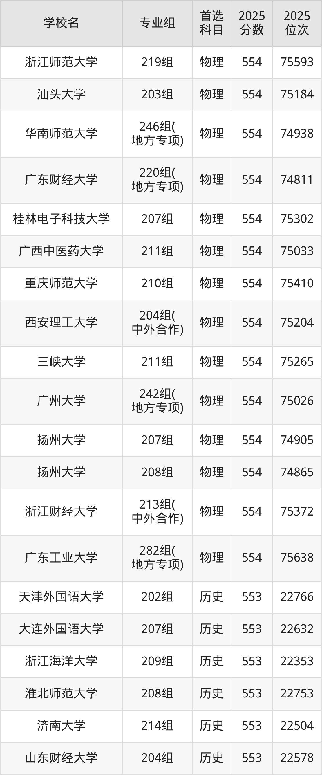 2025年在广东高考历史类录取分数线是555分的大学有黑龙江大学、燕山大学、哈尔滨医科大学、南京艺术学院、浙江师范大学、江西师范大学、山东科技大学、湖北师范大学、成都中医药大学、昆明理工大学等。物理类录取分数线是555分的大学有天津师范大学、华北水利水电大学、河北师范大学、福建农林大学、福建医科大学、南昌航空大学、湖北师范大学、汕头大学、贵州大学、云南中医药大学等。