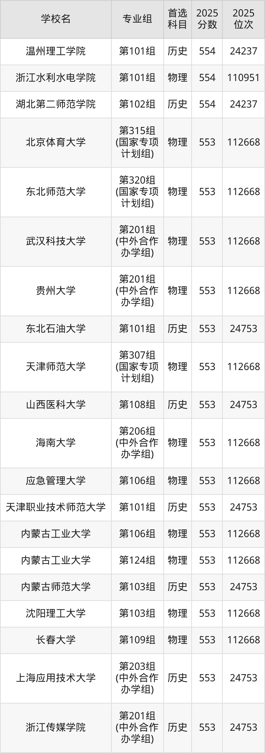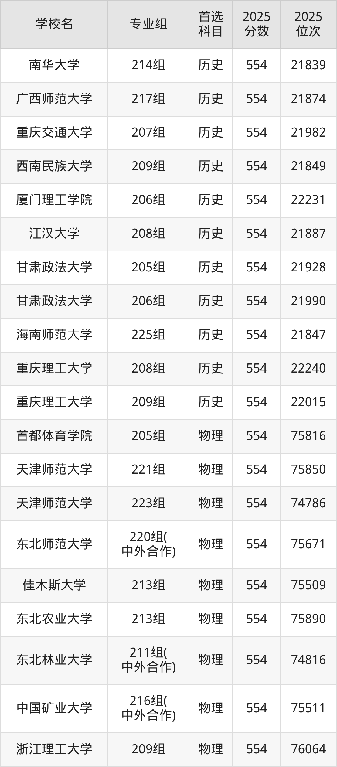物理类555分可以冲的大学:北京建筑大学557分、天津科技大学557分、河北工程大学557分、南京林业大学557分等;较稳妥的大学:首都体育学院554分、天津师范大学554分、东北师范大学554分、佳木斯大学554分等。