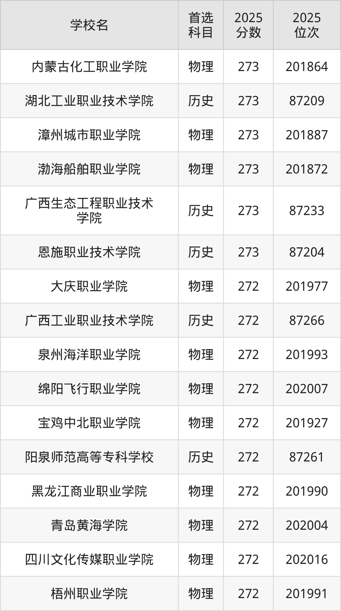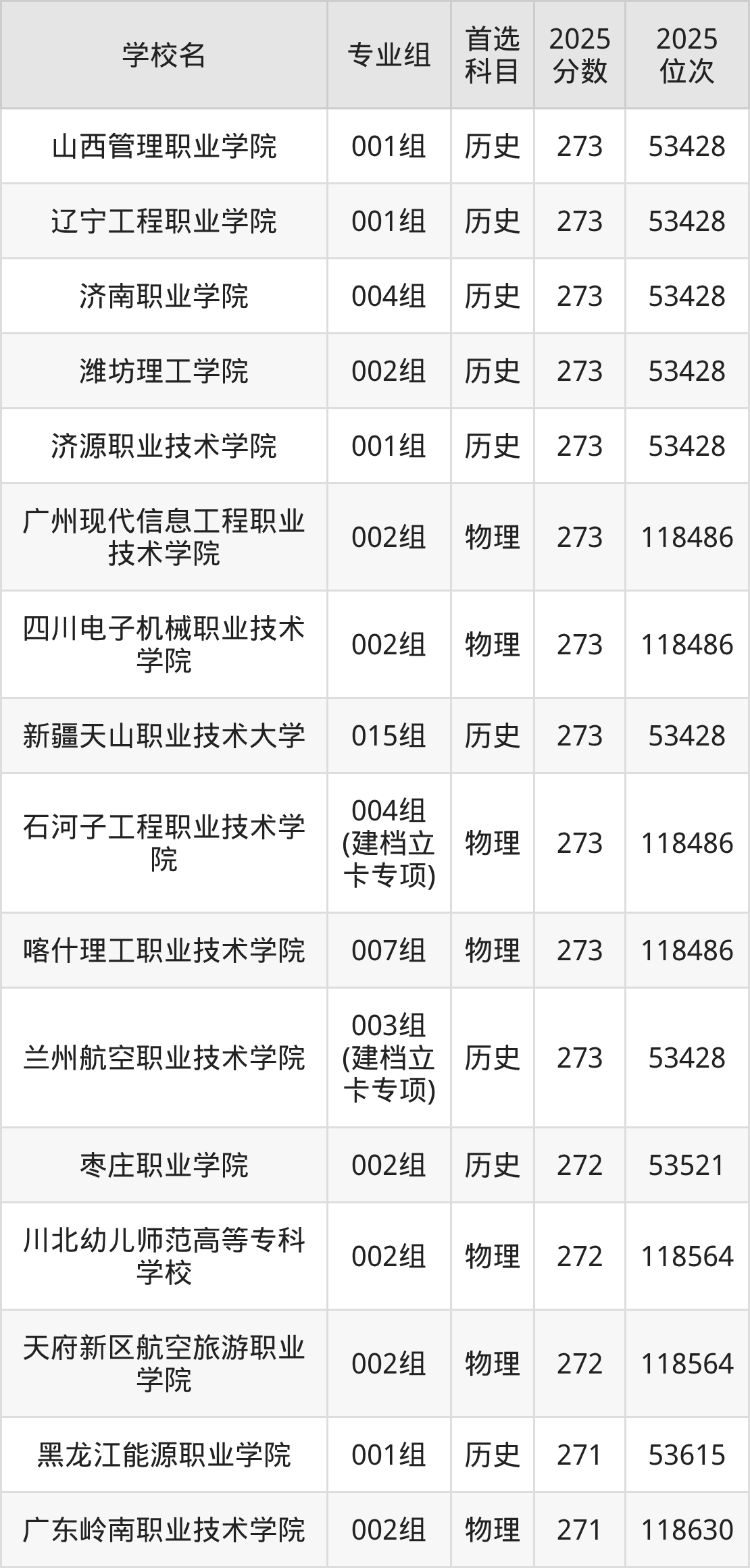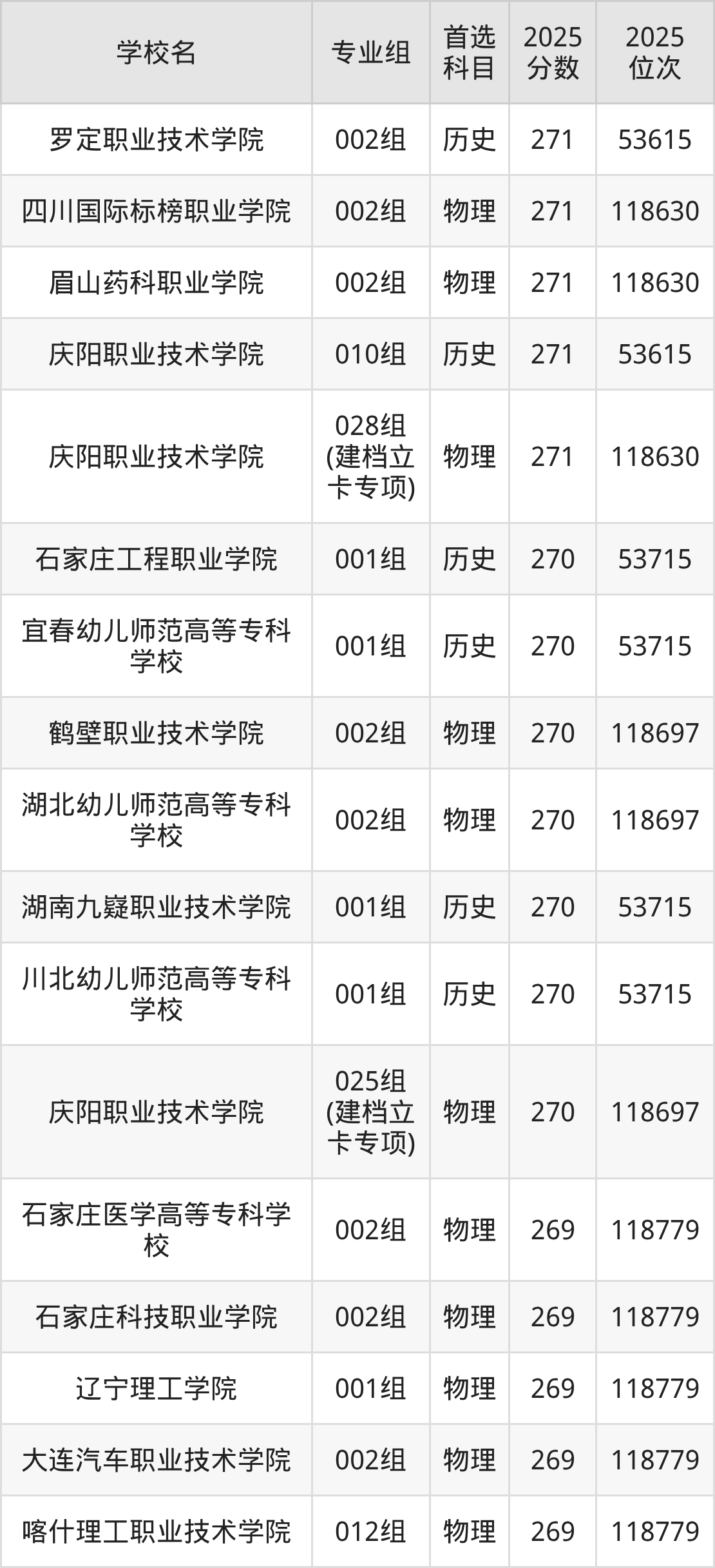 2025年在甘肃高考历史类录取分数线是271分的大学有黑龙江能源职业学院、罗定职业技术学院、庆阳职业技术学院。物理类录取分数线是271分的大学有广东岭南职业技术学院、四川国际标榜职业学院、眉山药科职业学院、庆阳职业技术学院。