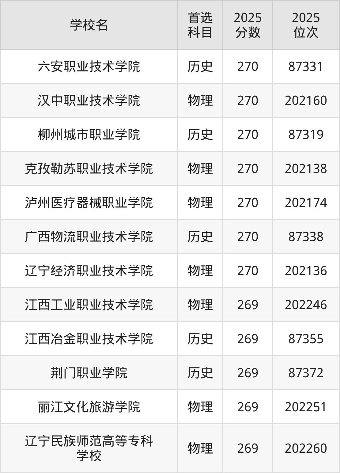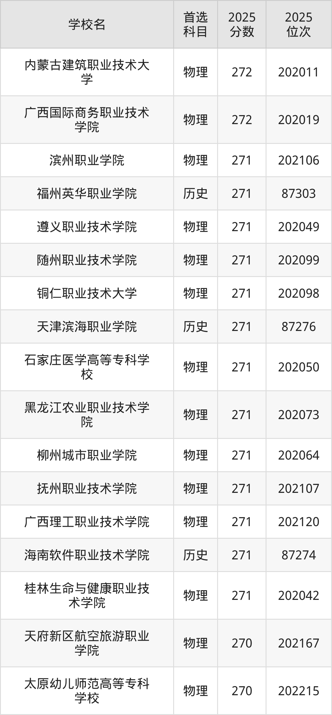 2025年在贵州高考物理类录取分数线是271分的大学有滨州职业学院、遵义职业技术学院、随州职业技术学院、铜仁职业技术大学、石家庄医学高等专科学校、黑龙江农业职业技术学院、柳州城市职业学院、抚州职业技术学院、广西理工职业技术学院、桂林生命与健康职业技术学院。历史类录取分数线是271分的大学有福州英华职业学院、天津滨海职业学院、海南软件职业技术学院。