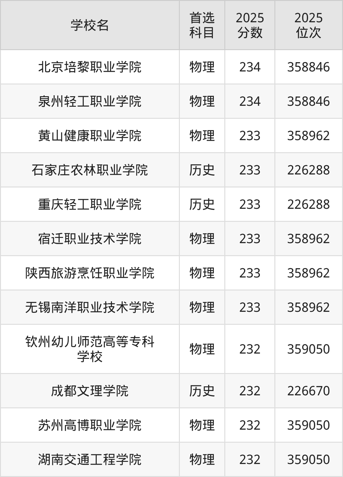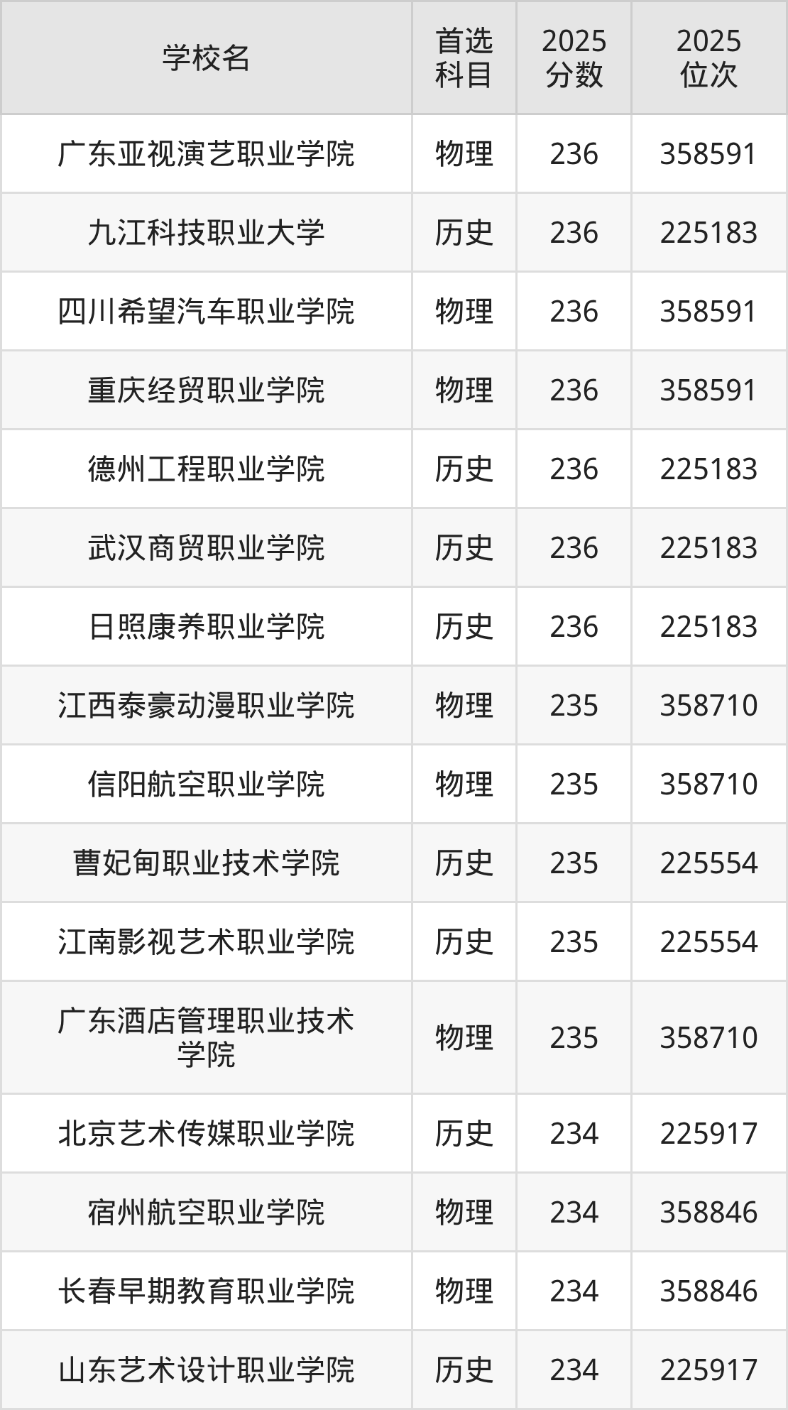 2025年在河北高考历史类录取分数线是234分的大学有北京艺术传媒职业学院、山东艺术设计职业学院。物理类录取分数线是234分的大学有宿州航空职业学院、长春早期教育职业学院、北京培黎职业学院、泉州轻工职业学院。