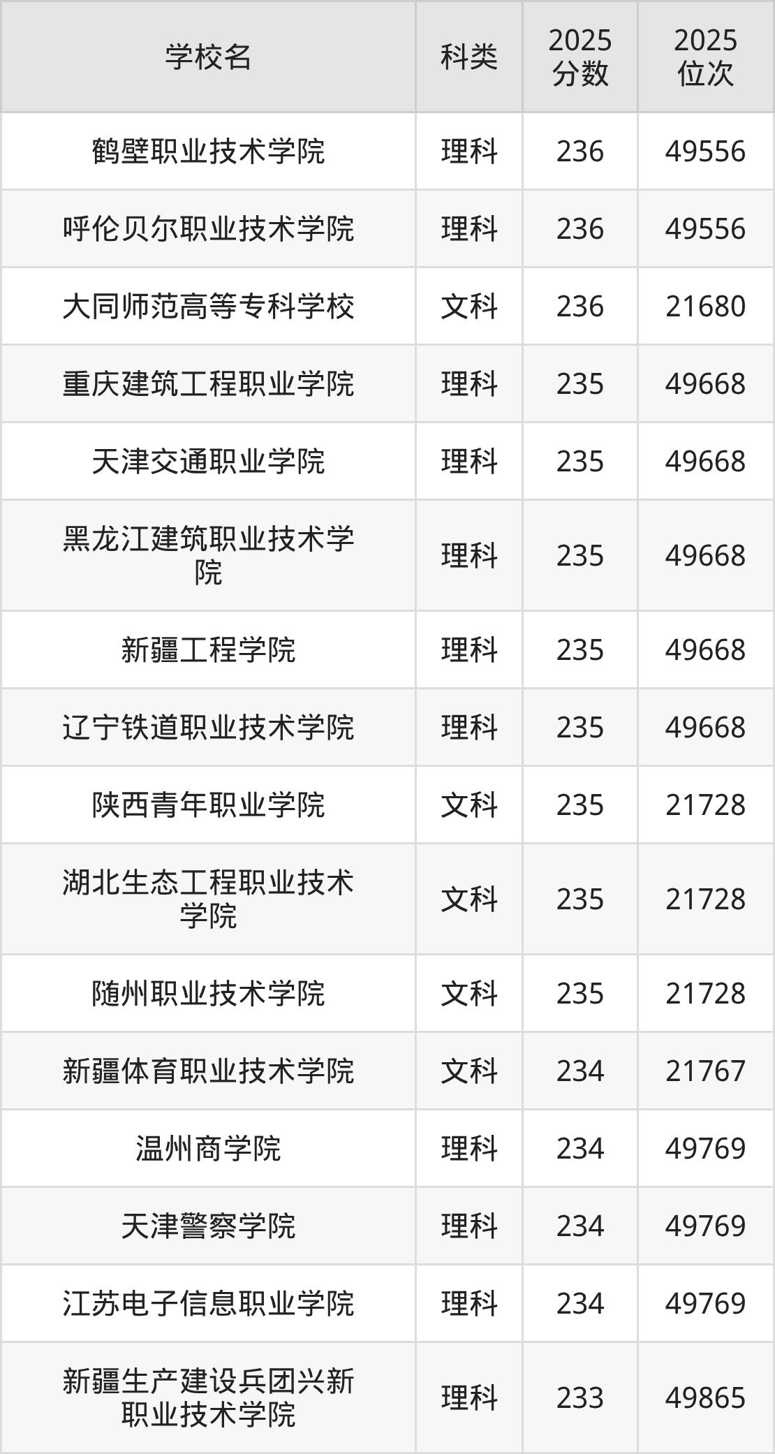 2025年在新疆高考文科录取分数线是234分的大学有新疆体育职业技术学院。理科录取分数线是234分的大学有温州商学院、天津警察学院、江苏电子信息职业学院。