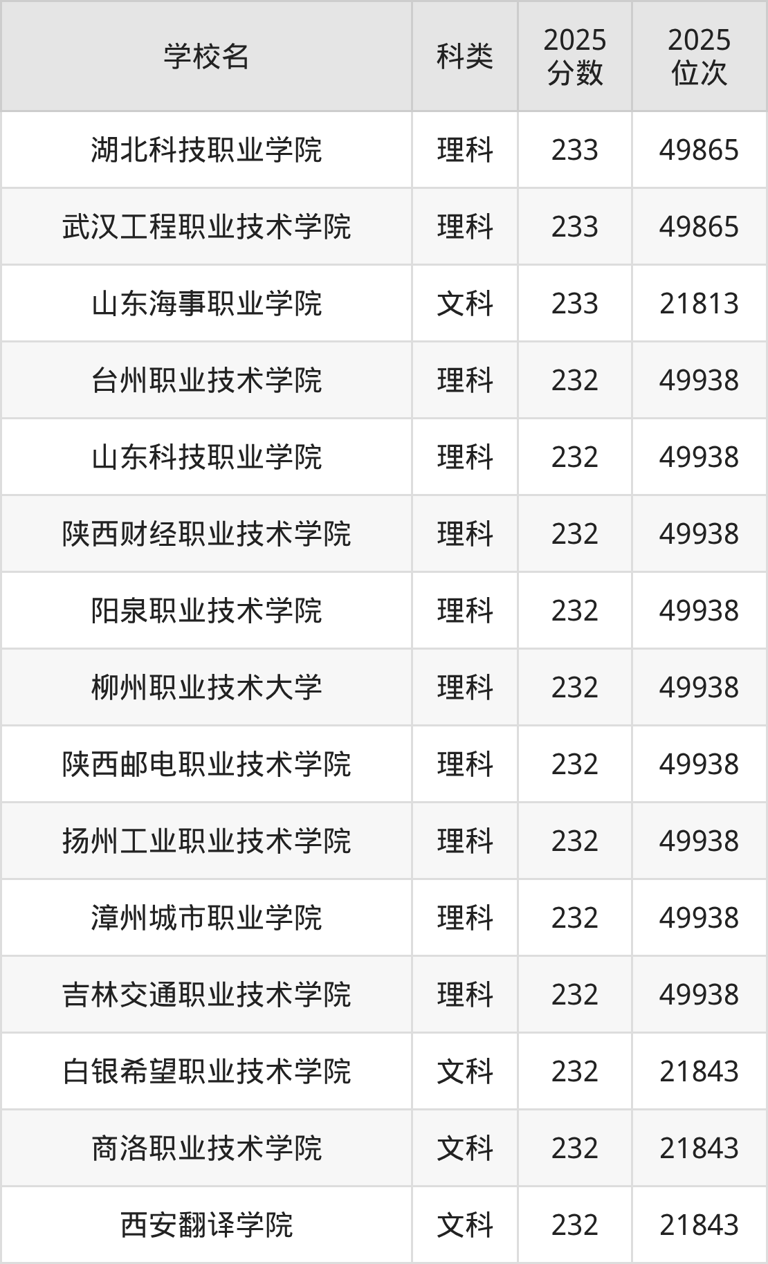 下面老师将以上文整理的其中两个省份为例,为大家具体展示234分左右能上的专科大学名单。