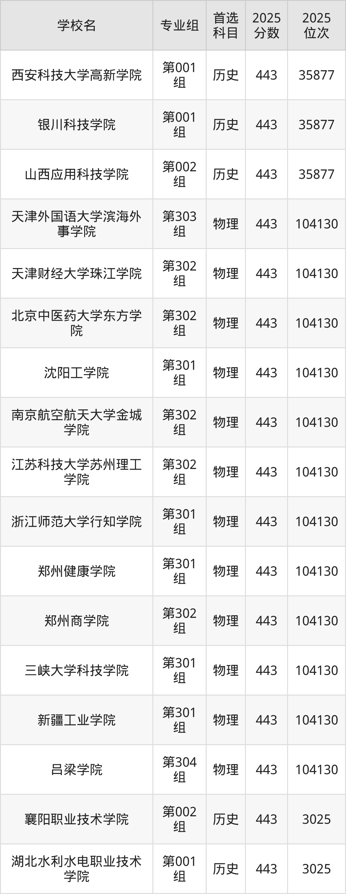 2025年在山西高考历史类录取分数线是443分的大学有北京金融科技学院、天津天狮学院、天津仁爱学院、大连工业大学艺术与信息工程学院、沈阳城市建设学院、长春光华学院、长春工业大学人文信息学院、黑龙江工商学院、上海杉达学院、南京传媒学院等。物理类录取分数线是443分的大学有天津外国语大学滨海外事学院、天津财经大学珠江学院、北京中医药大学东方学院、沈阳工学院、南京航空航天大学金城学院、江苏科技大学苏州理工学院、浙江师范大学行知学院、郑州健康学院、郑州商学院、三峡大学科技学院等。