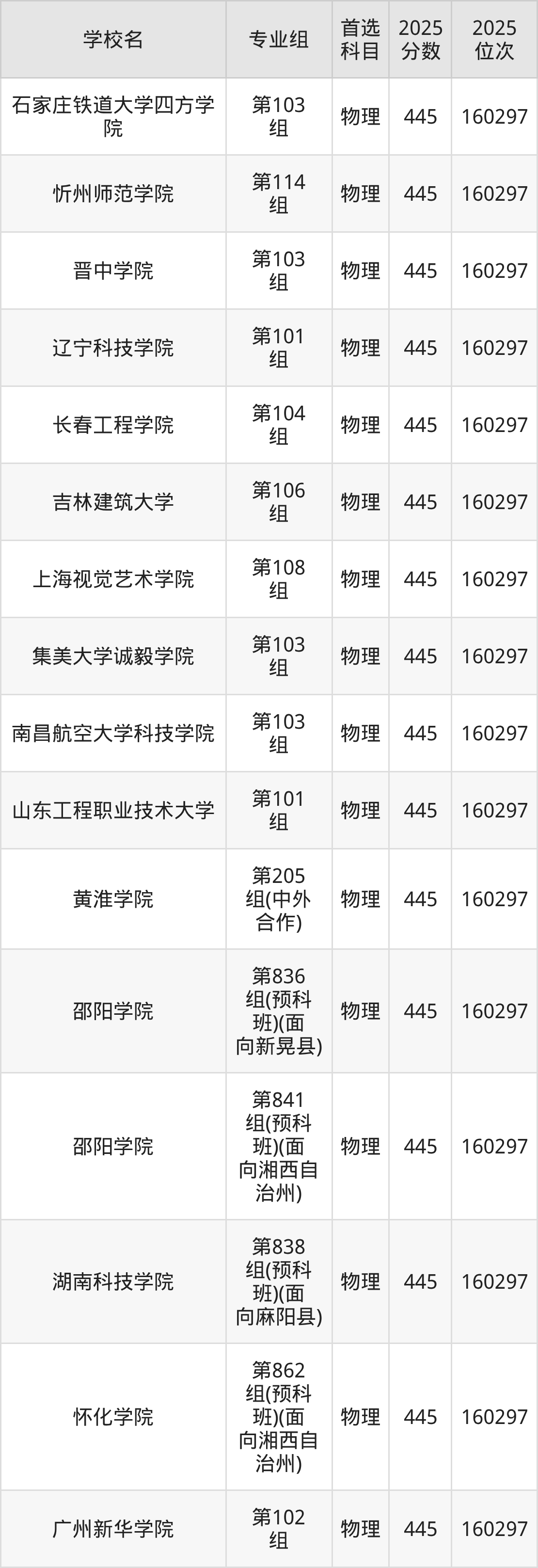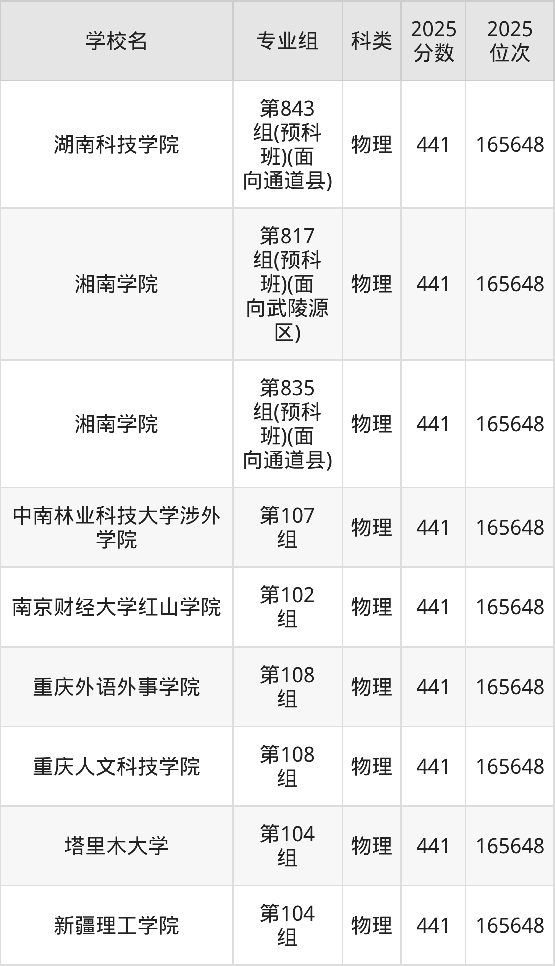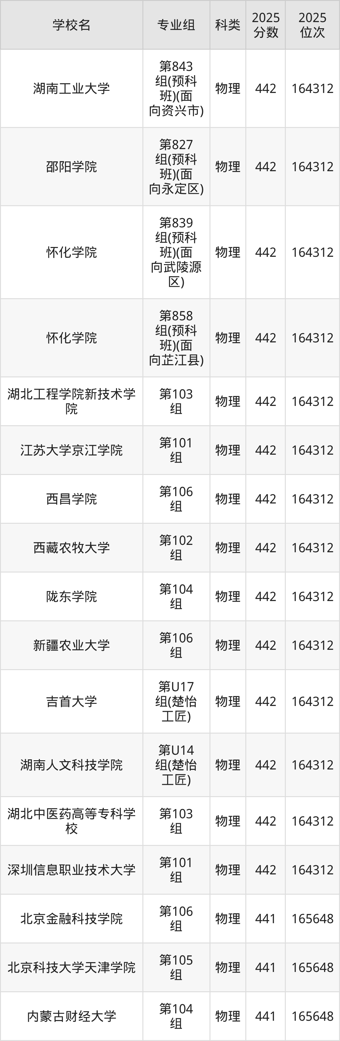 湖南物理类443分对应的位次排名是162957名,因此建议2026年位次排在这附近的考生考虑这些大学。
