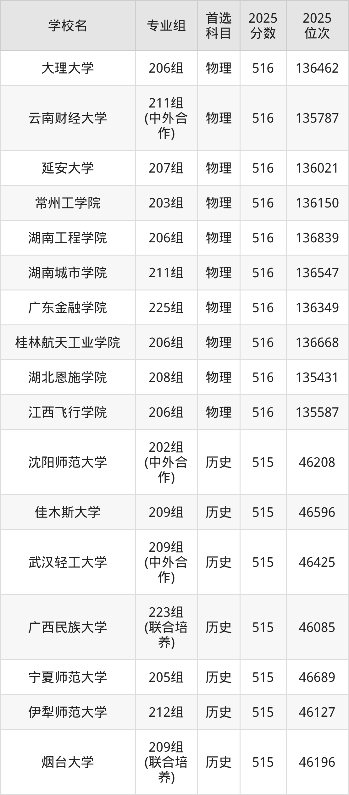 广东高考历史类516分对应的位次排名是45282名-45981名,物理类516分对应的位次排名是135202名-136866名,因此建议2026年位次排在这附近的同学考虑这些大学。