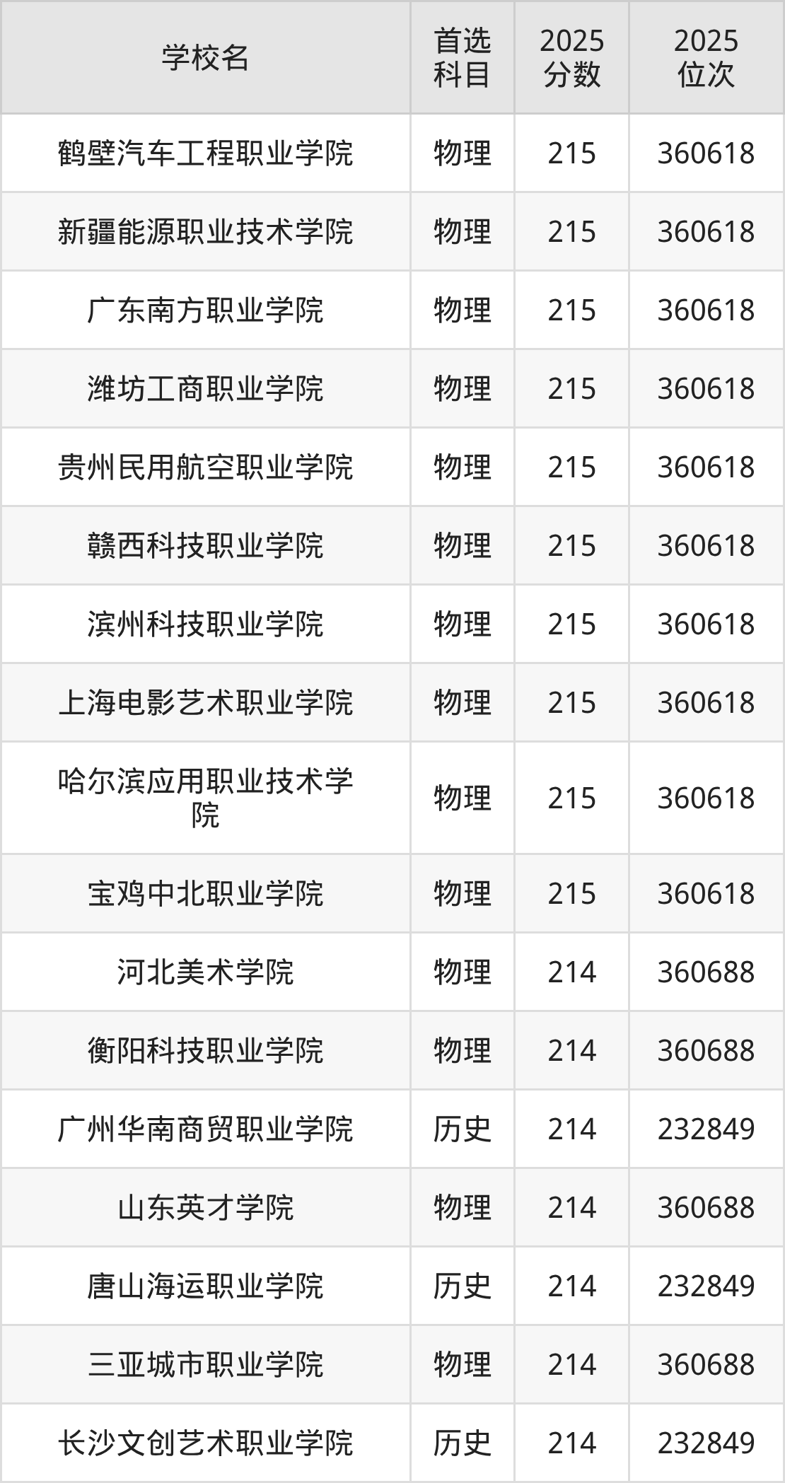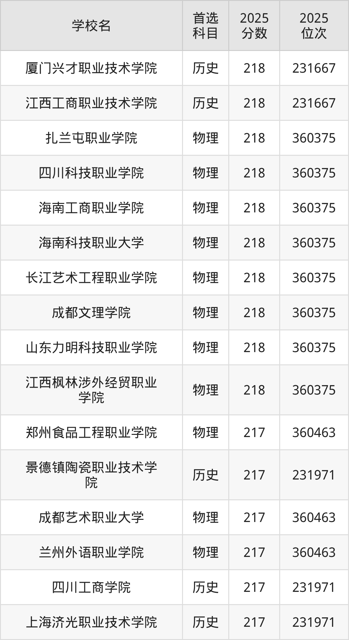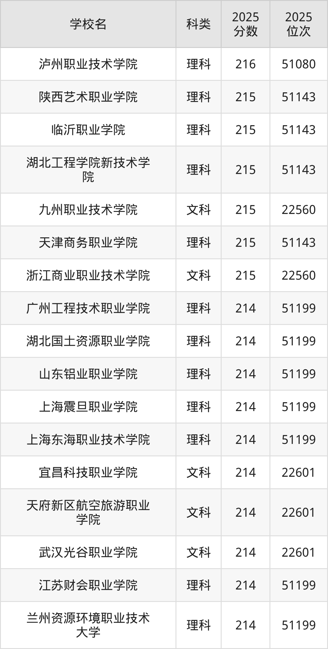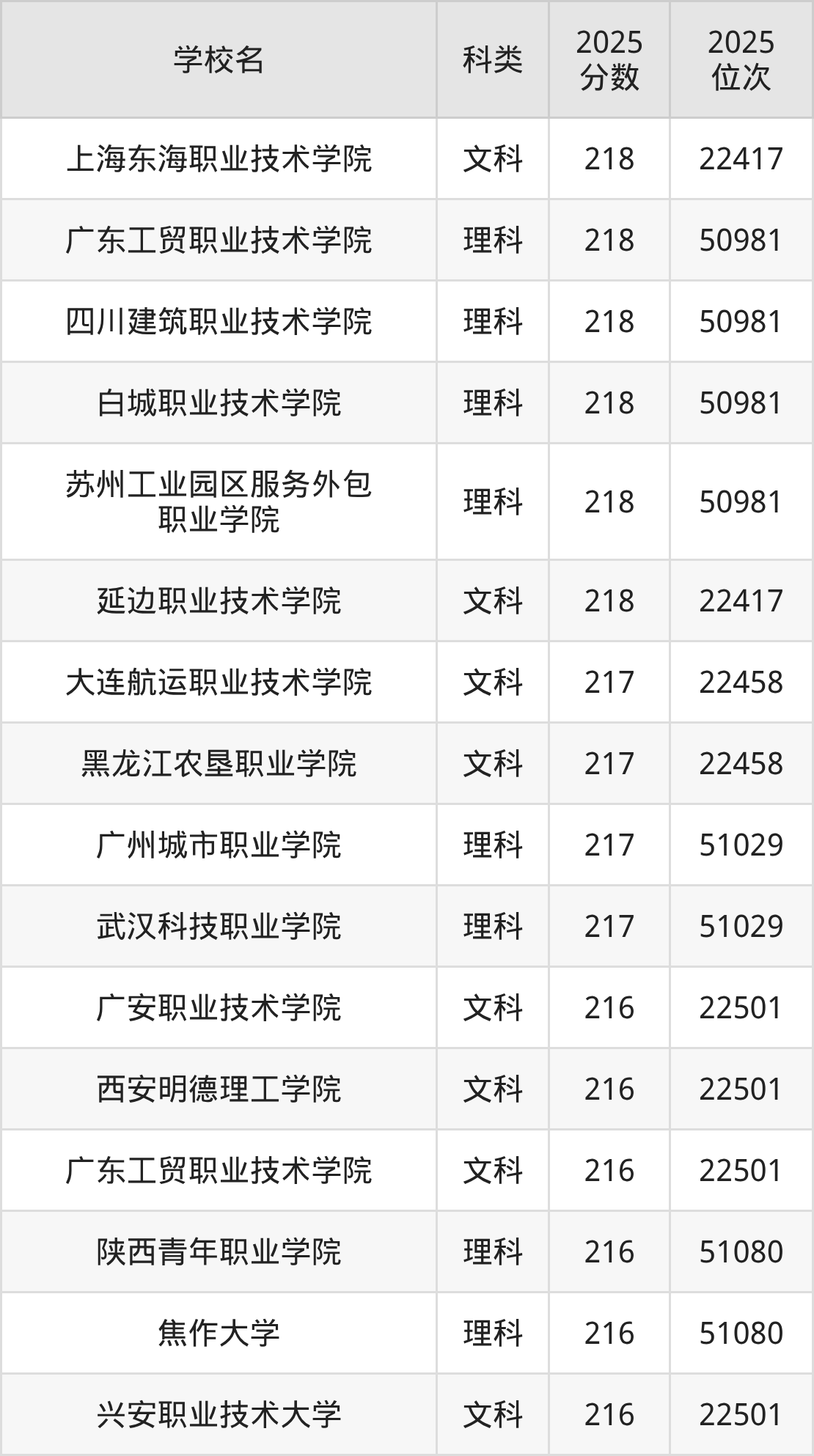 下面老师将以上文整理的其中两个省份为例,为大家具体展示216分左右能上的专科大学名单。