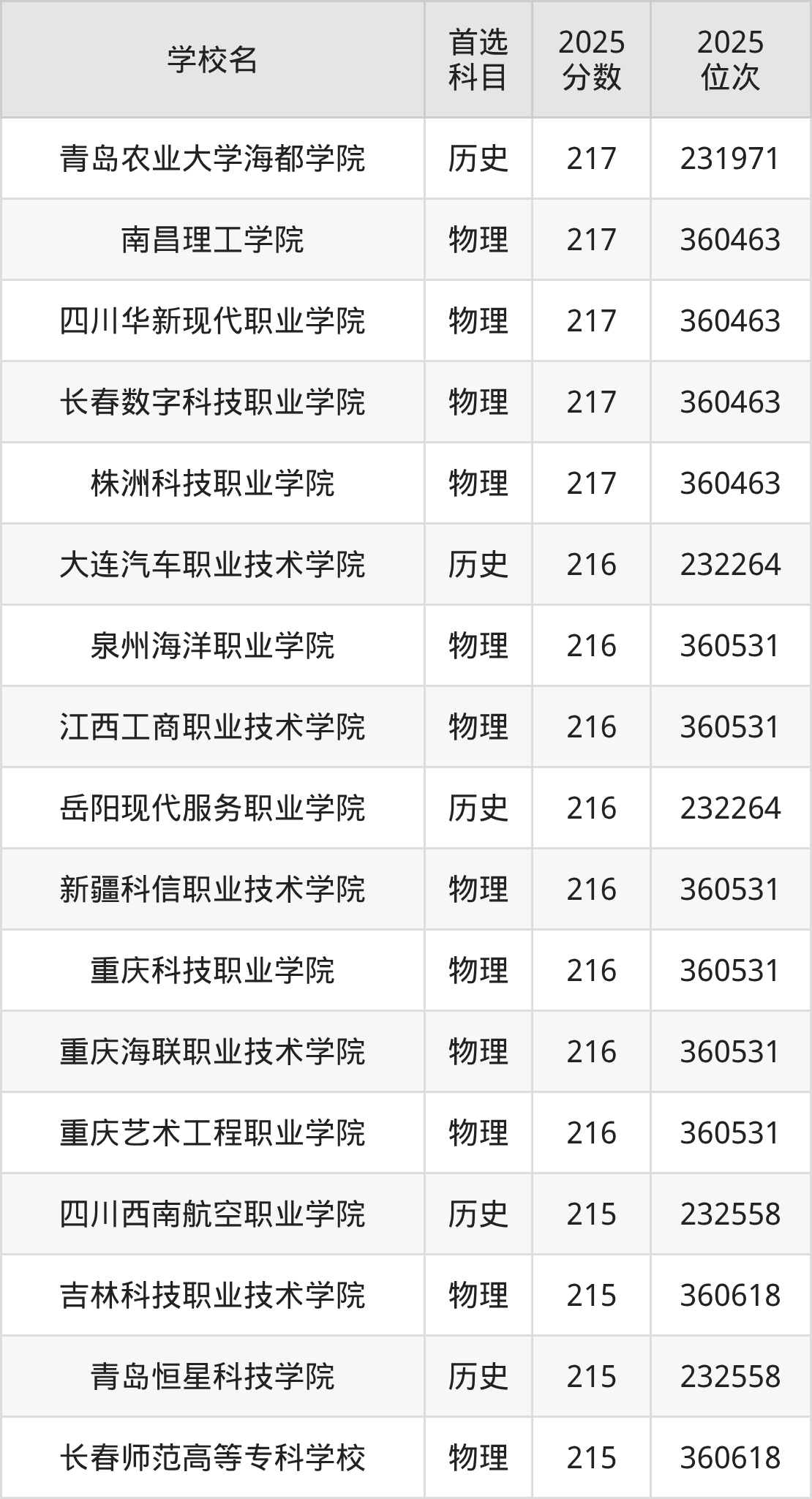 2025年在河北高考历史类录取分数线是216分的大学有大连汽车职业技术学院、岳阳现代服务职业学院。物理类录取分数线是216分的大学有泉州海洋职业学院、江西工商职业技术学院、新疆科信职业技术学院、重庆科技职业学院、重庆海联职业技术学院、重庆艺术工程职业学院。