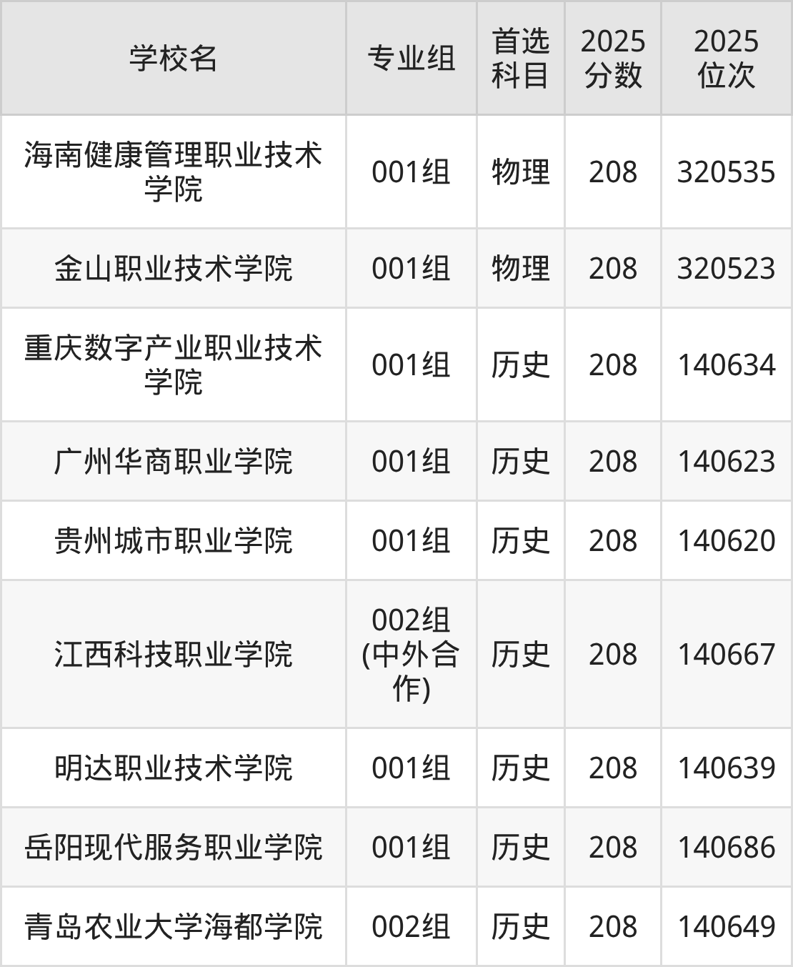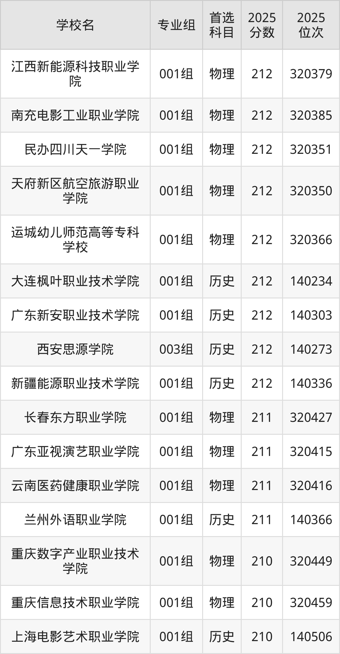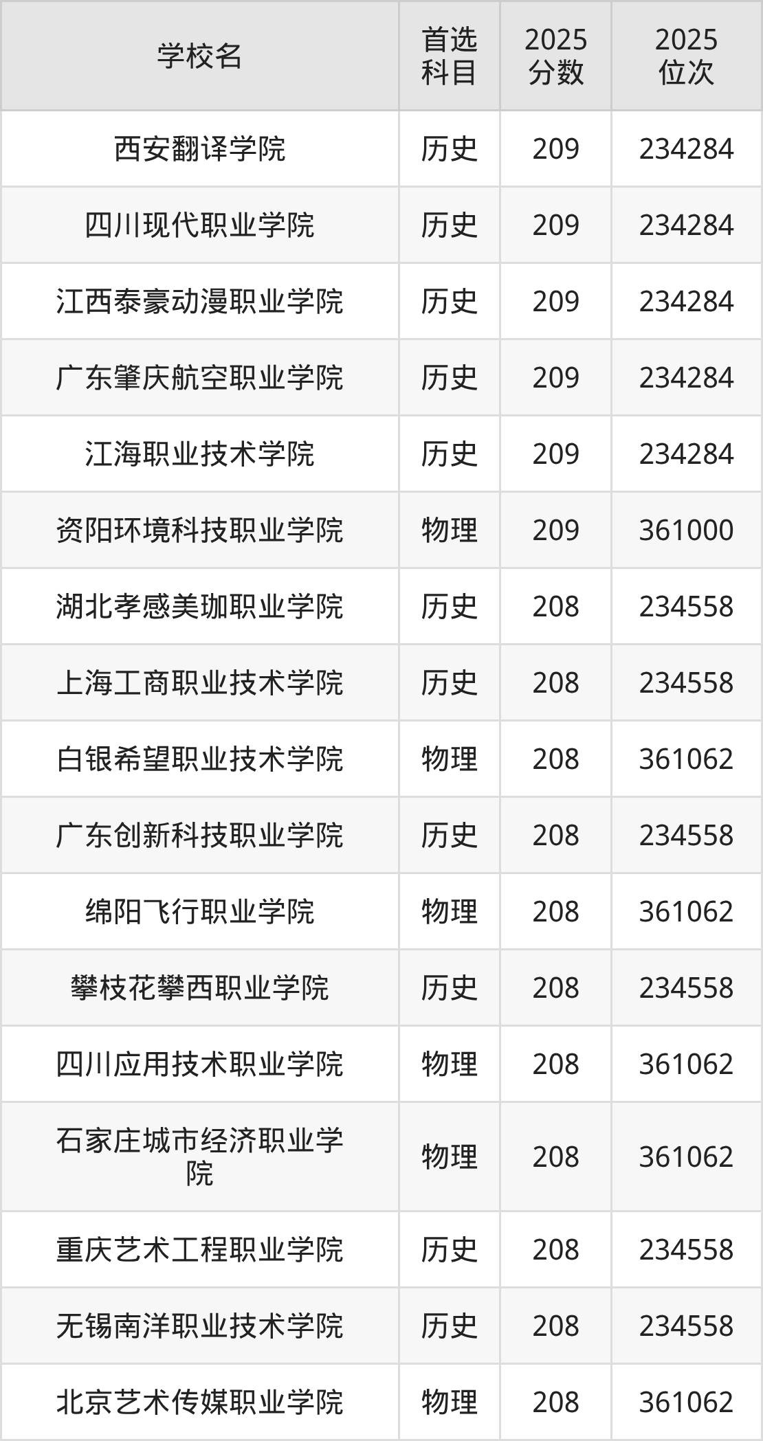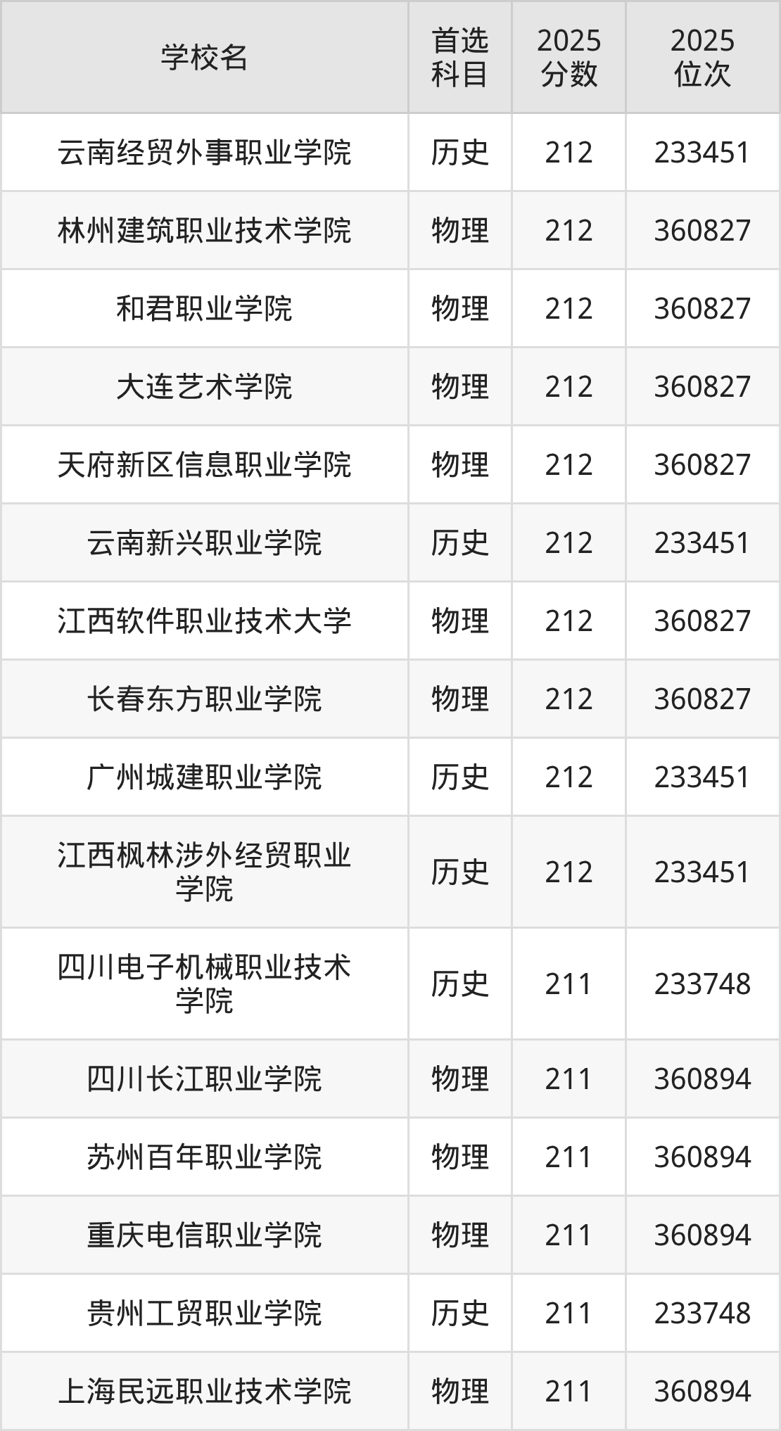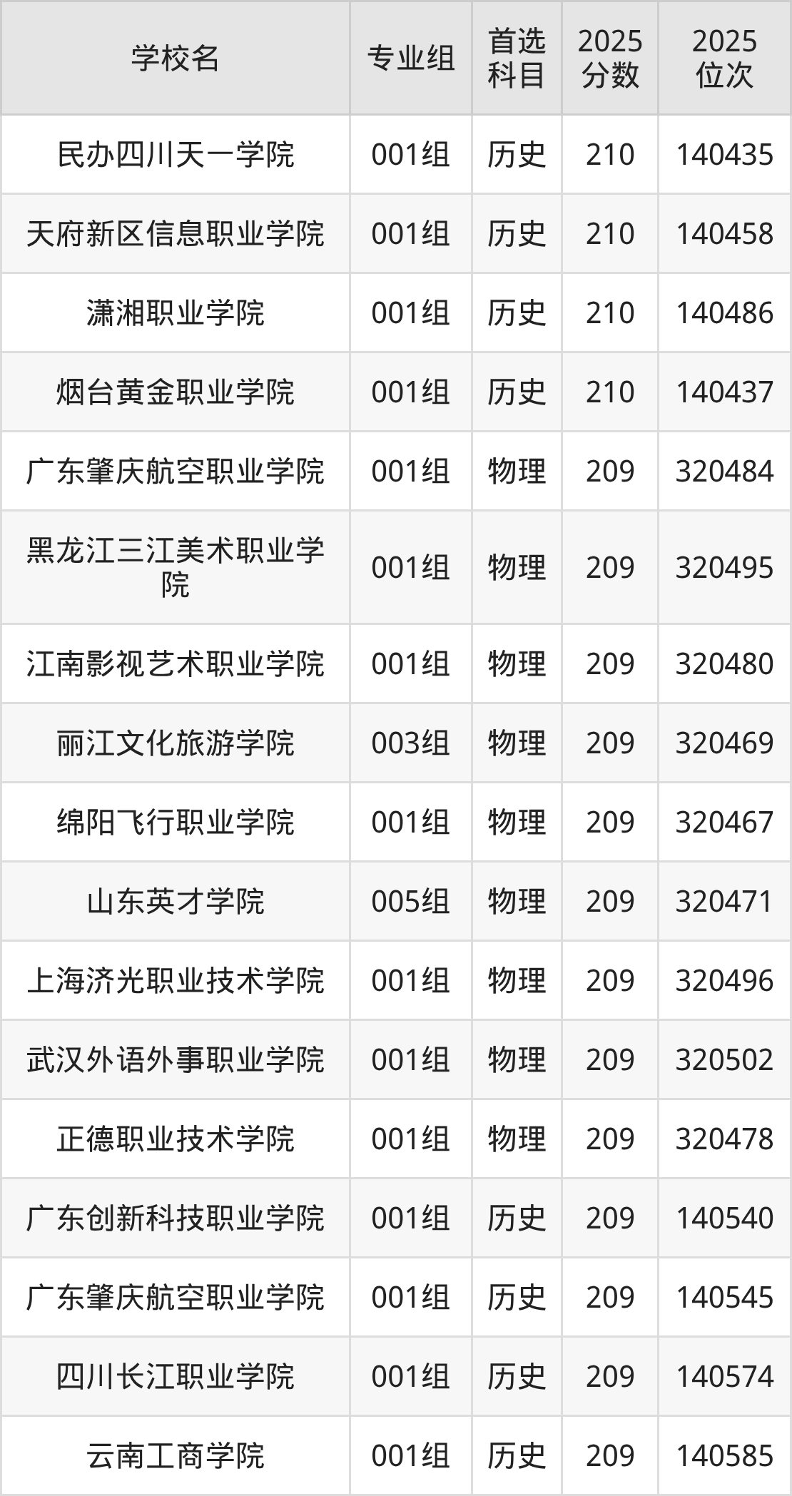 二、210分左右的专科大学排名